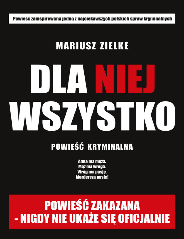 Mariusz Zielke DLA NIEJ WSZYSTKO powieść kryminalna Redakcja: zabroniono Korekta: niedozwolono Projekt okładki: Kamil W. na szybko (dzięki) Skład i łamanie: sam sobie złamałem Konwersja ebooka: prawdziwy przyjaciel (dzięki) Redaktor Prowadzący: Pani Ania (szkoda, że nie możemy tego dokończyć) Wydawca: był, mam nadzieję, że kiedy już wygram procesy sądowe, to znów będzie Wsparcie: Internet (bo warto walczyć o Sprawiedliwość i Wolność Słowa) Książka za darmo. Nie wolno jej sprzedawać. Wolno oceniać, krytykować, udostępniać, przesyłać, powielać, pisać o niej itd. Opis Ona, On i ten trzeci – manipulator i morderca. Jaką grę prowadzi? Dlaczego Oni stali się celem? Czy na pewno są bez winy? Kto przekroczy granicę, po której nie będzie już odwrotu? „Dla niej wszystko” to thriller zainspirowany jedną z najciekawszych spraw kryminalnych, jaka wydarzyła się w Polsce. Nic w niej nie jest oczywiste, a wiele zagadek pozostało nierozwiązanych. Powieść „Dla niej wszystko” miała być wydana w październiku 2016 r. przez mojego ulubionego, renomowanego wydawcę. Niestety zostałem zmuszony do zerwania z nim umowy. Nie mogę narażać go na wieloletnie procesy i inne zagrożenia. Dlatego udostępniam książkę za darmo w sieci. Mam nadzieję, że nie będą Wam przeszkadzały braki edytorskie i przeczytacie tę powieść z przyjemnością. Historia powstania „Dla niej wszystko” jest bardzo długa i ciekawa. Ale tak naprawdę można ją opisać kilkoma zdaniami. Były dziennikarz (to ja), po męczącym procesie z bogatym finansistą, dostaje od innego milionera intratną ofertę napisania POWIEŚCI o pewnym porwaniu. Gdy przez przypadek trafia na luźno związaną z nim sprawę wielkiej korupcji, lobbingu, mafijnych rozgrywek w służbach, a wreszcie serii morderstw i stawia w książce zupełnie fikcyjne (zmyślone) teorie na ten temat, nagle ktoś różnymi działaniami próbuje uniemożliwić mu wydanie powieści. Nie przypomina Wam to czegoś? Moja historia w dużej części jest niemal wyjęta z kart pierwszego tomu „Millennium” Stiega Larssona. Tyle że nie mam Lisbeth Salander :(. I nie jest to fikcja, tylko rzeczywistość. Proszę Was, przeczytajcie powieść. Jest za darmo. Nic nie kosztuje. Nie będziecie żałować. Zaznaczam jednocześnie bardzo wyraźnie: to powieść zainspirowana faktami, a nie prawdziwa historia. Ewentualna zbieżność ze zdarzeniami znanymi z mediów, prawdziwymi osobami czy firmami jest całkowicie przypadkowa i niezamierzona. To zwykły fikcyjny kryminał, bez żadnego klucza. Tym bardziej niezrozumiałe są dla mnie działania osób, próbujących tę książkę zniszczyć. O mnie Jestem byłym dziennikarzem i autorem ośmiu powieści (m.in. „Wyrok”, „Formacja trójkąta”, „Człowiek, który musiał umrzeć”, „Sędzia” - wydanych przez Czarną Owcę). Zawsze pracowałem dla ludzi. Zawsze stawałem po stronie słabszych i biedniejszych. Chciałem pomagać im walczyć ze złem, z systemem, korporacjami, gangami. Próbowano mnie przekupić milionowymi łapówkami, potem szantażowano, grożono, wreszcie wytaczano seriami procesy, chcąc wsadzić do więzienia i zastraszyć ogromnymi odszkodowaniami. Pokusy pokonałem, przeciwników też, wygrałem wszystkie procesy. Jednak najcięższa walka dopiero przede mną. Walka o książkę, którą możesz na razie przeczytać tylko w tej – elektronicznej, pozbawionej redakcji i korekty niedoskonałej wersji. Mam nadzieję, że kiedyś, w przyszłości trafi jednak do księgarń z właściwym przygotowaniem redakcyjnym i godną oprawą. Mariusz Zielke Prolog rok wcześniej [data: dawno i nieprawda (wpis początkowy, przypięty) - Co zrobisz, by mnie zdobyć? - Wszystko. - Obiecujesz? - Przysięgam. - Nie przysięgaj. - Dlaczego? - Z paleniem też przysięgałeś. - To nie to samo. - Więc teraz inaczej przysięgasz? - Inaczej. Na wszystko, co święte przysięgam. Na najświętsze. Dla ciebie... wszystko.] Powinna umrzeć wczoraj. Powinna już nie oddychać. Ale wciąż żyła. Nadal była mu potrzebna. Ciągle miała nadzieję. Złudną. Czuła, że już niedużo jej pozostało. Że w końcu mu się znudzi. Przestanie go zadowalać. Wtedy weźmie ten nóż i zrobi z niego użytek, jak już nieraz groził. Dziś lub jutro. Najdalej pojutrze, bo pojutrze musi wyjechać. Alibi. Tak jej powiedział. Musi zadbać o alibi. W przerwach, kiedy się nią nie bawi, kiedy jej nie krzywdzi, siedzi przed komputerem. Gra w grę. Śmieje się, klika myszką gwałtownie. Czasem się wkurzy. Wtedy przeklina. Ona nie lubi przeklinać. Ale słuchać musi. Jest przywiązana za ręce i nogi. Nie może się nawet podrapać. Nie wolno jej zasłaniać uszu. Ale może nie patrzeć. Zamknąć oczy może. Tylko że wtedy on grozi, że jej podklei powieki, żeby patrzyła. Nie śpij. Potrzebuję towarzystwa. Więc nie śpi. Patrzy jak on gra, a potem jak ogląda porno. Podchodzi i znów jej każe być grzeczną. Ona wtedy myśli o lesie za oknem. Piękny ten las, szumiący, pachnący, dziki. Zero cywilizacji. Tylko oni w tym lesie. Wstaje. Przeciąga się zadowolony. Drapie wulgarnie. Chamski się staje, nie dba o pozory. Taki niby przystojny, taki gładki i wspaniały. Patrzy na nóż. Nie, jeszcze nie. Jeszcze nie dziś. A potem znów siada do komputera i przegląda strony. Na fejsa wchodzi. Klika w zdjęcia i patrzy na inną kobietę. Znacznie starszą i wcale do niej niepodobną. Ciemnowłosą, o zielonych oczach. Czasem do niej mówi. Mówi, jak do kolejnej ofiary. Co on w tobie widzi, Anno - mówi. Część pierwsza Przed Kwiecień-czerwiec Rozdział 1 [27 kwietnia, czwartek, rano Brr, już mi zimno. Pogoda się poprawiła, ale na długi weekend zapowiadają ochłodzenie. Dla mnie pewnie bez znaczenia. Anafranil nie pomaga, choć może bez niego byłoby jeszcze gorzej. Trzęsę się pewnie i z gniewu. Wszystko siedzi w głowie, wiem. W głowie. To prawda. Ale j
