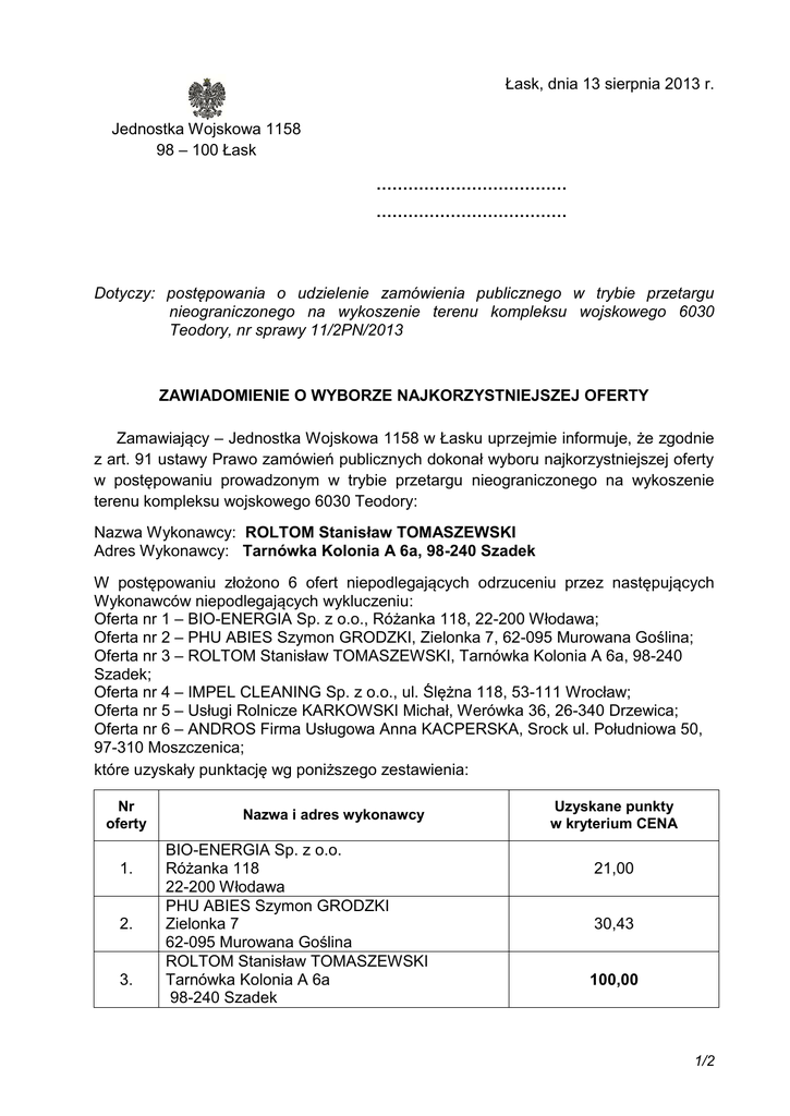 Łask, dnia 13 sierpnia 2013 r. Jednostka Wojskowa 1158 98 – 100 Łask ……………………………… ……………………………… Dotyczy: postępowania o udzielenie zamówienia publicznego w trybie przetargu nieograniczonego na wykoszenie terenu kompleksu wojskowego 6030 Teodory, nr sprawy 11/2PN/2013 ZAWIADOMIENIE O WYBORZE NAJKORZYSTNIEJSZEJ OFERTY Zamawiający – Jednostka Wojskowa 1158 w Łasku uprzejmie informuje, że zgodnie z art. 91 ustawy Prawo zamówień publicznych dokonał wyboru najkorzystniejszej oferty w postępowaniu prowadzonym w trybie przetargu nieograniczonego na wykoszenie terenu kompleksu wojskowego 6030 Teodory: Nazwa Wykonawcy: ROLTOM Stanisław TOMASZEWSKI Adres Wykonawcy: Tarnówka Kolonia A 6a, 98-240 Szadek W postępowaniu złożono 6 ofert niepodlegających odrzuceniu przez następujących Wykonawców niepodlegających wykluczeniu: Oferta nr 1 – BIO-ENERGIA Sp. z o.o., Różanka 118, 22-200 Włodawa; Oferta nr 2 – PHU ABIES Szymon GRODZKI, Zielonka 7, 62-095 Murowana Goślina; Oferta nr 3 – ROLTOM Stanisław TOMASZEWSKI, Tarnówka Kolonia A 6a, 98-240 Szadek; Oferta nr 4 – IMPEL CLEANING Sp. z o.o., ul. Ślężna 118, 53-111 Wrocław; Oferta nr 5 – Usługi Rolnicze KARKOWSKI Michał, Werówka 36, 26-340 Drzewica; Oferta nr 6 – ANDROS Firma Usługowa Anna KACPERSKA, Srock ul. Południowa 50, 97-310 Moszczenica; które uzyskały punktację wg poniższego zestawienia: Nr oferty 1. 2. 3. Nazwa i adres wykonawcy BIO-ENERGIA Sp. z o.o. Różanka 118 22-200 Włodawa PHU ABIES Szymon GRODZKI Zielonka 7 62-095 Murowana Goślina ROLTOM Stanisław TOMASZEWSKI Tarnówka Kolonia A 6a 98-240 Szadek Uzyskane punkty w kryterium CENA 21,00 30,43 100,00 1/2 Nr oferty 4. 5. 6. Nazwa i adres wykonawcy IMPEL CLEANING Sp. z o.o. ul. Ślężna 118 53-111 Wrocław Usługi Rolnicze KARKOWSKI Michał Werówka 36 26-340 Drzewica ANDROS Firma Usługowa Anna KACPERSKA Srock ul. Południowa 50 97-310 Moszczenica Uzyskane punkty w kryterium CENA 84,00 77,00 52,50 Jednocześnie Zamawiający informuje, iż zgodnie z wyborem najkorzystniejszej oferty zawrze umowę z Wykonawcą, którego oferta była najkorzystniejsza w postępowaniu o udzielenie zamówienia publicznego na wykoszenie terenu kompleksu wojskowego 6030 Teodory. Zgodnie z art. 94 ust. 1 termin po upływie którego umowa w sprawie zamówienia publicznego może być zawarta to: 18.08.2013 r. DOWÓDCA (-) wz. ppłk mgr inż. Zbigniew ROSIAK 2/2