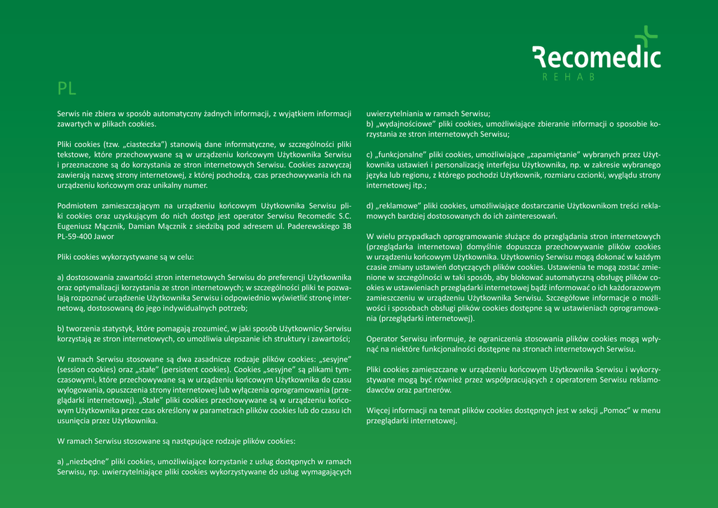 PL Serwis nie zbiera w sposób automatyczny żadnych informacji, z wyjątkiem informacji zawartych w plikach cookies. Pliki cookies (tzw. „ciasteczka”) stanowią dane informatyczne, w szczególności pliki tekstowe, które przechowywane są w urządzeniu końcowym Użytkownika Serwisu i przeznaczone są do korzystania ze stron internetowych Serwisu. Cookies zazwyczaj zawierają nazwę strony internetowej, z której pochodzą, czas przechowywania ich na urządzeniu końcowym oraz unikalny numer. Podmiotem zamieszczającym na urządzeniu końcowym Użytkownika Serwisu pliki cookies oraz uzyskującym do nich dostęp jest operator Serwisu Recomedic S.C. Eugeniusz Mącznik, Damian Mącznik z siedzibą pod adresem ul. Paderewskiego 3B PL-59-400 Jawor Pliki cookies wykorzystywane są w celu: a) dostosowania zawartości stron internetowych Serwisu do preferencji Użytkownika oraz optymalizacji korzystania ze stron internetowych; w szczególności pliki te pozwalają rozpoznać urządzenie Użytkownika Serwisu i odpowiednio wyświetlić stronę internetową, dostosowaną do jego indywidualnych potrzeb; b) tworzenia statystyk, które pomagają zrozumieć, w jaki sposób Użytkownicy Serwisu korzystają ze stron internetowych, co umożliwia ulepszanie ich struktury i zawartości; W ramach Serwisu stosowane są dwa zasadnicze rodzaje plików cookies: „sesyjne” (session cookies) oraz „stałe” (persistent cookies). Cookies „sesyjne” są plikami tymczasowymi, które przechowywane są w urządzeniu końcowym Użytkownika do czasu wylogowania, opuszczenia strony internetowej lub wyłączenia oprogramowania (przeglądarki internetowej). „Stałe” pliki cookies przechowywane są w urządzeniu końcowym Użytkownika przez czas określony w parametrach plików cookies lub do czasu ich usunięcia przez Użytkownika. W ramach Serwisu stosowane są następujące rodzaje plików cookies: a) „niezbędne” pliki cookies, umożliwiające korzystanie z usług dostępnych w ramach Serwisu, np. uwierzytelniające pliki cookies wykorzystywane do usług wymagających uwierzytelniania w ramach Serwisu; b) „wydajnościowe” pliki cookies, umożliwiające zbieranie informacji o sposobie korzystania ze stron internetowych Serwisu; c) „funkcjonalne” pliki cookies, umożliwiające „zapamiętanie” wybranych przez Użytkownika ustawień i personalizację interfejsu Użytkownika, np. w zakresie wybranego języka lub regionu, z którego pochodzi Użytkownik, rozmiaru czcionki, wyglądu strony internetowej itp.; d) „reklamowe” pliki cookies, umożliwiające dostarczanie Użytkownikom treści reklamowych bardziej dostosowanych do ich zainteresowań. W wielu przypadkach oprogramowanie służące do przeglądania stron internetowych (przeglądarka internetowa) domyślnie dopuszcza przechowywanie plików cookies w urządzeniu końcowym Użytkownika. Użytkownicy Serwisu mogą dokonać w każdym czasie zmiany ustawień dotyczących plików cookies. Ustawienia te mogą zostać zmienione w szczególności w taki sposób, aby blokować automatyczną obsługę plików cookies w ustawieniach przeglądarki internetowej bądź informować o ich każdorazowym zamieszczeniu w urządzeniu Użytkownika Serwisu. Szczegółowe informacje o możliwości i sposobach obsługi plików cookies dostępne są w ustawieniach oprogramowania (przeglądarki internetowej). Operator Serwisu informuje, że ograniczenia stosowania plików cookies mogą wpłynąć na niektóre funkcjonalności dostępne na stronach internetowych Serwisu. Pliki cookies zamieszczane w urządzeniu końcowym Użytkownika Serwisu i wykorzystywane mogą być również przez współpracujących z operatorem Serwisu reklamodawców oraz partnerów. Więcej informacji na temat plików cookies dostępnych jest w sekcji „Pomoc” w menu przeglądarki internetowej.