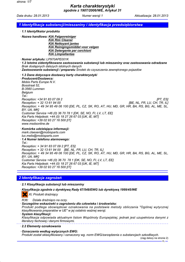 36.0.2 strona: 1/7 Karta charakterystyki zgodnie z 1907/2006/WE, Artykuł 31 Data druku: 28.01.2013 Numer wersji 1 Aktualizacja: 28.01.2013 1 Identyfikacja substancji/mieszaniny i identyfikacja przedsiębiorstwa · 1.1 Identyfikator produktu · Nazwa handlowa: KIA Felgenreiniger KIA Rim Cleaner KIA Nettoyant jantes KIA Reinigingsmiddel voor velgen KIA Detergente per cerchioni KIA Limpiallantas · Numer artykułu: LP970APE001K · 1.2 Istotne zidentyfikowane zastosowania substancji lub mieszaniny oraz zastosowania odradzane Brak dostępnych dalszych istotnych danych · Zastosowanie substancji / preparatu Środek do czyszczenia zewnętrznego pojazdów · 1.3 Dane dotyczące dostawcy karty charakterystyki · Producent/Dostawca: Mobis Parts Europe N.V. Bosstraat 52, B-3560 Lummen Belgium Tel.: Reception: +34 91 83 07 09 2 [PT, ES] Reception: + 32 13 61 94 00 [BE, NL, FR, LU, CH, TR, IL] Reception: + 49 34 95 49 06 100 [DE, PL, CZ, SK, RO, AT, HU, MD, GR, HR, BA, RS, BG, AL, ME, SL, BY, UA, MK] Customer Service +46 (0) 36 70 78 1 [DK, SE, NO, FI, LV, LT, EE] Kia Parts Helpdesk: +44 (0) 18 27 26 67 03 [UK, IE, MT] Reception: +39 02 93 27 16 500 [IT] www.msdsonline.de · Komórka udzielająca informacji: [email protected] [email protected] · 1.4 Numer telefonu alarmowego: Tel.: Reception: + 34 91 83 07 09 2 [PT, ES] Reception: + 32 13 61 94 00 [BE, NL, FR, LU, CH, TR, IL] Reception: + 49 34 95 49 06 100 [DE, PL, CZ, SK, RO, AT, HU, MD, GR, HR, BA, RS, BG, AL, ME, SL, BY, UA, MK] Customer Service +46 (0) 36 70 78 1 [DK, SE, NO, FI, LV, LT, EE] Kia Parts Helpdesk: +44 (0) 18 27 26 67 03 [UK, IE, MT] Reception: +39 02 93 27 16 500 [IT] 2 Identyfikacja zagrożeń · 2.1 Klasyfikacja substancji lub mieszaniny · Klasyfikacja zgodnie z dyrektywą Rady 67/548/EWG lub dyrektywą 1999/45/WE Xi; Produkt drażniący R36: Działa drażniąco na oczy. · Szczególne wskazówki o zagrożeniu dla człowieka i środowiska: Produkt podlega obowiązkowi oznakowania na podstawie metody obliczania "Ogólnej wytycznej klasyfikowania preparatów w UE" w jej ostatnio ważnej wersji. · System klasyfikacji: Klasyfikacja odpowiada aktualnym listom Wspólnoty Europejskiej, jednak jest uzupełniona danymi z literatury fachowej i danymi firmowymi. · 2.2 Elementy oznakowania · Oznaczenia według wytycznych EWG: Produkt został sklasyfikowany i oznaczony wg. norm EWG/zarządzenia o substancjach szkodliwych. (ciąg dalszy na stronie 2) PL 36.0.2 strona: 2/7 Karta charakterystyki zgodnie z 1907/2006/WE, Artykuł 31 Data druku: 28.01.2013 Numer wersji 1 Aktualizacja: 28.01.2013 Nazwa handlowa: KIA Felgenreiniger KIA Rim Cleaner KIA Nettoyant jantes KIA Reinigingsmiddel voor velgen KIA Detergente per cerchioni KIA Limpiallantas (ciąg dalszy od strony 1) · Litera w oznaczeniu i określenie niebezpieczeństwa produktu: Xi Produkt drażniący · Zestawy R: 36 Działa drażniąco na oczy. · Zestawy S: 2 Chronić przed dziećmi. 25 Unikać zanieczyszczenia oczu. 26 Zanieczyszczone oczy przemyć natychmiast dużą ilością wody i zasięgnąć porady lekarza. 46 W razie połknięcia niezwłocznie zasięgnij porady lekarza - pokaż opakowanie lub etykietę. 56 Zużyty produkt oraz opakowanie dostarczyć na składowisko odpadów niebezpiecznych. · 2.3 Inne zagrożenia · Wyniki oceny właściwości PBT i vPvB · PBT: Nie nadający się do zastosowania. · vPvB: Nie nadający się do zastosowania. 3 Skład/informacja o składnikach · 3.2 Charakterystyka chemiczna: Mieszaniny · Opis: Mieszanka z niżej wymienionych składników z bezpiecznymi domieszkami. · Składniki niebezpieczne: CAS: 7320-34-5 tetrapotassium pyrophosphate Xi R36 EINECS: 230-785-7 Eye Irrit. 2, H319 CAS: 15763-76-5 sodium cumenesulphonate Xi R36 EINECS: 239-854-6 Eye Irrit. 2, H319 CAS: 14171-00-7 N-Alkylaminosäuretriethanolammoniumsalz EINECS: 238-015-1 Xi R38-41 Eye Dam. 1, H318; Skin Irrit. 2, H315 CAS: 111-76-2 2-butoksyetanol Xn R20/21/22; Xi R36/38 EINECS: 203-905-0 Acute Tox. 4, H302; Acute Tox. 4, H312; Acute Tox. 4, H332; Skin Irrit. 2, H315; Eye Irrit. 2, H319 · Wskazówki dodatkowe: Pełna treść przytoczonych wskazówek dotyczących zagrożeń znajduje się w rozdziale 16. 10-25% 2,5-5% 1-2,5% 1-2,5% 4 Środki pierwszej pomocy · 4.1 Opis środków pierwszej pomocy · Po wdychaniu: Dostarczyć świeże powietrze, w razie dolegliwości wezwać lekarza. · Po styczności ze skórą: Ogólnie produkt nie działa drażniąco na skórę. · Po styczności z okiem: Płukać oczy z otwartą powieką przez kilka minut pod bieżącą wodą. W przypadku utrzymującej się dolegliwości zasięgnąć porady lekarza. · Po przełknięciu: Przy trwałych dolegliwościach porozumieć się z lekarzem. (ciąg dalszy na stronie 3) PL 36.0.2 strona: 3/7 Karta charakterystyki zgodnie z 1907/2006/WE, Artykuł 31 Data druku: 28.01.2013 Numer wersji 1 Aktualizacja: 28.01.2013 Nazwa handlowa: KIA Felgenreiniger KIA Rim Cleaner KIA Nettoyant jantes KIA Reinigingsmiddel voor velgen KIA Detergente per cerchioni KIA Limpiallantas (ciąg dalszy od strony 2) · 4.2 Najważniejsze ostre i opóźnione objawy oraz skutki narażenia Brak dostępnych dalszych istotnych danych · 4.3 Wskazania dotyczące wszelkiej natychmiastowej pomocy lekarskiej i szczególnego postępowania z poszkodowanym Brak dostępnych dalszych istotnych danych 5 Postępowanie w przypadku pożaru · 5.1 Środki gaśnicze · Przydatne środki gaśnicze: CO2, proszek gaśniczy lub strumień wody. Większy pożar zwalczać strumieniem wody lub pianą odporną na działanie alkoholu. · 5.2 Szczególne zagrożenia związane z substancją lub mieszaniną Brak dostępnych dalszych istotnych danych · 5.3 Informacje dla straży pożarnej · Specjalne wyposażenie ochronne: Środki specjalne nie są konieczne. 6 Postępowanie w przypadku niezamierzonego uwolnienia do środowiska · 6.1 Indywidualne środki ostrożności, wyposażenie ochronne i procedury w sytuacjach awaryjnych Nie konieczne. · 6.2 Środki ostro