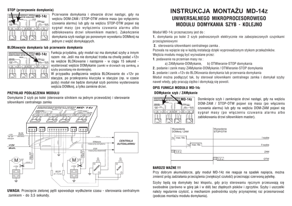 OTW I szyba wy zielony II szyba max. 20A bezp. M STOP masa przy otwieraniu I szyba II szyba 1s max.18s ZAM 0,8 3,5 s 0,8 3,5 s +U ER +12V M A BEZP. 3 : 7,5 A Wyzwolenie STOP/OTW 1s max.18s CENTRALA AUTOALARMU AV E ar m DOMykanie masa przy zamykaniu SL br¹zowy czarny bia³y po pomarañczowy c añ ST niebieski ró¿owy zo zielony +12V +U ny r wo cze niebieski M owy ñcz ara pom max. 20A bezp. +12V akum. pomarañczowy ¿ó³to-zielony ZAM Z£. Domkniêcie szyb i zamkniêcie drzwi nast¹pi, gdy na wejœciu DOM-ZAM / STOP-OTW pojawi siê masa (po w³¹czeniu czuwania alarmu) lub gdy na wejœciu DOM-ZAM pojawi siê sygna³ masy (po w³¹czeniu czuwania alarmu albo zablokowaniu drzwi si³ownikiem master). Wyzwolenie DOMknij / ZAM BLOK owanie +12V np. po stacyjce OTW Z£. fioletowy rañ. ny zielo II szyba ZAM Z£¥CZE Z£. ZAM ¿ó³to+ BLOK zielony owanie zielony pomarañ. br¹z pom a ny Z£. BLOK +owanie Z£. DOMykanie pomarañ. ZAM ¿ó³tozielony fioleto wy zielo OTW DOMykanie Z£. bia³y STOP MD-14z AKUM (+12V) MASA DOM-ZAM STOP-OTW ? br¹zowy MD-14z owy y wy pom niebi pom a eski rañ. wy I szyba arañ . Z£¥CZE Z£. fioleto eski niebi pom a rañ. Z£. fioleto OTW AKUM (+12V) czer ró¿o bia³y STOP czarn wy DOM-ZAM STOP-OTW ? wony MASA fioleto wy MIKROPROCESOROWY MODU£ DOMYKANIA SZYB KOLEJNO MIKROPROCESOROWY MODU£ DOMYKANIA SZYB KOLEJNO fioletowy PRZYK£AD POD£¥CZENIA MODU£U Domykanie 2 szyb po kolei (sterowanie silnikiem na jednym przewodzie) i sterowanie si³ownikami centralnego zamka OPIS FUNKCJI MODU£U MD-14Z DOMykanie szyb / ZAMykanie pomarañ. W przypadku pod³¹czenia wejœcia BLOKowanie do +12v po stacyjce, po przekrêceniu kluczyka w stacyjce (np. w czasie jazdy) modu³ nie bêdzie domyka³ szyb pomimo wysterowania wejœcia DOMknij, a tylko zamknie drzwi. II szyba ZAM czarny szyby pozostan¹ nie domkniête). fioletowy zielony pomarañ. fioletowy pomarañ. OTW zielony br¹zowy ZAM ¿ó³toBLOK zielony owanie fioletowy DOMykanie ró¿owy I szyba czerwony czarny pomarañ. fioletowy niebieski pomarañ. OTW fioletowy ró¿owy STOP niebieski bia³y fioletowy AKUM (+12V) MASA DOM-ZAM STOP-OTW ? niebieski BLOKowanie domykania lub przerwanie domykania MIKROPROCESOROWY MODU£ Funkcja przydatna, gdy modu³ raz ma domykaæ szyby a innym DOMYKANIA SZYB KOLEJNO MD-14z razem nie. Jeœli ma nie domykaæ trzeba na chwilê podaæ +12v na wejœcie BLOKowanie i nastêpnie - w ci¹gu 15 sekund + wysterowaæ wejœcie DOMykanie (zamki w drzwiach siê zamkn¹, a Z£¥CZE Z£. Z£. Z£. Z£. pomarañ. II szyba ZAM Modu³ MD-14Z przeznaczony jest do : 1. domykania po kolei 2 szyb podnoszonych elektrycznie nie zabezpieczonych czujnikami przeci¹¿eniowymi 2. sterowania si³ownikami centralnego zamka . Pozwala na wpiêcie siê w ka¿d¹ instalacjê dziêki wyprowadzonym stykom przekaŸników. Wejœcia modu³u mog¹ byæ wyzwalane przez: 1. podawanie na przemian masy na : a) ZAMykanie-DOMykanie, b) OTWieranie-STOP domykania 2. podanie i zanik masy ZAMykanie-DOMykanie / OTWieranie-STOP domykania 3. podanie i zanik +12v do BLOKowania domykania lub przerwania domykania Modu³ mo¿na pod³¹czyæ tak, by sterowa³ si³ownikami centralnego zamka i domyka³ szyby nawet wtedy, gdy pracuj¹ ciê¿ko i domykaj¹ siê powoli. niebieski zielony pomarañ. zielony fioletowy ZAM ¿ó³toBLOK zielony owanie fioletowy pomarañ. OTW UNIWERSALNEGO MIKROPROCESOROWEGO MODU£U DOMYKANIA SZYB - KOLEJNO DOMykanie br¹zowy czerwony czarny I szyba fioletowy ró¿owy pomarañ. fioletowy niebieski pomarañ. OTW niebieski bia³y STOP zielony AKUM (+12V) MASA DOM-ZAM STOP-OTW ? INSTRUKCJA MONTA¯U MD-14Z czerwony STOP (przerywanie domykania) Przerwanie domykania i otwarcie drzwi nast¹pi, gdy na MIKROPROCESOROWY MODU£ DOMYKANIA SZYB KOLEJNO MD-14z wejœciu DOM-ZAM / STOP-OTW zniknie masa (po wy³¹czeniu czuwania alarmu) lub gdy na wejœciu STOP-OTW pojawi siê + sygna³ masy (po wy³¹czeniu czuwania alarmu albo Z£¥CZE Z£. Z£. Z£. Z£. odblokowaniu drzwi si³ownikiem master). Zakoñczenie domykania szyb nast¹pi po ponownym wywo³aniu DOMknij na jednym z wejœæ domykaj¹cych. UWAGA: Przeciêcie zielonej pêtli spowoduje wyd³u¿enie czasu - sterowania centralnym zamkiem - do 3,5 sekundy. OTW BARDZO WA¯NE !!! Przy dobrym akumulatorze, gdy modu³ MD-14z nie reaguje na spadek napiêcia, mo¿na zmieniæ próg zadzia³ania przeci¹¿enia (zwiêkszyæ czu³oœæ) przecinaj¹c czerwon¹ pêtelkê. Szyby bêd¹ siê domyka³y bez k³opotu, gdy przy sterowaniu rêcznym przesuwaj¹ siê swobodnie (zarówno w górê jak i w dó³) bez zbêdnych pisków i zgrzytów. Szyby i uszczelki nale¿y regularnie czyœciæ, a mechanizm podnoœnika szyby przynajmniej raz przesmarowaæ (podczas monta¿u modu³u domykania).
