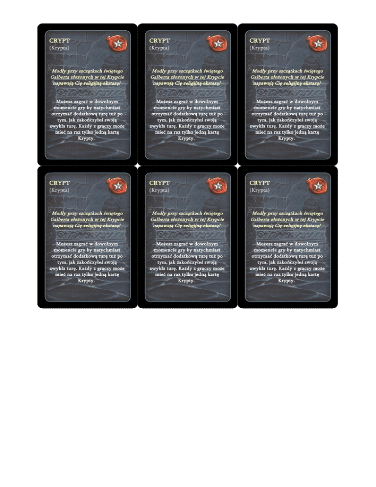 CRYPT CRYPT CRYPT (Krypta) (Krypta) (Krypta) Modły przy szczątkach świętego Galberta złożonych w tej Krypcie napawają Cię religijną ekstazą! Modły przy szczątkach świętego Galberta złożonych w tej Krypcie napawają Cię religijną ekstazą! Modły przy szczątkach świętego Galberta złożonych w tej Krypcie napawają Cię religijną ekstazą! Możesz zagrać w dowolnym momencie gry by natychmiast otrzymać dodatkową turę tuż po tym, jak zakończyłeś swoją zwykła turę. Każdy z graczy może mieć na raz tylko jedną kartę Krypty. Możesz zagrać w dowolnym momencie gry by natychmiast otrzymać dodatkową turę tuż po tym, jak zakończyłeś swoją zwykła turę. Każdy z graczy może mieć na raz tylko jedną kartę Krypty. Możesz zagrać w dowolnym momencie gry by natychmiast otrzymać dodatkową turę tuż po tym, jak zakończyłeś swoją zwykła turę. Każdy z graczy może mieć na raz tylko jedną kartę Krypty. CRYPT CRYPT CRYPT (Krypta) (Krypta) (Krypta) Modły przy szczątkach świętego Galberta złożonych w tej Krypcie napawają Cię religijną ekstazą! Modły przy szczątkach świętego Galberta złożonych w tej Krypcie napawają Cię religijną ekstazą! Modły przy szczątkach świętego Galberta złożonych w tej Krypcie napawają Cię religijną ekstazą! Możesz zagrać w dowolnym momencie gry by natychmiast otrzymać dodatkową turę tuż po tym, jak zakończyłeś swoją zwykła turę. Każdy z graczy może mieć na raz tylko jedną kartę Krypty. Możesz zagrać w dowolnym momencie gry by natychmiast otrzymać dodatkową turę tuż po tym, jak zakończyłeś swoją zwykła turę. Każdy z graczy może mieć na raz tylko jedną kartę Krypty. Możesz zagrać w dowolnym momencie gry by natychmiast otrzymać dodatkową turę tuż po tym, jak zakończyłeś swoją zwykła turę. Każdy z graczy może mieć na raz tylko jedną kartę Krypty.