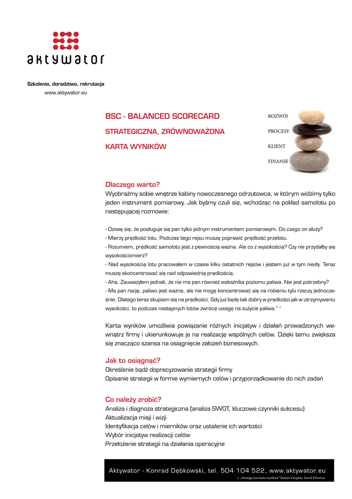 Szkolenia, doradztwo, rekrutacja www.aktywator.eu BSC - Balanced SCOrecard ROZWÓJ STRATEGICZNA, ZRÓWNOWAŻONA PROCESY KARTA WYNIKÓW KLIENT FINANSE Dlaczego warto? Wyobraźmy sobie wnętrze kabiny nowoczesnego odrzutowca, w którym widzimy tylko jeden instrument pomiarowy. Jak byśmy czuli się, wchodząc na pokład samolotu po następującej rozmowie: - Dziwię się, że posługuje się pan tylko jednym instrumentem pomiarowym. Do czego on służy? - Mierzy prędkość lotu. Podczas tego rejsu muszę poprawić prędkość przelotu. - Rozumiem, prędkość samolotu jest z pewnością ważna. Ale co z wysokością? Czy nie przydałby się wysokościomierz? - Nad wysokością lotu pracowałem w czasie kilku ostatnich rejsów i jestem już w tym niezły. Teraz muszę skoncentrować się nad odpowiednią prędkością. - Aha. Zauważyłem jednak, że nie ma pan również wskaźnika poziomu paliwa. Nie jest potrzebny? - Ma pan rację, paliwo jest ważne, ale nie mogę koncentrować się na robieniu tylu rzeczy jednocześnie. Dlatego teraz skupiam się na prędkości. Gdy już będę tak dobry w prędkości jak w utrzymywaniu wysokości, to podczas następnych lotów zwrócę uwagę na zużycie paliwa.” 1 Karta wyników umożliwia powiązanie różnych inicjatyw i działań prowadzonych wewnątrz firmy i ukierunkowuje je na realizację wspólnych celów. Dzięki temu zwiększa się znacząco szansa na osiągnięcie założeń biznesowych. Jak to osiągnąć? Określenie bądź doprecyzowanie strategii firmy Opisanie strategii w formie wymiernych celów i przyporządkowanie do nich zadań Co należy zrobić? Analiza i diagnoza strategiczna (analiza SWOT, kluczowe czynniki sukcesu) Aktualizacja misji i wizji Identyfikacja celów i mierników oraz ustalenie ich wartości Wybór inicjatyw realizacji celów Przełożenie strategii na działania operacyjne Aktywator - Konrad Dębkowski, tel. 504 104 522, www.aktywator.eu 1. „Strategiczna karta wyników” Robert S.Kaplan, David P.Norton