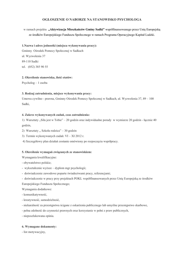 OGŁOSZENIE O NABORZE NA STANOWISKO PSYCHOLOGA w ramach projektu „Aktywizacja Mieszkańców Gminy Sadki” współfinansowanego przez Unię Europejską ze środków Europejskiego Funduszu Społecznego w ramach Programu Operacyjnego Kapitał Ludzki. 1.Nazwa i adres jednostki (miejsca wykonywania pracy): Gminny Ośrodek Pomocy Społecznej w Sadkach ul. Wyzwolenia 37 89-110 Sadki tel. (052) 385 90 55 2. Określenie stanowiska, ilość etatów: Psycholog – 1 osoba 3. Rodzaj zatrudnienia, miejsce wykonywania pracy: Umowa cywilno - prawna, Gminny Ośrodek Pomocy Społecznej w Sadkach, ul. Wyzwolenia 37, 89 – 100 Sadki, 4. Zakres wykonywanych zadań, czas zatrudnienia: 1) Warsztaty ,,Siła jest w Tobie” – 20 godzin oraz indywidualne porady w wymiarze 20 godzin - łącznie 40 godzin, 2) Warsztaty ,, Szkoła rodzica” – 30 godzin 3) Termin wykonywanych zadań: VI – XI 2012 r. 4) Szczegółowy plan działań zostanie omówiony po rozpoczęciu współpracy. 5. Określenie wymagań związanych ze stanowiskiem: Wymagania kwalifikacyjne: - obywatelstwo polskie; - wykształcenie wyższe – dyplom mgr psychologii; - doświadczenie zawodowe poparte świadectwami pracy, referencjami; - doświadczenie w pracy przy projektach POKL współfinansowanych przez Unię Europejską ze środków Europejskiego Funduszu Społecznego; Wymagania dodatkowe: - komunikatywność, - kreatywność, samodzielność, - niekaralność za przestępstwa ścigane z oskarżenia publicznego lub umyślne przestępstwo skarbowe, - pełna zdolność do czynności prawnych oraz korzystanie w pełni z praw publicznych, - nieposzlakowana opinia. 6. Wymagane dokumenty: - list motywacyjny, - życiorys - Curriculum Vitae (ze zdjęciem) – podpisany odręcznie, - kserokopie dokumentów potwierdzających wykształcenie, - kserokopie innych dokumentów o posiadanych kwalifikacjach, uprawnieniach, umiejętnościach, - oświadczenie o pełnej zdolności do czynności prawnych oraz korzystaniu z pełni praw publicznych, - oświadczenie o niekaralności za przestępstwo umyślne ścigane z oskarżenia publicznego lub umyślne przestępstwo skarbowe, - oświadczenie o wyrażeniu zgody na przetwarzanie danych osobowych na potrzeby postępowania rekrutacyjnego, zgodnie z ustawą z dnia 29 sierpnia 1997 r. o ochronie danych osobowych (Dz. U. z 2002 r. Nr 101, poz. 926 ze zmianami), - oświadczenie, że łączne zaangażowanie w realizację zadań projektowych nie przekracza 240 godzin miesięcznie, - oświadczenie o stawce za 1 godzinę zegarową kompletnej usługi, - proponowany program wyżej wymienionych warsztatów. 7. Główne kryteria wyboru oferty: - doświadczenie w zakresie pracy (usług) na stanowisku psychologa – 60 % - cena wykonania usługi (stawka za jedną godzinę usługi) – 40 % 8. Termin i miejsce składania dokumentów: Wymagane dokumenty należy składać osobiście w Gminnym Ośrodku Pomocy Społecznej w Sadkach lub pocztą na adres Ośrodka, w terminie do 28. 05. 2012r. do godziny 15:00, w zamkniętej kopercie (z dopiskiem POKL - psycholog). W przypadku nadsyłania dokumentów pocztą liczy się data wpływu dokumentacji do GOPS w Sadkach. Dokumenty, które wpłyną po terminie nie będą rozpatrywane. Nie ma możliwości przekazywania dokumentów drogą elektroniczną. 9. Pozostałe zobowiązania: - Kandydaci są zobowiązani do poddania się rozmowie kwalifikacyjnej, - O terminie i miejscu przeprowadzenia rozmowy kwalifikacyjnej kandydat zostanie powiadomiony indywidualnie, - Informacja o wynikach naboru będzie umieszczona w Biuletynie Informacji Publicznej www.bip.sadki.pl oraz na tablicy informacyjnej Ośrodka. Sadki, dnia 17.05.2012r. Kierownik GOPS w Sadkach /-/Alicja Matejczyk