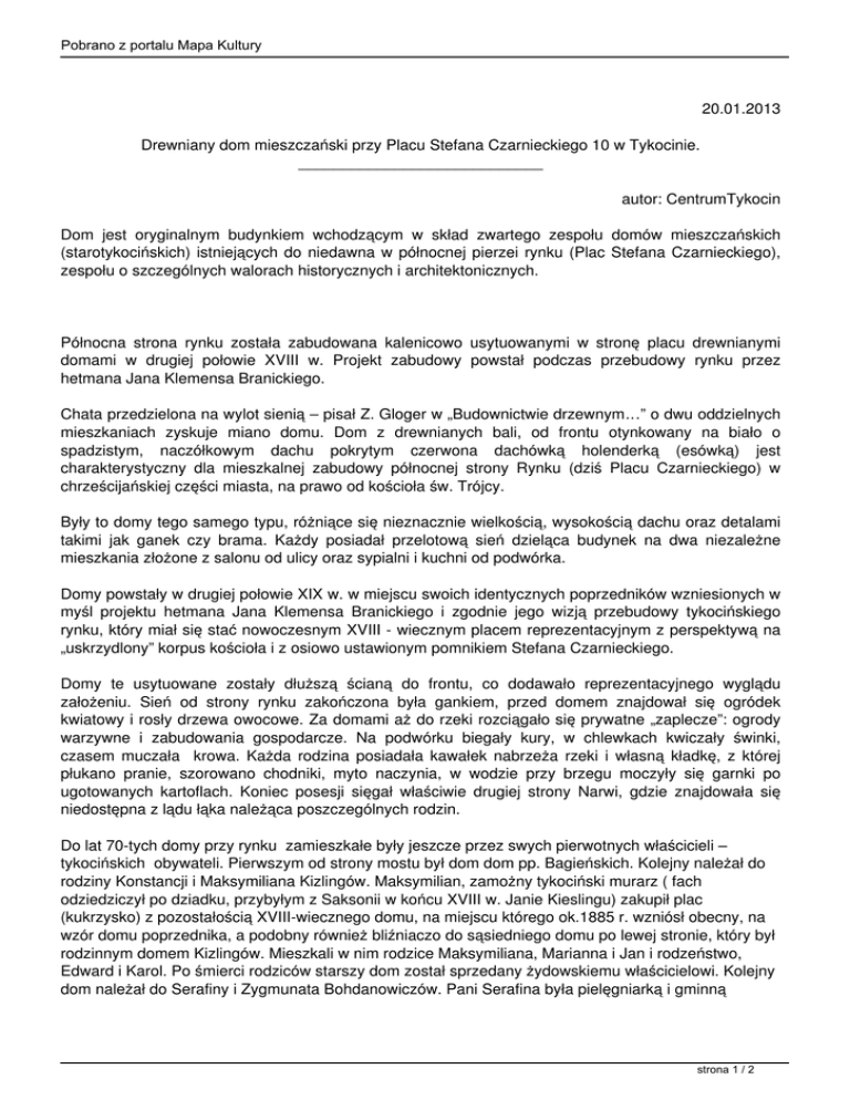 Pobrano z portalu Mapa Kultury 20.01.2013 Drewniany dom mieszczański przy Placu Stefana Czarnieckiego 10 w Tykocinie. ____________________________ autor: CentrumTykocin Dom jest oryginalnym budynkiem wchodzącym w skład zwartego zespołu domów mieszczańskich (starotykocińskich) istniejących do niedawna w północnej pierzei rynku (Plac Stefana Czarnieckiego), zespołu o szczególnych walorach historycznych i architektonicznych. Północna strona rynku została zabudowana kalenicowo usytuowanymi w stronę placu drewnianymi domami w drugiej połowie XVIII w. Projekt zabudowy powstał podczas przebudowy rynku przez hetmana Jana Klemensa Branickiego. Chata przedzielona na wylot sienią – pisał Z. Gloger w „Budownictwie drzewnym…” o dwu oddzielnych mieszkaniach zyskuje miano domu. Dom z drewnianych bali, od frontu otynkowany na biało o spadzistym, naczółkowym dachu pokrytym czerwona dachówką holenderką (esówką) jest charakterystyczny dla mieszkalnej zabudowy północnej strony Rynku (dziś Placu Czarnieckiego) w chrześcijańskiej części miasta, na prawo od kościoła św. Trójcy. Były to domy tego samego typu, różniące się nieznacznie wielkością, wysokością dachu oraz detalami takimi jak ganek czy brama. Każdy posiadał przelotową sień dzieląca budynek na dwa niezależne mieszkania złożone z salonu od ulicy oraz sypialni i kuchni od podwórka. Domy powstały w drugiej połowie XIX w. w miejscu swoich identycznych poprzedników wzniesionych w myśl projektu hetmana Jana Klemensa Branickiego i zgodnie jego wizją przebudowy tykocińskiego rynku, który miał się stać nowoczesnym XVIII - wiecznym placem reprezentacyjnym z perspektywą na „uskrzydlony” korpus kościoła i z osiowo ustawionym pomnikiem Stefana Czarnieckiego. Domy te usytuowane zostały dłuższą ścianą do frontu, co dodawało reprezentacyjnego wyglądu założeniu. Sień od strony rynku zakończona była gankiem, przed domem znajdował się ogródek kwiatowy i rosły drzewa owocowe. Za domami aż do rzeki rozciągało się prywatne „zaplecze”: ogrody warzywne i zabudowania gospodarcze. Na podwórku biegały kury, w chlewkach kwiczały świnki, czasem muczała krowa. Każda rodzina posiadała kawałek nabrzeża rzeki i własną kładkę, z której płukano pranie, szorowano chodniki, myto naczynia, w wodzie przy brzegu moczyły się garnki po ugotowanych kartoflach. Koniec posesji sięgał właściwie drugiej strony Narwi, gdzie znajdowała się niedostępna z lądu łąka należąca poszczególnych rodzin. Do lat 70-tych domy przy rynku zamieszkałe były jeszcze przez swych pierwotnych właścicieli – tykocińskich obywateli. Pierwszym od strony mostu był dom dom pp. Bagieńskich. Kolejny należał do rodziny Konstancji i Maksymiliana Kizlingów. Maksymilian, zamożny tykociński murarz ( fach odziedziczył po dziadku, przybyłym z Saksonii w końcu XVIII w. Janie Kieslingu) zakupił plac (kukrzysko) z pozostałością XVIII-wiecznego domu, na miejscu którego ok.1885 r. wzniósł obecny, na wzór domu poprzednika, a podobny również bliźniaczo do sąsiedniego domu po lewej stronie, który był rodzinnym domem Kizlingów. Mieszkali w nim rodzice Maksymiliana, Marianna i Jan i rodzeństwo, Edward i Karol. Po śmierci rodziców starszy dom został sprzedany żydowskiemu właścicielowi. Kolejny dom należał do Serafiny i Zygmunata Bohdanowiczów. Pani Serafina była pielęgniarką i gminną strona 1 / 2 Pobrano z portalu Mapa Kultury akuszerką i przyjmowała na świat mieszkańców Tykocina w ich własnych domach. Pan Zygmunt był aptekarzem, urzędował do II wojny w aptece przy Starym Rynku przy Motławie, pracował tam wraz z aptekarzem p. Turkiem, który zginął wraz z tykocińskimi Żydami 25 sierpnia 1941 r. Ostatni dom przy rynku posiadał zabudowany ganek zwieńczony półokrągłym daszkiem i należał do stolarza pana Stanisława Onyszki. Jedyny dom z wymienionego tu zespołu, który przetrwał w stanie niezmienionym, to dom przy Placu Czarnieckiego 10. Jak i pozostałe domy, w połowie zamieszkiwany był przez właścicieli, druga zaś połowa do końca II wojny św. wynajmowana była lokatorom. Pełnił więc funkcję wielkomiejskiej czynszówki. Przez pewien okres wynajmowana też była „górka” – pokoik z kuchnią mieszczący się na strychu. Dom jest podpiwniczony, murowana kamienna piwnica, właściwie mały loch, pochodzi jeszcze z poprzedniego domu, podobnie jak ceglana podłoga w przelotowej sieni, ułożona w XVIII w., kiedy do budowy domu z ruin zamku pozyskiwano XVI wieczną cegłę palcówkę. Nieznanego pochodzenia, jakby z innej epoki są nabijane gwoździami drzwi pomiędzy sienią a sionką, posiadające pięknie kutą kowalską klamkę-zapadkę, jakich jest w domu więcej. Pięknym przykładem drewnianej stolarki jest brama oraz płotek od ulicy. Ganek w oryginalnej formie składał się z rzeźbionej drewnianej balustrady i blaszanego daszka podtrzymywanego przez metalowe pręty i pełnił funkcję towarzysko-reprezentacyjną. Obecny ganek wzniesiony w 1976 roku jest rekonstrukcją nieistniejącego ganku z kolumienkami rozebranego domu przy ul. 11 Listopada. Wnętrze domu z drewnianymi podłogami, belkami stropowymi, z pięknie profilowaną stolarką drzwiową i okienną pomalowaną na biało utrzymuje nastrój XIX wiecznego małomiasteczkowego domu mieszkalnego. Salon od strony wschodniej posiada piękną przedwojenną otomanę oraz szafę z lustrem i wielki okrągły rozsuwany stół z lat 30-tych. Zaplecze kuchenne z paleniskami i piecami chlebowymi nie zmieniło się chyba od w. XVIII. Obecnie dom jest siedzibą fundacji centrum Badań nad Historią i Kulturą Małych Miast. strona 2 / 2