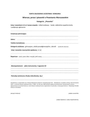 KARTA ZGŁOSZENIA UCZESTNIKA KONKURSU Wiersze, proza i piosenki o Powstaniu Warszawskim Kategoria „Piosenka” Imię i nazwisko/solista/ nazwa zespołu – skład osobowy - każdy oddzielnie wypełnia kartę i podpisuje zgłoszenie ……………………………………………………………………………………………………………………………………………………………............................................................... Instytucja patronująca ………………………………………………………………………………………………………………………………………………………….. Adres: ………………………………………………………………………………………………………………………………………………………………………………………………... Telefon kontaktowy ………………………………………………………………………………………………………………………………………………………………………… Kategoria wiekowa : gimnazjum, szkoła ponadgimnazjalna , dorośli (podkreślić właściwe) Imię i nazwisko nauczyciela-opiekuna, nr tel. ………………………………………………………………………………………………………………………………………………………………………………………………………………………. Repertuar – tytuł, autor słów i muzyki, jeśli znany……………………………………………………………………………………………. ……………………………………………………………………………………………………………………………………………………………………………………………………………………….. ………………………………………………………………………………………………………………………………………………………………………………………………………………………. Akompaniament - jakie instrumenty / nagranie CD …………………………………………………………………………………………………………………………………………………………… …………………………………………………………………………………………………………………………………………………………… …………………………………………………………………………………………………………………………………………………………… Potrzeby techniczne /liczba mikrofonów, itp./ ………………………………………………………………………………………………………………………………………………………….. Oświadczam, że zapoznałem się z tekstem Regulaminu Konkursu i akceptuję jego treść. Oświadczam, że zgodnie ustawą z dnia 29 sierpnia 1997 r. o ochronie danych osobowych (Dz.U. z 2002 r. Nr 101, poz. 926) wyrażam zgodę na przetwarzanie, wymienionych w Karcie Zgłoszeniowej Uczestnika Konkursu, moich danych osobowych przez organizatora na potrzeby z niniejszego konkursu i Miejskiego Ośrodka Kultury w Jarosławiu. pieczęć Instytucji podpis uczestnika podpis Opiekuna osoby niepełnoletniej