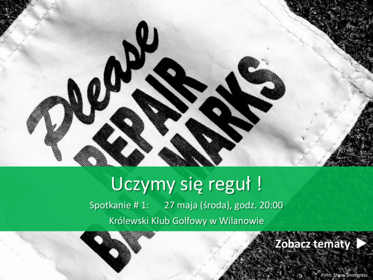 Uczymy się reguł ! Spotkanie # 1: 27 maja (środa), godz. 20:00 Królewski Klub Golfowy w Wilanowie Zobacz tematy Foto: Steve Snodgrass TEMATY I. II. III. IV. Etykieta Dobry początek, zaczynamy grę (także turniejową!) Kiedy cisza, kiedy rozmowa, kiedy krzyk? Woooolny jeeeeestem… PRZYKŁADOWE ZAGADNIENIA NAJWAŻNIEJSZY ELEMENT GRY. Reguły gry w golfa – jak korzystać. Co należy zrobić przed rozpoczęciem gry (np. wypełnianie karty, informowanie o HCP i wpisywanie do karty, wymienianie się kartami etc.) Policz kije (14), oznacz piłkę i poinformuj współzawodników Rola markera – kto może być markerem i co należy do jego obowiązków Kolejność gry na tee – honor (zarówno na pierwszym tee, jak i na kolejnych) Jak wyznaczamy granice tee, gdzie ma leżeć piłka? Gracz może stanąć poza obszarem tee. Co zrobić, jeśli piłka spadła z kołeczka podczas adresowania lub zamachu próbnego, ale przed uderzeniem? Cisza: wyłącz komórkę, nie rozmawiaj (nawet szeptem), gdy inny gracz szykuje się do uderzenia, nie komentuj uderzeń (chyba, że chcesz pochwalić) Rozmowa: o czym można rozmawiać z innymi graczami, a o czym nie można? Co jest niedozwoloną podpowiedzią? Krzyk: FORE! (nie: UWAGA!). Kto krzyknąć powinien? Wystaw rękę w stronę, w którą piłka skręca itp. Jak wygląda procedura przepuszczania szybszych graczy? Jak przyspieszyć grę, nawet, gdy jestem początkujący? – nie przesadzaj z liczbą próbnych uderzeń – idź prosto do swojej piłki – pomagaj w szukaniu zgubionej piłki współzawodnikowi – wybierz kij, oczekując na zagranie współzawodnika – przy greenie postaw torbę od strony przejścia na kolejne tee – czytaj green zanim przyjdzie twoja kolej – ruszaj do piłki, gdy współzawodnik uderzył piłkę (nie musisz czekać w bezruchu, aż wpadnie ona do dołka)