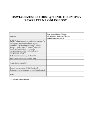 OŚWIADCZENIE O ODSTĄPIENIU OD UMOWY ZAWARTEJ NA ODLEGŁOŚĆ Adresat Ja/My(*) niniejszym informuję/informujemy(*) o moim/naszym odstąpieniu od umowy sprzedaży następujących rzeczy(*) umowy dostawy następujących rzeczy(*) umowy o dzieło polegającej na wykonaniu następujących rzeczy(*)/o świadczenie następującej usługi(*) Data zawarcia umowy(*)/odbioru(*) Imię i nazwisko konsumenta(-ów) Adres konsumenta(-ów) Podpis konsumenta(-ów) (tylko jeżeli formularz jest przesyłany w wersji papierowej) Data (*) – Niepotrzebne skreślić. Fan Sport Michał Gliński ul. Młyńska 8 44-100 Gliwice [email protected]