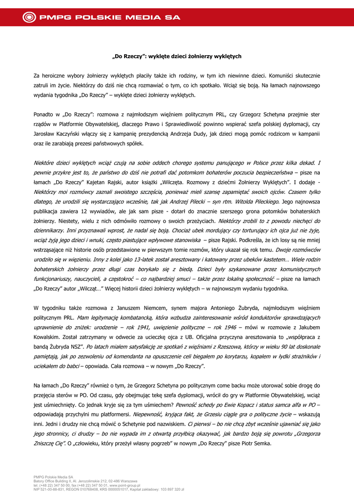 „Do Rzeczy”: wyklęte dzieci żołnierzy wyklętych Za heroiczne wybory żołnierzy wyklętych płaciły także ich rodziny, w tym ich niewinne dzieci. Komuniści skutecznie zatruli im życie. Niektórzy do dziś nie chcą rozmawiać o tym, co ich spotkało. Wciąż się boją. Na łamach najnowszego wydania tygodnika „Do Rzeczy” – wyklęte dzieci żołnierzy wyklętych. Ponadto w „Do Rzeczy”: rozmowa z najmłodszym więźniem politycznym PRL, czy Grzegorz Schetyna przejmie ster rządów w Platformie Obywatelskiej, dlaczego Prawo i Sprawiedliwość powinno wspierać szefa polskiej dyplomacji, czy Jarosław Kaczyński włączy się z kampanię prezydencką Andrzeja Dudy, jak dzieci mogą pomóc rodzicom w kampanii oraz ile zarabiają prezesi państwowych spółek. Niektóre dzieci wyklętych wciąż czują na sobie oddech chorego systemu panującego w Polsce przez kilka dekad. I pewnie przykre jest to, że państwo do dziś nie potrafi dać potomkom bohaterów poczucia bezpieczeństwa – pisze na łamach „Do Rzeczy” Kajetan Rajski, autor książki „Wilczęta. Rozmowy z dziećmi Żołnierzy Wyklętych”. I dodaje - Niektórzy moi rozmówcy zaznali swoistego szczęścia, ponieważ mieli szansę zapamiętać swoich ojców. Czasem tylko dlatego, że urodzili się wystarczająco wcześnie, tak jak Andrzej Pilecki – syn rtm. Witolda Pileckiego. Jego najnowsza publikacja zawiera 12 wywiadów, ale jak sam pisze - dotarł do znacznie szerszego grona potomków bohaterskich żołnierzy. Niestety, wielu z nich odmówiło rozmowy o swoich przeżyciach. Niektórzy zrobili to z powodu niechęci do dziennikarzy. Inni przyznawali wprost, że nadal się boją. Chociaż ubek mordujący czy torturujący ich ojca już nie żyje, wciąż żyją jego dzieci i wnuki, często piastujące wpływowe stanowiska – pisze Rajski. Podkreśla, że ich losy są nie mniej wstrząsające niż historie osób przedstawione w pierwszym tomie rozmów, który ukazał się rok temu. Dwoje rozmówców urodziło się w więzieniu. Inny z kolei jako 13-latek został aresztowany i katowany przez ubeków kastetem… Wiele rodzin bohaterskich żołnierzy przez długi czas borykało się z biedą. Dzieci były szykanowane przez komunistycznych funkcjonariuszy, nauczycieli, a częstokroć – co najbardziej smuci – także przez lokalną społeczność – pisze na łamach „Do Rzeczy” autor „Wilcząt…” Więcej historii dzieci żołnierzy wyklętych – w najnowszym wydaniu tygodnika. W tygodniku także rozmowa z Januszem Niemcem, synem majora Antoniego Żubryda, najmłodszym więźniem politycznym PRL. Mam legitymację kombatancką, która wzbudza zainteresowanie wśród konduktorów sprawdzających uprawnienie do zniżek: urodzenie – rok 1941, uwięzienie polityczne – rok 1946 – mówi w rozmowie z Jakubem Kowalskim. Został zatrzymany w odwecie za ucieczkę ojca z UB. Oficjalna przyczyna aresztowania to „współpraca z bandą Żubryda NSZ”. Po latach miałem satysfakcję ze spotkań z więźniami z Rzeszowa, którzy w wieku 90 lat doskonale pamiętają, jak po zezwoleniu od komendanta na opuszczenie celi biegałem po korytarzu, kopałem w łydki strażników i uciekałem do babci – opowiada. Cała rozmowa – w nowym „Do Rzeczy”. Na łamach „Do Rzeczy” również o tym, że Grzegorz Schetyna po politycznym come backu może utorować sobie drogę do przejęcia sterów w PO. Od czasu, gdy obejmując tekę szefa dyplomacji, wrócił do gry w Platformie Obywatelskiej, wciąż jest uśmiechnięty. Co jednak kryje się za tym uśmiechem? Pewność schedy po Ewie Kopacz i status samca alfa w PO – odpowiadają przychylni mu platformersi. Niepewność, kryjąca fakt, że Grzesiu ciągle gra o polityczne życie – wskazują inni. Jedni i drudzy nie chcą mówić o Schetynie pod nazwiskiem. Ci pierwsi – bo nie chcą zbyt wcześnie ujawniać się jako jego stronnicy, ci drudzy – bo nie wypada im z otwartą przyłbicą okazywać, jak bardzo boją się powrotu „Grzegorza Zniszczę Cię”. O „człowieku, który przeżył własny pogrzeb” w nowym „Do Rzeczy” pisze Piotr Semka. PMPG Polskie Media SA Batory Office Building II, Al. Jerozolimskie 212, 02-486 Warszawa tel. (+48 22) 347 50 00, fax (+48 22) 347 50 01, www.point-group.pl NIP 521-00-88-831, REGON 010768408, KRS 0000051017, Kapitał zakładowy: 103 897 320 zł A Rafał A. Ziemkiewicz komentuje ostatnie wystąpienia szefa polskiej dyplomacji i …stosunek do nich Prawa i Sprawiedliwości. Kiedy walka polityczna zamienia się w wojnę plemion, zdrowy rozum odsyłany jest w kąt. Politycy PiS przyłączyli się do szyderstw ze Schetyny, które pobrzmiewają jak kpiny ze śp. Lecha Kaczyńskiego – pisze. Ziemkiewicz podkreśla, że zwycięstwo Rosji nad Hitlerem to oś polityki historycznej Kremla, nieustannie przypominana podstawa roszczeń do przywrócenia stref wpływów wyznaczonych krwią rosyjskich „wyzwolicieli” i jałtańskim atramentem. Zanegowanie tych pretensji, ignorujących oczywiste historyczne fakty, jest jak najbardziej w polskim interesie. Owszem, można mieć zastrzeżenia do realizacji tego pomysłu – wchodząc w taki konflikt, minister Schetyna mógł przygotować się lepiej (…) Zdrowy rozum jednak podpowiada, że sam fakt odstąpienia od zbankrutowanej doktryny przymilania się żądającym od Polski „przyjaznych stosunków z Rosją” mocarstwom unijnym poprzez podlizywanie się Kremlowi kto jak kto, ale politycy Prawa i Sprawiedliwości powinni przyjąć z satysfakcją i zaaprobować – podkreśla Ziemkiewicz. Cały komentarz – na łamach „Do Rzeczy”. W „Do Rzeczy” także rozmowa o kampanii prezydenckiej. Dlaczego Jarosław Kaczyński nie włączył się w kampanię wyborczą Andrzeja Dudy? – pyta Mariusz Staniszewski. Premier Kaczyński nie startuje w tych wyborach, więc nie jest na pierwszym planie. Od momentu wystawienia kandydata w wyborach prezydenckich mówił, że teraz 