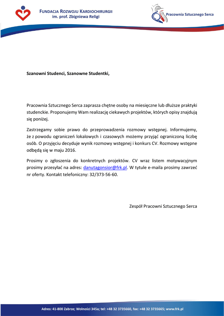 Szanowni Studenci, Szanowne Studentki, Pracownia Sztucznego Serca zaprasza chętne osoby na miesięczne lub dłuższe praktyki studenckie. Proponujemy Wam realizację ciekawych projektów, których opisy znajdują się poniżej. Zastrzegamy sobie prawo do przeprowadzenia rozmowy wstępnej. Informujemy, że z powodu ograniczeń lokalowych i czasowych możemy przyjąć ograniczoną liczbę osób. O przyjęciu decyduje wynik rozmowy wstępnej i konkurs CV. Rozmowy wstępne odbędą się w maju 2016. Prosimy o zgłoszenia do konkretnych projektów. CV wraz listem motywacyjnym prosimy przesyłać na adres: [email protected]. W tytule e-maila prosimy zawrzeć nr oferty. Kontakt telefoniczny: 32/373-56-60. Zespół Pracowni Sztucznego Serca OFERTA PRAKTYK STUDENCKICH nr PSS/01/2016 Temat Przeprowadzenie badań porównawczych ultradźwiękowej i optycznej metody zliczania mikrocząstek w płynącej cieczy - praktyka dla 2 osób Opis Istotą badań jest wyznaczenie wybranych właściwości metrologicznych (czułość, swoistość, rozdzielczość pomiaru itp.) ultradźwiękowego urządzenia detekcji mikroobiektów, zbudowanego w FRK w ramach projektu clotALERT (www.clotalert.pl). Metodą referencyjną pomiaru liczby mikrocząstek jest pomiar optyczny za pomocą szybkiej kamery. Metodą oceny parametrów metrologicznych są metody statystyczne, porównujące rozkłady zmiennej losowej (liczba wykrytych obiektów) obu metod pomiarowych. W ramach praktyki należy zrealizować następujące prace: OSOBA 1: 1) Zapoznanie się z istotą problemu badawczego oraz obiektem badań, 2) Uruchomienie systemu wizyjnego, 3) Przygotowanie odpowiedniego oświetlenia przestrzeni pomiarowej, 4) Przygotowanie posiewu ultradźwiękowego, 5) Przeprowadzenie rejestracji obrazów dla różnych wartości przepływu i różnych stężeń posiewu ultradźwiękowego w jednostce objętości cieczy, OSOBA 2 1) Zapoznanie się z istotą problemu badawczego oraz materiałem z badań wstępnych, 2) Opracowanie narzędzi programowych do zliczania mikroobiektów w obrazach zarejestrowanych podczas badań wstępnych, 3) Przeprowadzenie analizy statystycznej uzyskanych wyników, 4) Opracowanie raportu z badań. Oczekiwany końcowy rezultat: OSOBA 1 – zarchiwizowane i posortowane wyniki pomiarów wraz ze szczegółowymi opisami warunków prowadzenia eksperymentów, OSOBA 2 - raport z badań zawierający statystycznie opracowane wyniki pomiarów oraz dane dotyczące właściwości metrologicznych ultradźwiękowej metody pomiaru mikroobiektów. Wymagania OSOBA 1 Cechy charakteru predestynujące do prowadzenia pomiarów (precyzja, rzetelność, sumienność, spostrzegawczość), Umiejętność dokładnego dokumentowania przebiegu badań, Zainteresowania związane z mechaniką płynów i akwizycją obrazów. OSOBA 2 Umiejętność cyfrowego przetwarzania obrazów (preferowane środowisko - LabVIEW Vision), Podstawowa znajomość statystycznych metod analizy danych, Umiejętność tworzenia syntetycznych raportów z badań. Oferujemy Możliwość pracy z doświadczonymi naukowcami w projekcie badawczym o unikalnej tematyce i wysokim potencjale aplikacyjnym w praktyce klinicznej, Dostęp do aparatury pomiarowej i oprogramowania specjalistycznego będących w zasobach Pracowni Sztucznego Serca, Możliwość zdobycia wiedzy teoretycznej i praktycznych umiejętności związanych z realizowanym tematem badawczym, Elastyczne godziny odbywania praktyki. Zgłoszenia CV lub ewentualne pytania prosimy przesyłać na adres: [email protected] W tytule e-maila prosimy zawrzeć nr oferty. Kontakt telefoniczny: 32/373-56-60 Osoba odpowiedzialna za ofertę Maciej Gawlikowski – kierownik Laboratorium Badawczego Pracowni Sztucznego Serca OFERTA PRAKTYK STUDENCKICH nr PSS/02/2016 Temat Degradacji czynnika von Willebrandta podczas wspomagania serca wirowymi pompami krwi – studia literaturowe Opis Jednym z opisywanych w literaturze powikłań mechanicznego wspomagania serca pompami wirowymi jest degradacja glikoprotein czynnika von Willebrandta, prawdopodobnie prowadząca do krwawień z dolnego odcinka przewodu pokarmowego. Celem prac zaplanowanych do realizacji w ramach praktyki jest przeprowadzenie studiów literaturowych pokazujących aktualny stan wiedzy w zakresie metod oceny czynnika von Willebrandta i jego degradacji przez układy mechanicznego wspomagania serca, głównie przez wirowe pompy krwi. Oczekiwany końcowy rezultat: pisemne opracowanie teoretyczne zawierające następujące rozdziały: 1. Rola czynnika von Willebrandta w procesie krzepnięcia krwi, 2. Syntetyczny przegląd doniesień literaturowych dotyczących degradacji czynnika von Willebrandta z ukierunkowaniem na oddziaływania mechaniczne, 3. Przegląd metod diagnostyki laboratoryjnej umożliwiających ocenę stopnia degradacji czynnika von Willebrandta wraz z rozeznaniem stosowanej aparatury i laboratoriów dokonujących takich badań. Wymagania Studia kierunkowe na wydziale: biologii, biotechnologii, analityki medycznej lub podobnym, Znajomość języka angielskiego na poziomie umożliwiającym zrozumienie anglojęzycznych tekstów naukowych, Umiejętność wyszukiwania informacji z źródłach ogólnie dostępnych (internet, bazy wiedzy, literatura). Oferujemy Możliwość pracy z doświadczonymi polskimi naukowcami w obszarze badań o dużym znaczeniu klinicznym, Możliwość zdobycia wiedzy teoretycznej i umiejętności praktycznych związanych z tworzeniem opracowań naukowych, Elastyczne godziny odbywania praktyki. Zgłoszenia CV lub ewentualne pytania prosimy przesyłać na adres: [email protected] W tytule e-maila prosimy zawrzeć nr oferty. Kontakt telefoniczny: 32/373-56-60 Osoba odpowiedzialna za ofertę Maciej Gawlikowski – kierownik Laboratorium Badawczego Pracowni Sztucznego Serca Karolina Janiczak – specjalista w Laboratorium Badawczym Pracowni Sztucznego Serca OFERTA PRAKTYK STUDENCKICH nr PSS/03/2016 Temat Przegląd i badanie wybranych metod numerycznych w 