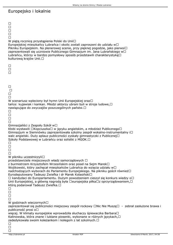 Witamy na stronie Gminy i Miasta Lubraniec Europejsko i lokalnie W piątą rocznicę przystąpienia Polski do Unii Europejskiej mieszkańcy Lubrańca i okolic zostali zaproszeni do udziału w Pikniku Europejskim. Na plenerowej scenie, przy pięknej pogodzie, jako pierwsi zaprezentowali się uczniowie Publicznego Gimnazjum im. Jana Lubrańskiego w Lubrańcu, którzy w bardzo pomysłowy sposób przedstawili charakterystykę kulturową krajów Unii. W scenariusz wpleciony był hymn Unii Europejskiej oraz tańce: kujawiak i kankan. Młodzi aktorzy ubrani byli w stroje ludowe, nawiązujące do zwyczajów poszczególnych państw. Gimnazjaliści z Zespołu Szkół w Kłobi wystawili Kopciuszka w języku angielskim, a młodzież Publicznego Gimnazjum w Siemnówku zaprezentowała szkolny zespół wokalno-instrumentalny i walc angielski. Duży aplauz publiczności zyskały gimnastyczki z Publicznej Szkoły Podstawowej w Lubrańcu oraz solistki z MGOK. W pikniku uczestniczyli przedstawiciele miejscowych władz samorządowych z burmistrzem Krzysztofem Wrzesińskim oraz poseł na Sejm Marek Wojtkowski, który zachęcał mieszkańców Lubrańca do wzięcia udziału w nadchodzących wyborach do Parlamentu Europejskiego. Na pikniku gościł również Eurodeputowany Tadeusz Zwiefka i dr Marek Kolasiński kandydaci do Europarlamentu. Dużym powodzeniem cieszył się konkurs wiedzy o Unii Europejskiej, a główną nagrodą była europejska piłkaz oprzyrządowaniem, którą podarował Tadeusz Zwiefka. W godzinach wieczornych zaprezentował się publiczności miejscowy zespół rockowy Nic Nie Muszę - zebrał zasłużone brawa i publiczność prosi o więcej. W klimaty europejskie wprowadziła słuchaczy śpiewaczka Barbara Kalinowska, która znane i lubiane piosenki, wykonane w różnych językach, zadedykowała swoim koleżankom i kolegom z lat szkolnych. http://lubraniec.pl Kreator PDF Utworzono 8 March, 2017, 04:58 Witamy na stronie Gminy i Miasta Lubraniec Do końca imprezy publiczność bawiła się przy muzyce niezawodnego, miejscowego zespołu Zbigniewa Drążka i Mariusza Kasprzaka, których wspomagał DJ z Topólki. http://lubraniec.pl Kreator PDF Utworzono 8 March, 2017, 04:58