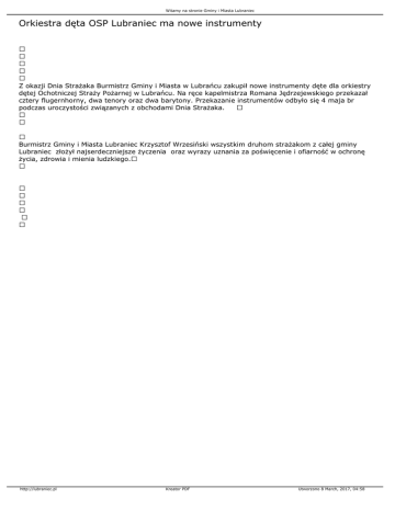 Witamy na stronie Gminy i Miasta Lubraniec Orkiestra dęta OSP Lubraniec ma nowe instrumenty Z okazji Dnia Strażaka Burmistrz Gminy i Miasta w Lubrańcu zakupił nowe instrumenty dęte dla orkiestry dętej Ochotniczej Straży Pożarnej w Lubrańcu. Na ręce kapelmistrza Romana Jędrzejewskiego przekazał cztery flugernhorny, dwa tenory oraz dwa barytony. Przekazanie instrumentów odbyło się 4 maja br podczas uroczystości związanych z obchodami Dnia Strażaka. Burmistrz Gminy i Miasta Lubraniec Krzysztof Wrzesiński wszystkim druhom strażakom z całej gminy Lubraniec złożył najserdeczniejsze życzenia oraz wyrazy uznania za poświęcenie i ofiarność w ochronę życia, zdrowia i mienia ludzkiego. http://lubraniec.pl Kreator PDF Utworzono 8 March, 2017, 04:58