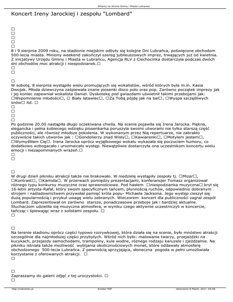 Witamy na stronie Gminy i Miasta Lubraniec Koncert Ireny Jarockiej i zespołu "Lombard" 8 i 9 sierpnia 2009 roku, na stadionie miejskim odbyły się kolejne Dni Lubrańca, poświęcone obchodom 500-lecia miasta. Miniony weekend zakończył szereg jubileuszowych imprez, trwających już od kwietnia. Z inicjatywy Urzędu Gminy i Miasta w Lubrańcu, Agencja RLV z Ciechocinka dostarczyła podczas dwóch dni obchodów moc atrakcji i niespodzianek. W sobotę, 8 sierpnia wystąpiło wielu promujących się wokalistów, wśród których była m.in. Kasia Dwojak. Młoda dziewczyna zaśpiewała znane piosenki disco polo oraz pop. Zarówno początek imprezy jak i jej koniec zapewniał wokalista Daniel. Dyskotekę pod gwiazdami uświetnił takimi przebojami jak: Wspomnienie młodości, Biały latawiec, Za Tobą pójdę jak na bal, Wyspa szczęśliwych snów itd. Po godzinie 20.00 nastąpiła długo oczekiwana chwila. Na scenie pojawiła się Irena Jarocka. Piękna, elegancka i pełna kobiecego wdzięku piosenkarka poruszyła swoimi utworami nie tylko starszą część publiczności, ale również młodsze pokolenia. W wykonanym przez Nią repertuarze, nie zabrakło oczywiście takich utworów jak : Gondolierzy znad Wisły, Kawiarenki, Motylem jestem, Wymyśliłam Cię. Irena Jarocka oprócz wyjątkowego wokalu wykazała się poczuciem humoru, co dodatkowo wzbogacało i urozmaicało występ. Niewątpliwie dostarczyła ona uczestnikom koncertu wielu emocji i niezapomnianych wrażeń. W drugi dzień pikniku atrakcji także nie brakowało. W niedzielę wystąpiły zespoły tj. Mizar, Kontrast, Kamida. W przerwach pomiędzy prezentacjami, konferansjer Tomasz organizował różnego typu konkursy muzyczne oraz sprawnościowe. Pod hasłem niespodzianka muzyczna krył się 16-letni artysta-Rafał, który swoim specyficznym tańcem, płynnością ruchów, odpowiednio dobranym strojem i naśladownictwem przywołał pamięć króla popu- Michaela Jacksona. Jego występ cieszył się dużą popularnością i przykuł uwagę wielu zebranych. Wieczorem koncert dla publiczności zagrał zespół Lombard. Zaprezentował on zarówno starsze, ponadczasowe przeboje jak i bardziej aktualne. Słuchaczom udzieliła się muzyczna atmosfera, w wyniku czego aktywnie uczestniczyli w koncercie, tańcząc i śpiewając wraz z solistami zespołu. Na terenie stadionu oprócz części typowo rozrywkowej, która działa się na scenie, było mnóstwo atrakcji szczególnie dla najmłodszej części przybyłych. Wśród nich było: malowanie twarzy, przejażdżki na kucykach, przejazdy samochodami, trampoliny, kule wodne, różnego rodzaju karuzele i zjeżdżalnie. Na pikniku istniała także możliwość wybijania okolicznościowych monet, które oddawały atmosferę obchodzonego 500-lecia Lubrańca. Z pewnością sprzyjająca, słoneczna pogoda w pełni umożliwiała korzystanie z oferowanych atrakcji. Zapraszamy do galerii zdjęć z tej uroczystości. http://lubraniec.pl Kreator PDF Utworzono 8 March, 2017, 04:58 Witamy na stronie Gminy i Miasta Lubraniec http://lubraniec.pl Kreator PDF Utworzono 8 March, 2017, 04:58