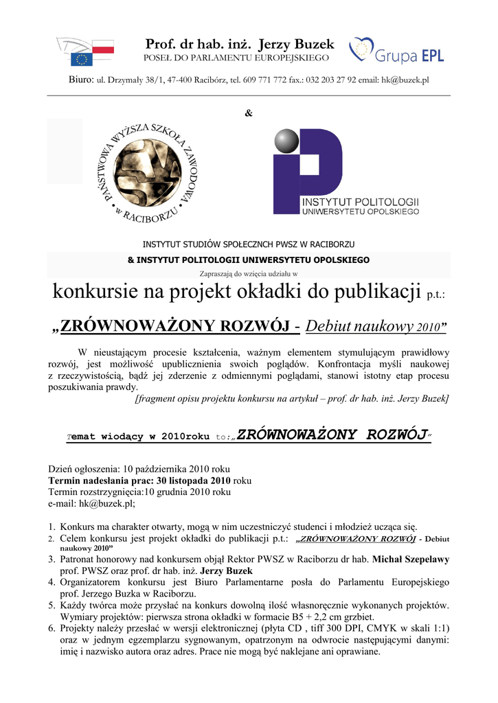 Prof. dr hab. inż. Jerzy Buzek POSEŁ DO PARLAMENTU EUROPEJSKIEGO Biuro: ul. Drzymały 38/1, 47-400 Racibórz, tel. 609 771 772 fax.: 032 203 27 92 email: [email protected] & INSTYTUT STUDIÓW SPOŁECZNCH PWSZ W RACIBORZU & INSTYTUT POLITOLOGII UNIWERSYTETU OPOLSKIEGO Zapraszają do wzięcia udziału w konkursie na projekt okładki do publikacji p.t.: „ZRÓWNOWAŻONY ROZWÓJ - Debiut naukowy 2010” W nieustającym procesie kształcenia, ważnym elementem stymulującym prawidłowy rozwój, jest możliwość upublicznienia swoich poglądów. Konfrontacja myśli naukowej z rzeczywistością, bądź jej zderzenie z odmiennymi poglądami, stanowi istotny etap procesu poszukiwania prawdy. [fragment opisu projektu konkursu na artykuł – prof. dr hab. inż. Jerzy Buzek] Temat wiodący w 2010roku to:„ ZRÓWNOWAŻONY ROZWÓJ” Dzień ogłoszenia: 10 października 2010 roku Termin nadesłania prac: 30 listopada 2010 roku Termin rozstrzygnięcia:10 grudnia 2010 roku e-mail: [email protected]; 1. Konkurs ma charakter otwarty, mogą w nim uczestniczyć studenci i młodzież ucząca się. 2. Celem konkursu jest projekt okładki do publikacji p.t.: „ZRÓWNOWAŻONY ROZWÓJ - Debiut naukowy 2010” 3. Patronat honorowy nad konkursem objął Rektor PWSZ w Raciborzu dr hab. Michał Szepelawy prof. PWSZ oraz prof. dr hab. inż. Jerzy Buzek 4. Organizatorem konkursu jest Biuro Parlamentarne posła do Parlamentu Europejskiego prof. Jerzego Buzka w Raciborzu. 5. Każdy twórca może przysłać na konkurs dowolną ilość własnoręcznie wykonanych projektów. Wymiary projektów: pierwsza strona okładki w formacie B5 + 2,2 cm grzbiet. 6. Projekty należy przesłać w wersji elektronicznej (płyta CD , tiff 300 DPI, CMYK w skali 1:1) oraz w jednym egzemplarzu sygnowanym, opatrzonym na odwrocie następującymi danymi: imię i nazwisko autora oraz adres. Prace nie mogą być naklejane ani oprawiane. 7. Do projektów należy dołączyć wypełnioną kartę zgłoszenia. Prace bez karty zgłoszenia nie będą oceniane przez jury. 8. Prace konkursowe oraz materiał na CD pozostaje do dyspozycji organizatora. Prawa autorskie związane z pracami konkursowymi przechodzą na organizatora. 9. Prace należy przesłać lub dostarczyć na adres: Biuro Parlamentarne prof. Jerzego Buzka, 47-400 Racibórz ul. Drzymały 38/1, z dopiskiem DEBIUT NAUKOWY 2010. 10. Ostateczny termin dostarczenia prac: 30 LISTOPADA 2010 roku, godzina 16.00. 11.Zebranie jury nastąpi do 5.12.2010r. Oceny prac i podziału nagród dokona powołane przez organizatora jury. 12.Ustanawia się następującą regulaminową nagrodę: I miejsce – kilkudniowy wyjazd do Parlamentu Europejskiego na zaproszenie Przewodniczącego Parlamentu Europejskiego prof. Jerzego Buzka. 13. Werdykt jury jest ostateczny. 14. Wyniki konkursu zostaną ogłoszone 10 grudnia 2010 roku na stronie internetowej www.buzek.pl; i innych, wraz z reprodukcjami nagrodzonych prac. Zwycięzcy zostaną powiadomieni drogą e-mailową lub pocztową. 15. Projekty zakwalifikowane przez jury będą wyeksponowane na wystawie pokonkursowej. (Wernisaż oraz ekspozycję wystawy organizuje Biuro Parlamentarne prof. Jerzego Buzka). 16. Organizatorzy nie ponoszą odpowiedzialności za zaginięcie lub uszkodzenie prac podczas przesyłki. 17. Uczestnictwo w niniejszym konkursie jest równoznaczne z akceptacją przez autorów wszystkich postanowień tego regulaminu. 18. Wybrane prace zostaną wykorzystane jako okładki czasopisma i opublikowane w „Biuletynie Ekologicznym” wydawanym przez Polski Klub Ekologiczny – Okręg Górnośląski. 19. Kierownik Zespółu Organizacyjnego Henryk Kretek – (Biuro Posła do PE prof. Jerzego Buzka; UO) tel. (+48) 609 771 772; [email protected] Karta zgłoszenia: Tytuł pracy: Imię i nazwisko: data urodzenia: Adres zamieszkania: Nazwa uczelni lub szkoły, rok studiów, kierunek, itp. Telefon kom.: Adres E-mail: Notka biograficzna o autorze. [do 500 znaków] Potwierdzenie uczestnictwa w konkursie Oświadczam, że jestem autorem oraz oświadczenie opatrzone zgłoszonej pracy. własnoręcznym podpisem: …………………………………………………………………………………. Własnoręczny – czytelny podpis
