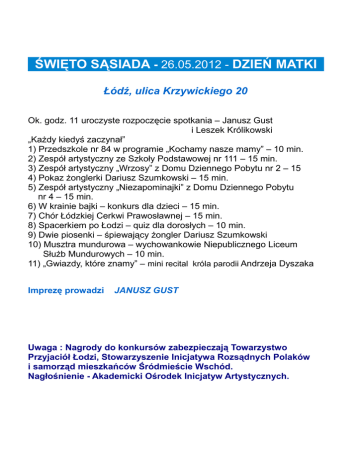 ŚWIĘTO SĄSIADA - 26.05.2012 - DZIEŃ MATKI Łódź, ulica Krzywickiego 20 Ok. godz. 11 uroczyste rozpoczęcie spotkania – Janusz Gust i Leszek Królikowski „Każdy kiedyś zaczynał” 1) Przedszkole nr 84 w programie „Kochamy nasze mamy” – 10 min. 2) Zespół artystyczny ze Szkoły Podstawowej nr 111 – 15 min. 3) Zespół artystyczny „Wrzosy” z Domu Dziennego Pobytu nr 2 – 15 4) Pokaz żonglerki Dariusz Szumkowski – 15 min. 5) Zespół artystyczny „Niezapominajki” z Domu Dziennego Pobytu nr 4 – 15 min. 6) W krainie bajki – konkurs dla dzieci – 15 min. 7) Chór Łódzkiej Cerkwi Prawosławnej – 15 min. 8) Spacerkiem po Łodzi – quiz dla dorosłych – 10 min. 9) Dwie piosenki – śpiewający żongler Dariusz Szumkowski 10) Musztra mundurowa – wychowankowie Niepublicznego Liceum Służb Mundurowych – 10 min. 11) „Gwiazdy, które znamy” – mini recital króla parodii Andrzeja Dyszaka Imprezę prowadzi JANUSZ GUST Uwaga : Nagrody do konkursów zabezpieczają Towarzystwo Przyjaciół Łodzi, Stowarzyszenie Inicjatywa Rozsądnych Polaków i samorząd mieszkańców Śródmieście Wschód. Nagłośnienie - Akademicki Ośrodek Inicjatyw Artystycznych.