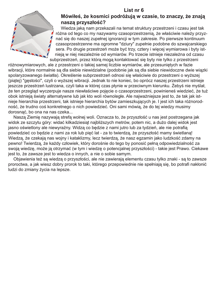List nr 6 Mówiłeś, że kosmici podróżują w czasie, to znaczy, że znają naszą przyszłość? Wiedza jaką nam przekazali na temat struktury przestrzeni i czasu jest tak różna od tego co my nazywamy czasoprzestrzenią, że właściwie należy przyznać się do naszej zupełnej ignorancji w tym zakresie. Po pierwsze kontinuum czasoprzestrzenne ma ogromne "dziury" zupełnie podobne do szwajcarskiego sera. Po drugie przestrzeń może być trzy, cztery i więcej wymiarowa i byty istnieją w niej niezależnie od wymiarów. Po trzecie istnieje niezależna od czasu subprzestrzeń, przez którą mogą kontaktować się byty nie tylko z przestrzeni różnowymiarowych, ale z przestrzeni o takiej samej liczbie wymiarów, ale przesuniętych w fazie wibracji, które normalnie są dla siebie niewidzialne (podobnie jak są dla siebie niewidoczne dwie wiązki spolaryzowanego światła). Określenie subprzestrzeń odnosi się właściwie do przestrzeni o wyższej (piątej) "gęstości", czyli o wyższej wibracji. Jednak to nie koniec, bo oprócz naszej przestrzeni istnieje jeszcze przestrzeń lustrzana, czyli taka w której czas płynie w przeciwnym kierunku. Żebyś nie myślał, że ten przegląd wyczerpuje nasze niewłaściwe pojęcie o czasoprzestrzeni, powinieneś wiedzieć, że tuż obok istnieją światy alternatywne lub jak kto woli równoległe. Ale najważniejsze jest to, że tak jak istnieje hierarchia przestrzeni, tak istnieje hierarchia bytów zamieszkujących je. I jest ich taka różnorodność, że trudno coś konkretnego o nich powiedzieć. Oni sami mówią, że do tej wiedzy musimy dorosnąć, bo ona na nas czeka... Naszą Ziemię nazywają strefą wolnej woli. Oznacza to, że przyszłość u nas jest postrzegana jak widok ze szczytu góry: widać kilkadziesiąt najbliższych metrów, potem nic, a dużo dalej widok jest jasno oświetlony ale niewyraźny. Widzą co będzie z nami jutro lub za tydzień, ale nie potrafią powiedzieć co będzie z nami za rok lub pięć lat - za to twierdzą, że przyszłość mamy świetlaną! Wiedzą, że czekają nas wojny i kataklizmy, lecz twierdzą, że nasz egzamin jako ludzkość zdamy na pewno! Twierdzą, że każdy człowiek, który dorośnie do tego by ponosić pełną odpowiedzialność za swoją wiedzę, może ją otrzymać (w tym i wiedzę o potencjalnej przyszłości) - takie jest Prawo. Ciekawe jest to, że zawsze jest to wiedza o innych, a nie o sobie samym. Objawienia też są wiedzą o przyszłości, ale nie zawierają elementu czasu tylko znaki - są to zawsze proroctwa, a jak wiesz dobry prorok to taki, którego przepowiednie nie spełniają się, bo potrafi nakłonić ludzi do zmiany życia na lepsze.