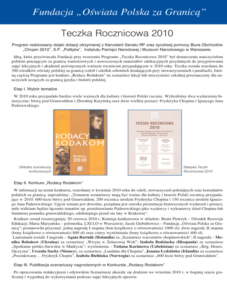 Fundacja „Oświata Polska za Granicą” Teczka Rocznicowa 2010 Program realizowany dzięki dotacji otrzymanej z Kancelarii Senatu RP oraz życzliwej pomocy Biura Obchodów „Chopin 2010”, S.P. „Polityka”, Instytutu Pamięci Narodowej i Muzeum Narodowego w Warszawie. Ideą, która przyświecała Fundacji przy tworzeniu Programu „Teczka Rocznicowa 2010” był dostarczenie nauczycielom polskim pracującym za granicą wartościowych i nowoczesnych materiałów edukacyjnych przydatnych do przygotowania zajęć lekcyjnych i akademii poświęconych ważnym rocznicom przypadającym w 2010 roku. Teczka została rozesłana do 300 ośrodków oświaty polskiej za granicą (szkół i szkółek sobotnich działających przy stowarzyszeniach i parafiach). Istot− ną częścią Programu jest konkurs „Rodacy Rodakom” na scenariusz lekcji lub uroczystości szkolnej przeznaczony dla na− uczycieli uczących za granicą języka i historii polskiej. Etap I. Wybór tematów W 2010 roku przypadało bardzo wiele ważnych dla kultury i historii Polski rocznic. Wybraliśmy dwa wydarzenia hi− storyczne: bitwę pod Grunwaldem i Zbrodnię Katyńską oraz dwie wielkie postaci: Fryderyka Chopina i Ignacego Jana Paderewskiego. Okładka scenariuszy konkursowych Nalepka Teczki Rocznicowej 2010 Etap II. Konkurs „Rodacy Rodakom” W informacji na temat konkursu, rozesłanej w kwietniu 2010 roku do szkół, stowarzyszeń polonijnych oraz konsulatów polskich za granicą, napisaliśmy: „Tematem scenariuszy mają być ważne dla kultury i historii Polski rocznicę przypada− jące w 2010: 600−lecie bitwy pod Grunwaldem, 200 rocznica urodzin Fryderyka Chopina i 150 rocznica urodzin Ignace− go Jana Paderewskiego. Ujęcie tematu jest dowolne, pożądana jest szeroka prezentacja historycznych wydarzeń i postaci; mile widziane będzie łączenie tematów np. przedstawienie Paderewskiego jako wydawcy i wykonawcy dzieł Chopina lub fundatora pomnika grunwaldzkiego, odsłoniętego przed stu laty w Krakowie”. Konkurs został rozstrzygnięty 30 czerwca 2010 r. Komisja konkursowa w składzie: Beata Pietrzyk – Ośrodek Rozwoju Edukacji; Maria Maryańska – polonistka, LXI LO w Warszawie; Jacek Giebułtowicz – Fundacja „Oświata Polska za Gra− nicą”; postanowiła przyznać: jedną nagrodę I stopnia (bon książkowy o równowartości 1000 zł); dwie nagrody II stopnia (bony książkowe o równowartości 800 zł) oraz cztery wyróżnienia (bony książkowe o równowartości 400 zł). Laureatami zostali: I nagroda – Agata Bartnik (Holandia) za „Scenariusz warsztatów chopinowskich”; II nagroda – Mo− nika Babakow (Ukraina) za scenariusz „Wizyta w Żelazowej Woli”; Izabela Bodziacka (Hiszpania) za scenariusz „Spotkanie polsko−litewskie w Madrycie”; wyróżnienia – Tatiana Karimowa (Uzbekistan) za scenariusz „Bóg, Honor, Ojczyzna”, Urszula Suchy (Niemcy), za scenariusz „Laudatio dla Chopina”, Joanna Łydzińska (Irlandia) za scenariusz „Poszukiwany… Fryderyk Chopin”, Izabela Bielińska (Norwegia) za scenariusz „600−lecie bitwy pod Grunwaldem”. Etap III. Publikacja scenariuszy nagrodzonych w Konkursie „Rodacy Rodakom” Po opracowaniu redakcyjnym i edytorskim Scenariusze ukazały się drukiem we wrześniu 2010 r. w bogatej szacie gra− ficznej i wygodnej do wykorzystania podczas zajęć lekcyjnych oprawie. Etap IV. Przygotowanie „Teczki Rocznicowej 2010” Zamierzeniem Fundacji było zebranie możliwie dużego zestawu materiałów edukacyjnych na wszystkie wybrane tema− ty. Ważnym składnikiem Teczki są portrety Fryderyka Chopina i Ignacego Jana Paderewskiego w dużym formacie (48−33 cm) do powieszenia na ścianie w salach lekcyjnych, opracowane przez firmę „Galicja”. Biuro Obchodów „Chopin 2010” ofiarowało nam bardzo dużo cennych materiałów: plakaty Roku Chopinowskiego proj. Andrzeja Pągowskiego; przewodniki J. Weissa „Polskie ścieżki Chopina”, konspekty „Lekcja z Chopinem”, nagrania mu− zyczne (CD „Menu Chopina” dla dzieci), słuchowiska, multimedia i filmy na DVD, a także frisbee z motywem Roku Cho− pinowskiego. Zestaw uzupełniliśmy wartościowym zeszytem edukacyjnym wydanym przez Mulico. Ignacemu Paderewskiego poświęcona była płyta CD z archiwalnymi nagraniami muzyki i wypowiedzi oraz z testamen− tem wielkiego pianisty, kompozytora i męża stanu (Wyd. Casa Grande). „Polityka” ofiarowała nam „Pomocniki historyczne − Grunwald 1410” – zawierające kompendium wiedzy na temat bi− twy grunwaldzkiej. Muzeum Narodowe w Warszawie wznowiło na naszą prośbę reprodukcję „Bitwy pod Grunwaldem” Jana Matejki (w dużym, plakatowym formacie 90−68 cm). Biuro Edukacji Publicznej IPN zgodziło się przekazać nam „po kosztach druku” Teki Edukacyjne „Zbrodnia katyńska 1940”, zawierające bogaty i opracowany na bardzo wysokim poziomie materiał tekstowy, ikonograficzny i multimedialny, stanowiący nieocenioną pomoc dla nauczycieli, zwłaszcza tych pracujących za granicą. Do Teczki dołączyliśmy 4 numery „Naszej Roty” zawierające wiele tekstów na temat przypadających w 2010 r. rocznic i oczywiście Scenariusze nagrodzone w konkursie „Rodacy Rodakom”. Etap V. Wysyłka „Teczki Rocznicowej 2010” Zebrane materiały spakowaliśmy do pudeł o formacie 69−43 cm i wadze 5 kg każde. Adresy 300 ośrodków oświaty pol− skiej za granicą wyselekcjonowaliśmy korzystając ze wszystkich dostępnych nam źródeł informacji: własnej bazy adreso− wej, portali „Polska Szkoła” i „Świat Polonii” oraz dzięki pomocy polskich placówek konsularnych. „Teczki Rocznicowe 2010” zostały wysłane w grudniu 2010 roku. FUNDACJA OŚWIATA POLSKA ZA GRANICĄ Skwer Kard. Wyszyńskiego 9, 01−015 Warszawa www.oswiatapolska.pl 3