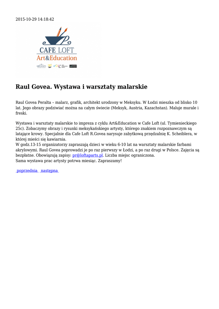 2015-10-29 14:18:42 Raul Govea. Wystawa i warsztaty malarskie Raul Govea Peralta – malarz, grafik, architekt urodzony w Meksyku. W Łodzi mieszka od blisko 10 lat. Jego obrazy podziwiać można na całym świecie (Meksyk, Austria, Kazachstan). Maluje murale i freski. Wystawa i warsztaty malarskie to impreza z cyklu Art&Education w Cafe Loft (ul. Tymienieckiego 25c). Zobaczymy obrazy i rysunki meksykańskiego artysty, którego znakiem rozpoznawczym są latające krowy. Specjalnie dla Cafe Loft R.Govea narysuje zabytkową przędzalnię K. Scheiblera, w której mieści się kawiarnia. W godz.13-15 organizatorzy zapraszają dzieci w wieku 6-10 lat na warsztaty malarskie farbami akrylowymi. Raul Govea poprowadzi je po raz pierwszy w Łodzi, a po raz drugi w Polsce. Zajęcia są bezpłatne. Obowiązują zapisy: [email protected]. Liczba miejsc ograniczona. Sama wystawa prac artysty potrwa miesiąc. Zapraszamy! poprzednia następna