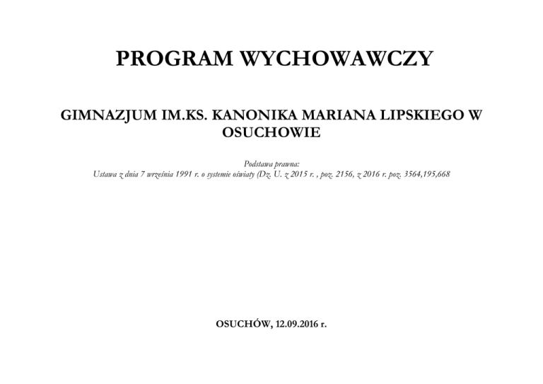 PROGRAM WYCHOWAWCZY GIMNAZJUM IM.KS. KANONIKA MARIANA LIPSKIEGO W OSUCHOWIE Podstawa prawna: Ustawa z dnia 7 września 1991 r. o systemie oświaty (Dz. U. z 2015 r. , poz. 2156, z 2016 r. poz. 3564,195,668 OSUCHÓW, 12.09.2016 r. I. DIAGNOZA środowiska wychowawczego Szkoła nasza jest szkołą wiejską. W związku z rozległym obwodem szkoła zobowiązana jest zorganizować dowożenie uczniów. Znaczne zróżnicowanie sytuacji finansowej rodzin naszych uczniów obliguje szkołę do organizowania pomocy socjalnej uczniom najbardziej potrzebującym. Środowisko wiejskie ma ograniczony dostęp do dóbr kultury. Znaczna część uczniów jest obciążana pracami w gospodarstwie. Część uczniów odczuwa w swoim środowisku rodzinnym brak pozytywnych wzorców zachowań. 2 II. CELE OGÓLNE 1. Rozwój intelektualny ucznia. 2. Kształtowanie postaw. Wychowanie do wartości patriotycznych, moralnych i społecznych. 3. Rozwój fizyczny. 4. Bezpieczeństwo, opieka i pomoc socjalna. 5. Budowanie konstruktywnej współpracy z rodzicami oraz instytucjami lokalnymi. 6. Przygotowanie uczniów do świadomego wyboru szkoły i zawodu. 3 CEL OGÓLNY 1. Rozwój intelektualny ucznia CELE SZCZEGÓŁOWE 1. 2. 3. 4. 5. 6. Przygotowanie ucznia do świadomego wyboru dalszego kierunku kształcenia z uwzględnieniem jego predyspozycji. Rozwijanie umiejętności gromadzenia, segregowania i weryfikowania informacji. Rozbudzanie i rozszerzanie zainteresowań. Kształtowanie umiejętności uczenia się i poszukiwania wiedzy. Kształtowanie nawyku korzystania z dóbr kultury. Rozwijanie umiejętności komunikacyjnych. STANDARDY Uczeń: - poszerza swoje zainteresowania, - umiejętnie korzysta z różnych źródeł informacji, - stosuje w praktyce zdobytą wiedzę i umiejętności, - świadomie dokonuje wyboru dalszej drogi kształcenia zgodnie ze swoim możliwościami i uzdolnieniami, - jest wytrwały w osiąganiu postawionych sobie celów. 4 ZADANIA FORMY REALIZACJI 1.Wskazywanie uczniom czynników - wdrażanie do pracy umysłowej zgodnie z zasadami higieny powodujących sukcesy i porażki pracy umysłowej - pomoc koleżeńska, - zajęcia warsztatowe „Jak się uczyć efektywnie”, - pomoc uczniom w odrabianiu lekcji w świetlicy, - realizacja planów wychowawczych, - monitorowanie osiągnięć uczniów przez wychowawców. 2. Wdrażanie uczniów do świadomego poszerzania wiedzy i zainteresowań wykraczających poza wiedzę programową - wspieranie ich rozwoju. 3.Rozwijanie kompetencji czytelniczych. - korzystanie z technologii informacyjnej, - korzystanie ze źródeł popularnonaukowych, - udział w kółkach zainteresowań, - współpraca z placówkami kulturalnymi naszego regionu, - przedmiotowe konkursy kuratoryjne, - konkursy tematyczne, - wystawy wytworów prac uczniów, - prezentacja osiągnięć szkolnych i pozaszkolnych uczniów, - udział w projektach edukacyjnych, -stymulowanie uczniów zdolnych do poszerzania wiedzy, . indywidualna praca z uczniem zdolnym. - konkursy czytelnicze, - konkursy recytatorskie, - lekcje biblioteczne, - głośne czytanie książek i prasy młodzieżowej na zajęciach świetlicowych, - promowanie ulubionych książek, - wyjazdy do teatru, - udział w formach teatralnych, - wycieczki do muzeów, - koło dziennikarskie. 5 ODPOWIEDZIALNI psycholog TERMIN cały rok wychowawcy bibliotekarz nauczyciele przedmiotów nauczyciele przedmiotów dyrektor szkoły cały rok wychowawcy wychowawcy nauczyciele przedmiot. nauczyciel bibliotekarz dyrektor zgodnie z harmonogramem 4. Stworzenie możliwości do zespołowego rozwiązywania trudności w nauce, wyrównywania i uzupełniania wiedzy. 5. Rozwijanie kompetencji informatycznych. - zespoły wyrównawcze, - zajęcia przygotowujące uczniów klasy III do egzaminu zewnętrznego, - indywidualne konsultacje z nauczycielem, - zespoły koleżeńskie, - odrabianie prac domowych w ramach zajęć świetlicowych, - wskazywanie rodzicom, jak pracować z uczniem, mającym trudności w nauce, - terapia pedagogiczna, - terapia logopedyczna, - pomoc psychologiczno-pedagogiczna dla uczniów z obniżonymi wymaganiami edukacyjnymi, - współpraca z rodzicami i PPP. - zachęcanie do poszukiwania informacji z zastosowaniem nowoczesnych technologii multimedialnych, - dodatkowe zajęcia informatyczne, - wykorzystywanie technologii informatycznych do realizacji zadań obowiązkowych i pozalekcyjnych. 6 wychowawcy samorząd szkolny psycholog nauczyciel - terapeuta logopeda nauczyciel świetlicy cały rok CEL OGÓLNY 2. Kształtowanie postaw. Wychowanie do wartości patriotycznych, moralnych i społecznych. CELE SZCZEGÓŁOWE 1. 2. 3. 4. Kształtowanie u uczniów postaw patriotycznych, moralnych i społecznych. Rozwijanie umiejętności oceny własnych zachowań. Przejawianie postaw tolerancji i zrozumienia dla innych. Kształtowanie szacunku dla środowiska naturalnego. STANDARDY Uczeń: - kształtuje postawę patriotyczną, - ma poczucie tożsamości z małą i dużą ojczyzną, - ma poczucie świadomości wartości kultury i nauki, - rozumie pojęcia: wolność, godność, tolerancja i odpowiedzialność, - kształtuje postawę moralną i społeczną, postępuje zgodnie ogólnie przyjętym systemem wartości, - umiejętnie komunikuje się z innymi ludźmi, - dokonuje samooceny, - dostrzega potrzebę zgodnego współżycia z przyrodą i należycie dba o środowisko naturalne, - wykazuje się tolerancją wobec innych kultur, ras i wyznań, - zachowuje właściwą postawę wobec osób niepełnosprawnych, - prezentuje postawę antydyskryminacyjną, - dba o estetyczny wygląd swój i najbliższego otoczenia, - bezpiecznie korzysta z zasobów Internetu. 7 ZADANIA FORMY REALIZACJI 1 Kształtowanie właściwych postaw - akademie okolicznościowe patriotycznych. - szacunek do symboli narodowych i szkolnych - wycieczki śladami pamięci narodowej - wycieczki regionalne- wycieczka do Sejmu i Senatu, - wycieczka do Pałacu Prezydenckiego, - udział w projektach związanych z ku