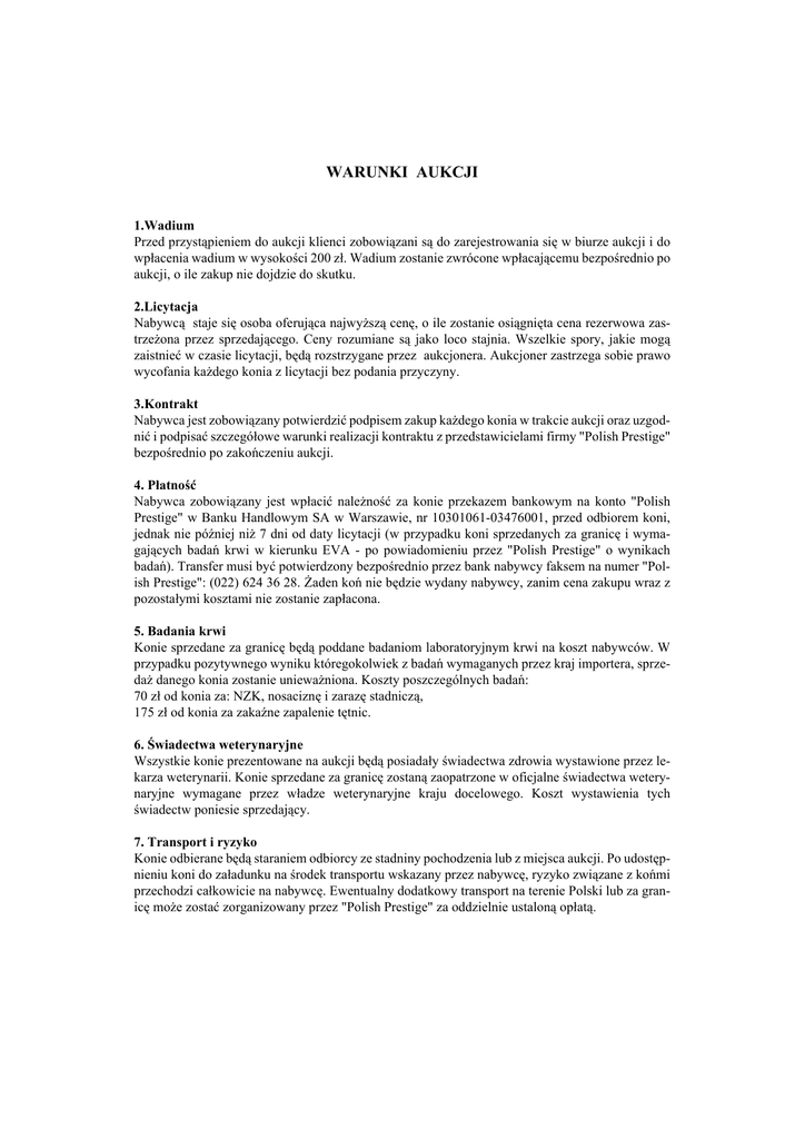SO Bogusławice WARUNKI AUKCJI 1.Wadium Przed przystąpieniem do aukcji klienci zobowiązani są do zarejestrowania się w biurze aukcji i do wpłacenia wadium w wysokości 200 zł. Wadium zostanie zwrócone wpłacającemu bezpośrednio po aukcji, o ile zakup nie dojdzie do skutku. 2.Licytacja Nabywcą staje się osoba oferująca najwyższą cenę, o ile zostanie osiągnięta cena rezerwowa zastrzeżona przez sprzedającego. Ceny rozumiane są jako loco stajnia. Wszelkie spory, jakie mogą zaistnieć w czasie licytacji, będą rozstrzygane przez aukcjonera. Aukcjoner zastrzega sobie prawo wycofania każdego konia z licytacji bez podania przyczyny. 3.Kontrakt Nabywca jest zobowiązany potwierdzić podpisem zakup każdego konia w trakcie aukcji oraz uzgodnić i podpisać szczegółowe warunki realizacji kontraktu z przedstawicielami firmy "Polish Prestige" bezpośrednio po zakończeniu aukcji. 4. Płatność Nabywca zobowiązany jest wpłacić należność za konie przekazem bankowym na konto "Polish Prestige" w Banku Handlowym SA w Warszawie, nr 10301061-03476001, przed odbiorem koni, jednak nie później niż 7 dni od daty licytacji (w przypadku koni sprzedanych za granicę i wymagających badań krwi w kierunku EVA - po powiadomieniu przez "Polish Prestige" o wynikach badań). Transfer musi być potwierdzony bezpośrednio przez bank nabywcy faksem na numer "Polish Prestige": (022) 624 36 28. Żaden koń nie będzie wydany nabywcy, zanim cena zakupu wraz z pozostałymi kosztami nie zostanie zapłacona. 5. Badania krwi Konie sprzedane za granicę będą poddane badaniom laboratoryjnym krwi na koszt nabywców. W przypadku pozytywnego wyniku któregokolwiek z badań wymaganych przez kraj importera, sprzedaż danego konia zostanie unieważniona. Koszty poszczególnych badań: 70 zł od konia za: NZK, nosaciznę i zarazę stadniczą, 175 zł od konia za zakaźne zapalenie tętnic. 6. Świadectwa weterynaryjne Wszystkie konie prezentowane na aukcji będą posiadały świadectwa zdrowia wystawione przez lekarza weterynarii. Konie sprzedane za granicę zostaną zaopatrzone w oficjalne świadectwa weterynaryjne wymagane przez władze weterynaryjne kraju docelowego. Koszt wystawienia tych świadectw poniesie sprzedający. 7. Transport i ryzyko Konie odbierane będą staraniem odbiorcy ze stadniny pochodzenia lub z miejsca aukcji. Po udostępnieniu koni do załadunku na środek transportu wskazany przez nabywcę, ryzyko związane z końmi przechodzi całkowicie na nabywcę. Ewentualny dodatkowy transport na terenie Polski lub za granicę może zostać zorganizowany przez "Polish Prestige" za oddzielnie ustaloną opłatą. 1 SO Bogusławice 8. Katalog Klienci wpłacający wadium otrzymują katalog bezpłatnie. Wszystkie dodatkowe informacje, uzupełnienia i poprawki dotyczące pomyłek i przeoczeń w treści katalogu i ogłaszane oficjalnie podczas aukcji mają moc korygującą. 9. Utrzymanie koni po aukcji Nabywca płaci koszty utrzymania zakupionych koni w wysokości 15 zł dziennie począwszy od następnego dnia po aukcji. 10. Odpowiedzialność za wypadki Organizator nie odpowiada za wypadki, które mogą się wydarzyć w czasie indywidualnego oglądania i dosiadania koni przez kupującego. 2