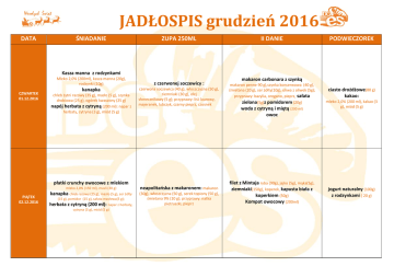 JADŁOSPIS grudzień 2016 DATA ŚNIADANIE ZUPA 250ML II DANIE z czerwonej soczewicy : makaron penne 90 g),szynka konserwowa (40 g), śmietana (20 g), ser żółty(10g), oliwa z oliwek (5g); przyprawy: bazylia, oregano, pieprz, sałata zielona(5g)z pomidorem (20g) PODWIECZOREK Kasza manna z rodzynkami Mleko 2,0% (200ml), kasza manna (20g), rodzynki (10g) CZWARTEK 01.12.2016 kanapka chleb żytni razowy (35 g), masło (5 g), szynka drobiowa (25 g), ogórek kwaszony (25 g) napój herbata z cytryną (200 ml): napar z herbaty, cytryna (3 g), miód (5 g) płatki crunchy owocowe z mlekiem PIĄTEK 02.12.2016 czerwona soczewica (40 g), włoszczyzna (50 g), ziemniaki (30 g), olej słonecznikowy (5 g); przyprawy: liść laurowy, majeranek, lubczyk, czarny pieprz, czosnek mleko 2,0% (150 ml), musli (30 g) neapolitańska z makaronem: makaron kanapka chleb razowy (25 g), masło (5 g), ser żółty (30g), włoszczyzna (50 g), serek topiony (50 g), śmietana 9% (10 g); przyprawy: natka pietruszki, pieprz (15 g), pomidor (15 g), sałata masłowa(5 g); herbata z cytryną (200 ml): napar z herbaty, cytryna (3 g), miód (5 g) makaron carbonara z szynką woda z cytryną i miętą (200 ml) owoc filet z Mintaja ryba (90g), jajko (5g), mąka(5g), ziemniaki(150g), koperek, kapusta biała z koperkiem (50g) Kompot owocowy (200ml) ciasto drożdżowe(80 g) kakao: mleko 2,0% (200 ml), kakao (3 g), miód (5 g) jogurt naturalny (100g) z rodzynkami ( 20 g) JADŁOSPIS grudzień 2016 DATA ŚNIADANIE ZUPA 250ML zacierki na mleku PONIEDZIAŁEK 05.12.2016 mleko 2,0% (200 ml), zacierki (30 g) kanapka chleb wieloziarnisty (25 g), masło (5 g), szynka drobiowa (15 g), ogórek zielony (20 g), sałata (5 g), herbata z cytryną (200 ml): napar z herbaty, cytryna (3 g), miód (5 g) WTOREK 06.12.2016 kakao: mleko 2,0 % (200 ml),kakao (3 g),miód(5 g) włoszczyzna (75 g), ogórek kwaszony (50 g), ziemniaki (100 g),śmietana 9%(10 g), koperek(2g);przyprawy: czarny pieprz rosół z makaronem: włoszczyzna(70 g), indyk(50g), makaron dwujajeczny(30g), natka pietruszki (3 g), przyprawy: lubczyk, kozieradka, jałowiec, ziele angielskie, liść laurowy,pieprz kanapka ŚRODA 07.12.2016 chleb razowy (50 g), masło (5 g); szynka drobiowa jajecznica :jajko (50 g), szczypiorek (5 g),ogórek (20 g) kawa zbożowa (200 ml): mleko 3,2% (200 ml), kawa zbożowa (5 g) grochówka : groch łuskany(40 g), włoszczyzna (50 g), ziemniaki (30 g), olej słonecznikowy (5 g); przyprawy: liść laurowy, majeranek, lubczyk, czarny pieprz, czosnek kasza manna CZWARTEK 08.12.2016 mleko 2,0% (200 ml), kasza manna (20 g), cynamon kanapka chleb razowy (50 g), masło (5 g), ser żółty(10 g), ogórek świeży (10g) herbata z cytryną (200 ml): napar z herbaty, cytryna (3 g), miód (5 g) chałka z konfiturą owocową PIĄTEK 09.12.2016 chałka(30 g), konfitura owocowa (15 g) masło(5g) kakao: mleko 2,0% (200 ml),kakao(3g), miód (5 g) PODWIECZOREK kurczak po marokańsku kurczak (80 g),pomidory ogórkowa z ziemniakami: kanapka grahamka (50 g), masło (5 g), ser żółty (15 g), sałata (5 g), keczup (5 g) II DANIE Jarzynowa włoszczyzna (100 g), ziemniaki (50 g), brukselka (40 g), groszek zielony (30 g) natka pietruszki (5 g), przyprawy: czarny pieprz pieczarkowa z makaronem zwierzaczki: włoszczyzna (80 g), pieczarki (50 g), cebula (5 g), śmietana 9% (10 g), makaron (30 g); przyprawy: czarny pieprz, natka pietruszki (15 g),czosnek (5 g); papryka czerwona (15 g), imbir (5 g), natka pietruszki (2 g);przyprawy: sok z cytryny, kmin rzymski , pieprz; ryż paraboliczny (100 g), banan (100g) kompot wieloowocowy (200 ml) Kotlet schabowy: schab (90g), jajko (5g), bułka(5g), ziemniaki(150g), koperek Buraczki (80g) woda z cytryną i miętą (200 ml) owoc makaron z truskawkami, serem twarogowym półtłustym z jogurtem naturalnym makaron rurka(100 g), truskawki (40 g), ser twarogowy(40 g), jogurt naturalny(30 g); woda z cytryną i miętą (200 ml) udko z kurczaka pieczone: udo z kurczaka (120 g); przyprawy: pieprz, rozmaryn; kasza kuskus(100 g), surówka z czerwonej kapusty i jabłka(50g) ciastko owsiane (60 g) Mandarynka (50 g) ciasto drożdżowe z owocami (100gr) woda z cytryną i miętą (200 ml) Jogurt naturalny (100g) z owocami ( 20 g) woda z cytryną i miętą (200 ml) paluszki rybne mintaj (90g), bułka tarta(10g), jajko(10g), pieprz; ziemniaki z koperkiem: ziemniaki (150 g), koperek (3 g) surówka z kwaszonej kapusty: kwaszona kapusta (60 g), marchew (30 g), jabłko (20 g), oliwa z oliwek (5 g) woda z pomarańczą i miętą(200ml) mini wafle ryżowe z amarantusem (15g), jabłko(40g) JADŁOSPIS grudzień 2016 DATA ŚNIADANIE ZUPA 250ML owsianka PONIEDZIAŁEK 12.12.2016 WTOREK 13.12.2016 grochówka : kanapka groch łuskany(40 g), włoszczyzna (50 g), ziemniaki (30 g), olej słonecznikowy (5 g); przyprawy: liść laurowy, majeranek, lubczyk, czarny pieprz, czosnek jajko na twardo w sosie jogurtowym ze szczypiorkiem: ½ jajka (25 g), sos: jogurt naturalny (10 g), szczypiorek (3 g) kanapkachleb graham (50 g), masło (5 g), pomidor (20g), sałata (5 g) kakao: mleko 2,0% (200 ml), kakao (3 g), miód (5 g) pomidorowa z ryżem: ryż(50g),włoszczyzna (75 g), sok pomidorowy (200 g), śmietana 9% (10 g),ryż (20 g), natka pietruszki (5g); przyprawy: lubczyk, czarny pieprz ŚRODA 14.12.2016 herbata owocowa (200 ml) CZWARTEK 15.12.2016 PIĄTEK 16.12.2016 kanapka chleb wieloziarnisty (50 g), masło (5 g); pasta rybna ze szczypiorkiem: tuńczyk makaron spaghetti cięte (100g), kurczak (50g), marchewka(50g),grzyby mun(5g), sok z cytryny(5ml), sezam (3g), pestki słonecznika(10g), przyprawy: curry, papryka słodka, z białej kapusty (50g) mięso drobiowo-wieprzowe (100 g), jajko (3 g), bułka (7 g), kapusta (80 g), przecier pomidorowy (10 g), mąka (3 g), śmietana 9% (20 g); kompot z owocowy (200 ml) Kurczak z kaszą kuskus na słodko krem z dyni z pestkami ze słonecznika: dynia (100 g) włoszczyzna (50 g), śmietana 9% (10 g); pestki słonecznika (10 g); przyprawy: imbir, curry krupnik