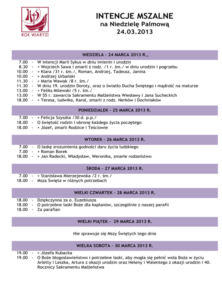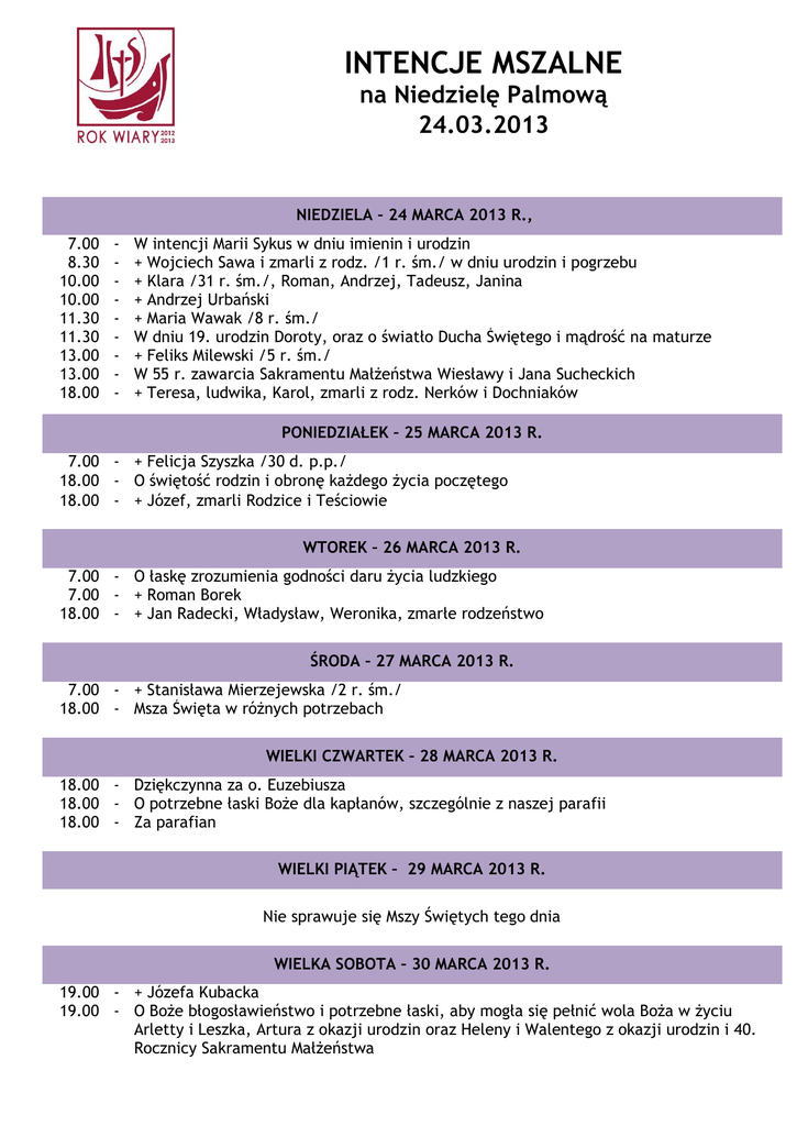 INTENCJE MSZALNE na Niedzielę Palmową 24.03.2013 NIEDZIELA – 24 MARCA 2013 R., 7.00 8.30 10.00 10.00 11.30 11.30 13.00 13.00 18.00 - W intencji Marii Sykus w dniu imienin i urodzin + Wojciech Sawa i zmarli z rodz. /1 r. śm./ w dniu urodzin i pogrzebu + Klara /31 r. śm./, Roman, Andrzej, Tadeusz, Janina + Andrzej Urbański + Maria Wawak /8 r. śm./ W dniu 19. urodzin Doroty, oraz o światło Ducha Świętego i mądrość na maturze + Feliks Milewski /5 r. śm./ W 55 r. zawarcia Sakramentu Małżeństwa Wiesławy i Jana Sucheckich + Teresa, ludwika, Karol, zmarli z rodz. Nerków i Dochniaków PONIEDZIAŁEK – 25 MARCA 2013 R. 7.00 - + Felicja Szyszka /30 d. p.p./ 18.00 - O świętość rodzin i obronę każdego życia poczętego 18.00 - + Józef, zmarli Rodzice i Teściowie WTOREK – 26 MARCA 2013 R. 7.00 - O łaskę zrozumienia godności daru życia ludzkiego 7.00 - + Roman Borek 18.00 - + Jan Radecki, Władysław, Weronika, zmarłe rodzeństwo ŚRODA – 27 MARCA 2013 R. 7.00 - + Stanisława Mierzejewska /2 r. śm./ 18.00 - Msza Święta w różnych potrzebach WIELKI CZWARTEK – 28 MARCA 2013 R. 18.00 - Dziękczynna za o. Euzebiusza 18.00 - O potrzebne łaski Boże dla kapłanów, szczególnie z naszej parafii 18.00 - Za parafian WIELKI PIĄTEK – 29 MARCA 2013 R. Nie sprawuje się Mszy Świętych tego dnia WIELKA SOBOTA – 30 MARCA 2013 R. 19.00 - + Józefa Kubacka 19.00 - O Boże błogosławieństwo i potrzebne łaski, aby mogła się pełnić wola Boża w życiu Arletty i Leszka, Artura z okazji urodzin oraz Heleny i Walentego z okazji urodzin i 40. Rocznicy Sakramentu Małżeństwa