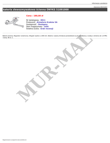 Informacje o produkcie Utworzono 08-03-2017 bateria zlewozmywakowa ścienna ONYKS 51091000 Cena : 180,00 zł Nr katalogowy : 0011 Producent : Armatura Kraków SA Dostępność : Dostępny Stan magazynowy : niski Średnia ocena : brak recenzji M U R -M AL Bateria ścienna. Regulator ceramiczny. Długość wylotu L=200 mm. Bateria i zawory Armatura przewidziane są do współpracy z wodą o ciśnieniu do 1,0 MPa i temp. 90 st. C. Wygenerowano w programie www.oscGold.com