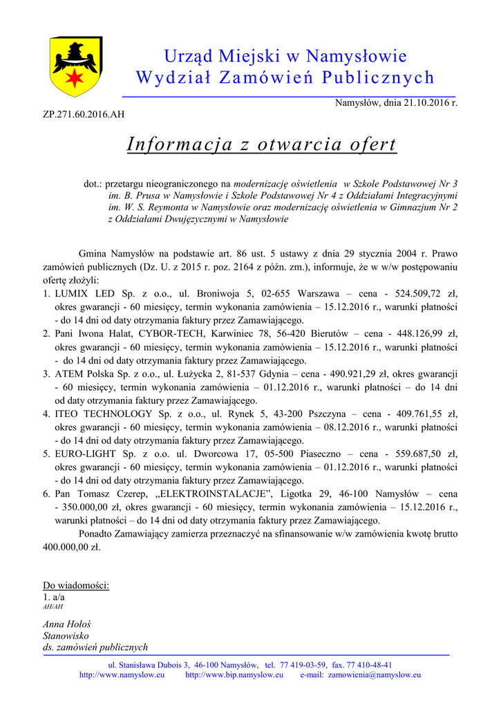 Urząd Miejski w Namysłowie Wydział Zamówień Publicznych Namysłów, dnia 21.10.2016 r. ZP.271.60.2016.AH Informacja z otwarcia ofert dot.: przetargu nieograniczonego na modernizację oświetlenia w Szkole Podstawowej Nr 3 im. B. Prusa w Namysłowie i Szkole Podstawowej Nr 4 z Oddziałami Integracyjnymi im. W. S. Reymonta w Namysłowie oraz modernizację oświetlenia w Gimnazjum Nr 2 z Oddziałami Dwujęzycznymi w Namysłowie Gmina Namysłów na podstawie art. 86 ust. 5 ustawy z dnia 29 stycznia 2004 r. Prawo zamówień publicznych (Dz. U. z 2015 r. poz. 2164 z późn. zm.), informuje, że w w/w postępowaniu ofertę złożyli: 1. LUMIX LED Sp. z o.o., ul. Broniwoja 5, 02-655 Warszawa – cena - 524.509,72 zł, okres gwarancji - 60 miesięcy, termin wykonania zamówienia – 15.12.2016 r., warunki płatności - do 14 dni od daty otrzymania faktury przez Zamawiającego. 2. Pani Iwona Halat, CYBOR-TECH, Karwiniec 78, 56-420 Bierutów – cena - 448.126,99 zł, okres gwarancji - 60 miesięcy, termin wykonania zamówienia – 15.12.2016 r., warunki płatności - do 14 dni od daty otrzymania faktury przez Zamawiającego. 3. ATEM Polska Sp. z o.o., ul. Łużycka 2, 81-537 Gdynia – cena - 490.921,29 zł, okres gwarancji - 60 miesięcy, termin wykonania zamówienia – 01.12.2016 r., warunki płatności – do 14 dni od daty otrzymania faktury przez Zamawiającego. 4. ITEO TECHNOLOGY Sp. z o.o., ul. Rynek 5, 43-200 Pszczyna – cena - 409.761,55 zł, okres gwarancji - 60 miesięcy, termin wykonania zamówienia – 08.12.2016 r., warunki płatności - do 14 dni od daty otrzymania faktury przez Zamawiającego. 5. EURO-LIGHT Sp. z o.o. ul. Dworcowa 17, 05-500 Piaseczno – cena - 559.687,50 zł, okres gwarancji - 60 miesięcy, termin wykonania zamówienia – 01.12.2016 r., warunki płatności - do 14 dni od daty otrzymania faktury przez Zamawiającego. 6. Pan Tomasz Czerep, „ELEKTROINSTALACJE”, Ligotka 29, 46-100 Namysłów – cena - 350.000,00 zł, okres gwarancji - 60 miesięcy, termin wykonania zamówienia – 15.12.2016 r., warunki płatności – do 14 dni od daty otrzymania faktury przez Zamawiającego. Ponadto Zamawiający zamierza przeznaczyć na sfinansowanie w/w zamówienia kwotę brutto 400.000,00 zł. Do wiadomości: 1. a/a AH/AH Anna Hołoś Stanowisko ds. zamówień publicznych ul. Stanisława Dubois 3, 46-100 Namysłów, tel. 77 419-03-59, fax. 77 410-48-41 http://www.namyslow.eu http://www.bip.namyslow.eu e-mail: [email protected]