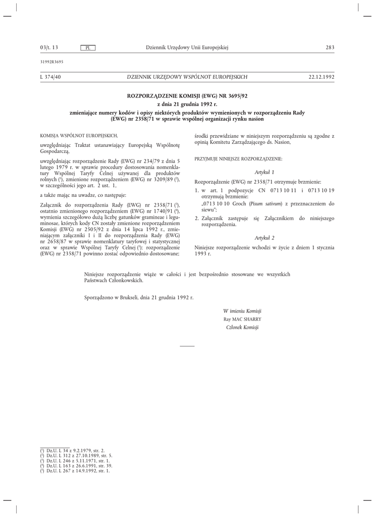 03/t. 13 PL Dziennik Urzędowy Unii Europejskiej 283 31992R3695 L 374/40 22.12.1992 DZIENNIK URZĘDOWY WSPÓLNOT EUROPEJSKICH ROZPORZĄDZENIE KOMISJI (EWG) NR 3695/92 z dnia 21 grudnia 1992 r. zmieniające numery kodów i opisy niektórych produktów wymienionych w rozporządzeniu Rady (EWG) nr 2358/71 w sprawie wspólnej organizacji rynku nasion KOMISJA WSPÓLNOT EUROPEJSKICH, uwzględniając Traktat ustanawiający Europejską Wspólnotę Gospodarczą, uwzględniając rozporządzenie Rady (EWG) nr 234/79 z dnia 5 lutego 1979 r. w sprawie procedury dostosowania nomenklatury Wspólnej Taryfy Celnej używanej dla produktów rolnych (1), zmienione rozporządzeniem (EWG) nr 3209/89 (2), w szczególności jego art. 2 ust. 1, a także mając na uwadze, co następuje: Załącznik do rozporządzenia Rady (EWG) nr 2358/71 (3), ostatnio zmienionego rozporządzeniem (EWG) nr 1740/91 (4), wymienia szczegółowo dużą liczbę gatunków gramineae i leguminosae, których kody CN zostały zmienione rozporządzeniem Komisji (EWG) nr 2505/92 z dnia 14 lipca 1992 r., zmieniającym załączniki I i II do rozporządzenia Rady (EWG) nr 2658/87 w sprawie nomenklatury taryfowej i statystycznej oraz w sprawie Wspólnej Taryfy Celnej (5); rozporządzenie (EWG) nr 2358/71 powinno zostać odpowiednio dostosowane; środki przewidziane w niniejszym rozporządzeniu są zgodne z opinią Komitetu Zarządzającego ds. Nasion, PRZYJMUJE NINIEJSZE ROZPORZĄDZENIE: Artykuł 1 Rozporządzenie (EWG) nr 2358/71 otrzymuje brzmienie: 1. w art. 1 podpozycje CN 0713 10 11 i 0713 10 19 otrzymują brzmienie: „0713 10 10 Groch (Pisum sativum) z przeznaczeniem do siewu”; 2. Załącznik zastępuje się Załącznikiem do niniejszego rozporządzenia. Artykuł 2 Niniejsze rozporządzenie wchodzi w życie z dniem 1 stycznia 1993 r. Niniejsze rozporządzenie wiąże w całości i jest bezpośrednio stosowane we wszystkich Państwach Członkowskich. Sporządzono w Brukseli, dnia 21 grudnia 1992 r. W imieniu Komisji Ray MAC SHARRY Członek Komisji (1) (2) (3) (4) (5) Dz.U. L Dz.U. L Dz.U. L Dz.U. L Dz.U. L 34 z 9.2.1979, str. 2. 312 z 27.10.1989, str. 5. 246 z 5.11.1971, str. 1. 163 z 26.6.1991, str. 39. 267 z 14.9.1992, str. 1. 284 Dziennik Urzędowy Unii Europejskiej PL ZAŁĄCZNIK „ZAŁĄCZNIK Kod CN Opis 1. CERES 1001 90 10 1006 10 10 ex 1204 00 10 ex 1204 00 10 ex 1207 99 10 Triticum spelta L. Oryza sativa L. — odmiany typu japonia — odmiany typu indica 2. OLEAGINEAE Linum usitatissimum L. (len tekstylny) Linum usitatissimum L. (siemię lniane) Cannabis sativa L. (konopie) 1209 29 80 1209 29 80 1209 26 00 1209 29 80 1209 24 00 ex 1209 29 10 3. GRAMINEAE Agrostis canina L. Agrostis gigantea Roth. Agrostis stolonifera L. Agrostis capillaris L. Arrhenatherum elatius (L.) P. Beauv. ex J.S. i K.B. Presl. Dactylis glomerata L. Festuca arundinacea Schreb. Festuca ovina L. Festuca pratensis Huds. Festuca rubra L. Festulolium Lolium multiflorum Lam. Lolium perenne L. — o wysokiej wytrzymałości, późny lub średnio późny — nowe odmiany i inne — o niskiej wytrzymałości, średnio późny, średnio wczesny lub wczesny Lolium × boucheanum Kunth Phleum bertolinii (DC) Phleum pratense L. Poa nemoralis L. Poa pratensis L. Poa palustris i Poa trivialis L. ex ex ex ex ex ex ex ex ex ex ex ex ex ex ex ex 4. LEGUMINOSAE Pisum sativum L. (partim) (groszek polny) Vicia faba L. (partim) (fasola polna) Hedysarum coronarium L. Medicago lupulina L. Medicago sativa L. (odmiany ekologiczne) Medicago sativa L. (odmiany różne) Onobrichis viciifolia Scop. Trifolium alexandrinum L. Trifolium hybridum L. Trifolium incarnatum L. Trifolium pratense L. Trifolium repens L. Trifolium repens L. var. giganteum Trifolium resupinatum L. Vicia sativa L. Vicia villosa Roth.” ex ex ex ex ex ex ex 1209 29 10 1209 29 10 1209 29 10 1209 29 10 1209 29 80 1209 29 10 1209 23 80 1209 23 80 1209 23 11 1209 23 15 ex 1209 29 80 ex 1209 25 00 ex 1209 25 00 ex ex ex ex 0713 10 10 0713 50 10 1209 29 80 1209 29 80 1209 21 00 1209 21 00 1209 29 80 1209 22 00 1209 22 00 1209 22 00 1209 22 00 1209 22 00 1209 22 00 1209 22 00 1209 29 10 1209 29 10 03/t. 13
