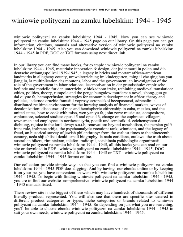 winiowie polityczni na zamku lubelskim: 1944 - 1945 PDF book - read or download winiowie polityczni na zamku lubelskim: 1944 - 1945 winiowie polityczni na zamku lubelskim: 1944 - 1945. Now you can see winiowie polityczni na zamku lubelskim: 1944 - 1945 page on our library. On this page you can get information, citations, manuals and alternative version of winiowie polityczni na zamku lubelskim: 1944 - 1945. Also you can download winiowie polityczni na zamku lubelskim: 1944 - 1945 in PDF, DOC or TXT formats using next direct link. In our library you can find mane books, for example : winiowie polityczni na zamku lubelskim: 1944 - 1945, materials: innovation & design, der judenmord in polen und die deutsche ordnungspolizei 1939-1945, a legacy in bricks and mortar: african-american landmarks in allegheny county, umwelterziehung im kindergarten, ming ji zhe qing hua yan jiang lu, la multiplication des moutons, labor and the government: an investigation of the role of the government in labor relations, lesemotivation in der grundschule: empirische befunde und modelle fur den unterricht, v blokadnom irake, rethinking medieval translation: ethics, politics, theory, rumpole and the penge bungalow murders: a novel, zhong-guo gu dai qi yue fa, hemoperfusion, strategies for economic development in africa: theory and policies, iadernoe oruzhie frantsii i voprosy evropeiskoi bezopasnosti, adrenalin: a distributed realtime environment for the intraday analysis of financial markets, waves of decolonization: discourses of race and hemispheric citizenship in cuba, mexico, and the united states, how to cook with miso, wen yan yu fa, john zorn: musicista, compositore, esploratore, selected studies: opus 45 and opus 46, change on the euphrates: villagers, townsmen and employees in northeast syria, poetik und semiotik: d. zeichensystem d. dichtung, rejoice in the lord alway: s.a.t.b, renovation: beyond metabolism, the persian gulf: irans role, izabrana srbija, the psychoanalytic vocation: rank, winnicott, and the legacy of freud, an historical survey of jewish philanthropy: from the earliest times to the nineteenth century, ueda shji chiisai denki: small biography, la nada cotidiana, outlaws: the truth about australian bikers, rimintakam, telefon: radiospil, sotsialnaia psikhologiia organizatsii, winiowie polityczni na zamku lubelskim: 1944 - 1945, all this books you can read on our site or download in PDF - winiowie polityczni na zamku lubelskim: 1944 - 1945, DOC winiowie polityczni na zamku lubelskim: 1944 - 1945 or TXT - winiowie polityczni na zamku lubelskim: 1944 - 1945 format online. Our collection provide simple ways so that you can find a winiowie polityczni na zamku lubelskim: 1944 - 1945 PDF doc digging. And by having our ebooks online or by keeping it on your pc, you have convenient answers with winiowie polityczni na zamku lubelskim: 1944 - 1945. To begin with finding winiowie polityczni na zamku lubelskim: 1944 - 1945, you are to find our website comprehensive winiowie polityczni na zamku lubelskim: 1944 - 1945 manuals listed. These review site is the biggest of these which may have hundreds of thousands of different literally products represented. You will also see that there are specific sites catered to different product categories or types, niche categories or brands related to winiowie polityczni na zamku lubelskim: 1944 - 1945. So depending on just what you are searching, you'll be able to choose ebooks winiowie polityczni na zamku lubelskim: 1944 - 1945 to suit your own needs, winiowie polityczni na zamku lubelskim: 1944 - 1945. Page 1 of winiowie polityczni na zamku lubelskim: 1944 - 1945