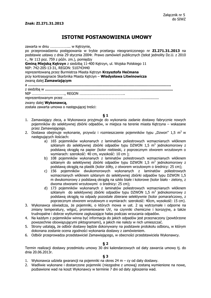 Załącznik nr 5 do SIWZ Znak: ZI.271.31.2013 ISTOTNE POSTANOWIENIA UMOWY zawarta w dniu ………………... w Kętrzynie, po przeprowadzeniu postępowania w trybie przetargu nieograniczonego nr ZI.271.31.2013 na podstawie ustawy z dnia 29 stycznia 2004r. Prawo zamówień publicznych (tekst jednolity Dz.U. z 2010 r., Nr 113 poz. 759 z późn. zm.), pomiędzy Gminą Miejską Kętrzyn z siedzibą 11-400 Kętrzyn, ul. Wojska Polskiego 11 NIP: 742-205-13-31, REGON: 510743440 reprezentowaną przez Burmistrza Miasta Kętrzyn Krzysztofa Hećmana przy kontrasygnacie Skarbnika Miasta Kętrzyn – Władysława Litwinowicza zwaną dalej Zamawiającym a …………………………………………………………………………………………………………. z siedzibą w ………………………………………………………………………............................. NIP ……………………………., REGON ……………………………………….. reprezentowanym przez………………………………………………………………………................. zwany dalej Wykonawcą, została zawarta umowa o następującej treści: §1 1. Zamawiający zleca, a Wykonawca przyjmuje do wykonania zadanie dostawy fabrycznie nowych pojemników do selektywnej zbiórki odpadów, w miejsca na terenie miasta Kętrzyna – wskazane przez Zamawiającego. 2. Dostawa obejmuje wykonanie, przywóz i rozmieszczenie pojemników typu „Dzwon” 1,5 m3 w następujących ilościach: a) 165 pojemników wykonanych z laminatów poliestrowych wzmacnianych włóknem szklanym do selektywnej zbiórki odpadów typu DZWON 1,5 m3 jednokomorowy z podstawą okrągłą na papier (kolor niebieski, z poprzecznym otworem wrzutowym o wymiarach: szerokość: 40 cm, wysokość: 10 cm ); b) 108 pojemników wykonanych z laminatów poliestrowych wzmacnianych włóknem szklanym do selektywnej zbiórki odpadów typu DZWON 1,5 m3 jednokomorowy z podstawą okrągłą na plastik (kolor Ŝółty, z otworem wrzutowym o średnicy: 25 cm); c) 156 pojemników dwukomorowych wykonanych z laminatów poliestrowych wzmacnianych włóknem szklanym do selektywnej zbiórki odpadów typu DZWON 1,5 m dwukomorowy z podstawą okrągłą na szkło białe i kolorowe (kolor biało - zielony, z dwoma otworami wrzutowymi o średnicy: 25 cm); d) 173 pojemników wykonanych z laminatów poliestrowych wzmacnianych włóknem szklanym do selektywnej zbiórki odpadów typu DZWON 1,5 m3 jednokomorowy z podstawą okrągłą na odpady pozostałe zbierane selektywnie (kolor pomarańczowy, z poprzecznym otworem wrzutowym o wymiarach: szerokość: 40cm, wysokość: 15 cm). 3. Wykonawca oświadcza, Ŝe pojemniki, o których mowa w ust. 2 są wytrzymałe i odporne na zmiany temperatury, wilgoć, promieniowanie UV, na czynniki chemiczne i korozyjne, a takŜe trudnopalne i dobrze wytłumione zagłuszające hałas podczas wrzucania odpadów. 4. Na kaŜdym z pojemników winna być informacja do jakich odpadów jest przeznaczony (powtórzone powszechnie obowiązującymi piktogramami), a jakich nie naleŜy w nich umieszczać. 5. Strony ustalają, Ŝe odbiór dostawy będzie dokonywany na podstawie protokołu odbioru, w którym dokonana zostanie ocena zgodności wykonania dostawy z zamówieniem. 6. Odbiór przeprowadza przedstawiciel Zamawiającego, w obecności przedstawiciela Wykonawcy. §2 Termin realizacji dostawy przedmiotu umowy 30 dni kalendarzowych od daty zawarcia umowy tj. do dnia 20.06.2013r. §3 1. Wykonawca udziela gwarancji na pojemniki na okres 24 m – cy od daty dostawy. 2. Wadliwie wykonane i dostarczone pojemniki (niezgodne z umową) zostaną wymienione na nowe, pozbawione wad na koszt Wykonawcy w terminie 7 dni od daty zgłoszenia wad. §4 1. Strony zgodnie ze złoŜonym formularzem ofertowym ustalają wynagrodzenie Wykonawcy na kwotę brutto ………………….. zł (słownie…………………………………………..). 2. Podstawą do wystawienia faktury jest protokół odbioru przedmiotu umowy spisany pomiędzy przedstawieniem Wykonawcy i Zamawiającego. 3. Faktura VAT za wykonaną dostawę płatna będzie przelewem na rachunek Wykonawcy ………………………… w terminie 30 dni od dnia otrzymania prawidłowo wystawionej faktury sporządzonej zgodnie z ust. 2, przy czym za datę zapłaty przyjmuje się datę złoŜenia przez Zamawiającego dyspozycji przelewu w banku na konto Wykonawcy. 4. Zamawiający uprawniony jest do potrącenia z wynagrodzenia Wykonawcy wszelkich naleŜnych jemu na podstawie niniejszej Umowy kar umownych. §5 1. Wykonawca zapłaci Zamawiającemu karę umowną: 1) za zwłokę w dostawie pojemników w wysokości 0,5% wynagrodzenia umownego za kaŜdy dzień zwłoki, 2) za zwłokę w usuwaniu wad stwierdzonych przy odbiorze lub w okresie gwarancji w wysokości 0,5% wynagrodzenia umownego za kaŜdy dzień zwłoki licząc od daty wyznaczonej na usunięcie wad, 3) za odstąpienie od umowy z przyczyn zaleŜnych od Wykonawcy w wysokości 10% wynagrodzenia umownego. 2. Zamawiający zapłaci Wykonawcy karę umowną za odstąpienie od umowy z przyczyn zaleŜnych od Zamawiającego w wysokości 10% wynagrodzenia umownego. 3. Zamawiający ma prawo dochodzić odszkodowania uzupełniającego na zasadach Kodeksu Cywilnego, jeŜeli szkoda przewyŜszy wysokość kar umownych. §6 1. Ze strony Zamawiającego do nadzoru nad realizacją umowy uprawniona jest Monika BepirszczWingorwicz, tel. 89 752-05-91. 2. Ze strony Wykonawcy do nadzoru nad realizacją umowy uprawniona/ny jest: ……………. …………………………, tel. ………………………………….., kom. ………………………………. §7 1. Wszelkie zmiany wprowadzane do umowy wymagają obustronnej zgody oraz formy pisemnej pod rygorem niewaŜności z zastrzeŜeniem art. 144 ustawy Prawo zamówień publicznych. 2. Strony przewidują moŜliwość zmiany postanowień niniejszej umowy w następujących przypadkach: 1) zmian