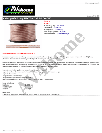 Informacje o produkcie Utworzono 08-03-2017 Kabel głośnikowy LEXTON 2x2.50 Cu-OFC Cena : 3,94 zł Kabel głośnikowy LEXTON 2x2.50 Cu-OFC om e Nr katalogowy : IM K614 Producent : LEXTON Dostępność : Dostępny Stan magazynowy : wysoki Średnia ocena : brak recenzji Profesjonalny przewód głośnikowy wykonany z miedzi beztlenowej wysokiej czystości. Najlepszy wybór do łączenia wysokiej klasy głośników. Do zastosowań domowych, studyjnych, na estradzie lub w systemach car audio. 4h Oferowany przewód głośnikowy wykonany został z bardzo czystej miedzi dla uzyskania jak najlepszych parametrów przesyłu sygnału audio oraz wprowadzenia jak najmniejszej tłumienności, czyli strat na przesyłanym sygnale. Elastyczna wykonana z najlepszego PCV izolacja nie pozwoli na wprowadzenie zakłóceń do przesyłanego przez kabel sygnału audio. AV Prezentowany kabel głośnikowy idealnie nadaje się do instalacji: - sprzętu audio w domu stereo, instalacji multiroom czy systemów kina domowego - sprzętu Car Audio - nagłośnienia estradowego - nagłośnienia systemów radiowęzłowych PA - podłączenia wszystkich możliwych konfiguracji KOLUMNA - WZMACNIACZ Dane techniczne: Średnica: Liczba wiązek: Materiał: 2x2,50 mm 2 Cu OFC Cena - mb (Określoną w metrach długość kabla należy podać w komentarzu do zamówienia.) Wygenerowano w programie www.oscGold.com