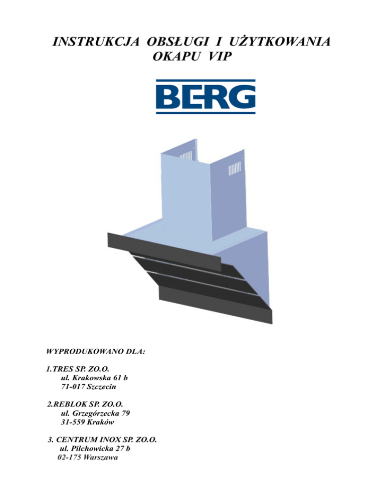 INSTRUKCJA OBSŁUGI I UŻYTKOWANIA OKAPU VIP WYPRODUKOWANO DLA: 1.TRES SP. ZO.O. ul. Krakowska 61 b 71-017 Szczecin 2.REBLOK SP. ZO.O. ul. Grzegórzecka 79 31-559 Kraków 3. CENTRUM INOX SP. ZO.O. ul. Pilchowicka 27 b 02-175 Warszawa SZANOWNI PAŃSTWO Serdecznie gratulujemy Państwu dokonania trafnego wyboru. Nasze urządzenia projektowane i wykonywane są z myślą o spełnieniu Państwa oczekiwań i z pewnością będą stanowić część nowocześnie wyposażonego gospodarstwa domowego. Jesteśmy przekonani, że nowoczesne, funkcjonalne i praktyczne urządzenia, wyprodukowane z najwyższej jakości materiałów, spełnią wszystkie Państwa wymagania. Przed przystąpieniem do montażu i użytkowania zakupionego okapu prosimy o dokładne zapoznanie się z treścią niniejszej instrukcji, a także zawartych w niej reguł bezpieczeństwa użytkowania. Życzymy satysfakcji i zadowolenia z wyboru okapu naszej firmy. 2 1. INFORMACJE OGÓLNE Okap kuchenny VIP został zaprojektowany do usuwania oparów kuchennych w trybie wyciągowym (przewody poprowadzone na zewnątrz) lub w trybie pochłaniacza (obieg wewnętrzny). Jest przeznaczony do mocowania nad gazową lub elektryczną płytą grzewczą. Posiada niezależne oświetlenie oraz turbinę wyciągową z możliwością ustawienia jednej z pięciu prędkości obrotowych. UWAGA: Prosimy zachować dowód zakupu wraz z podstemplowaną kartą gwarancyjną w celu ewentualnej reklamacji. Bez tych dokumentów gwarancja jest nieważna. Producent zrzeka się odpowiedzialności za uszkodzenia i obrażenia powstałe wskutek montażu i użytkowania niezgodnego z instrukcją obsługi zawartą w niniejszym tekście. 2.PARAMETRY TECHNICZNE CECHY CHARAKTRYSTYCZNE VIP Napięcie znamionowe 230V-50Hz Moc ogólna 254 W Moc silnika 250 W Moc oświetlenia 2 x2 W Wydajność max. 800 m3/h Sprzęt klasy drugiej Rodzaj pracy ciągła pod nadzorem 3. INSTALACJA 3.1 USTAWIENIE TRYBU PRACY OKAPU Okap VIP może pracować w dwóch trybach: 1)Wyciągu (Rys.2a) - odprowadzenie powietrza na zewnątrz budynku poprzez połączenie okapu sztywną rurą z tworzywa sztucznego Ø150mm z kanałem wentylacyjnym lub Ø120mm z zastosowaniem redukcji. 2)Pochłaniacza (Rys.2b) - obieg wewnętrzny powietrza, przy użyciu filtrów węglowych (Rys.1). 3 Rys.1 Przy obiegu wewnętrznym konieczne jest zamontowanie filtrów węglowych (Rys.1). Oczyszczone powietrze przez filtry powraca do obiegu otworem wylotowym. Filtry węglowe należy wymieniać nie rzadziej niż raz na 3 miesiące (w zależności od intensywności gotowania). a) WYCIĄG b) POCHŁANIACZ Rys.2 UWAGA: Powietrze z okapu nie powinno być odprowadzane do kanału kominowego służącego do odprowadzania spalin z przyrządów spalających gaz lub inne paliwa. 3.2 PODŁĄCZENIE ELEKTRYCZNE Przed podłączeniem okapu do prądu należy sprawdzić, czy napięcie i częstotliwość prądu zasilającego odpowiada danym podanym na tabliczce znamionowej urządzenia. Okap musi być podłączony do łatwo dostępnego gniazdka. Niedopuszczalne jest usuwanie wtyczki i podłączanie na stałe okapu do zasilania. Okap należy podłączyć do zasilania po niniejszym montażu. 4. MONTAŻ Odległość „A” pomiędzy najniższą częścią okapu nadkuchennego a powierzchnią podtrzymującą naczynia do przyrządzania potraw powinna wynosić min. 65 cm dla kuchni gazowej (Rys.3). W czasie prac montażowych należy przestrzegać obowiązujących przepisów dotyczących 4 odprowadzania powietrza. Gdy okap nadkuchenny jest używany w tym samym czasie co przyrządy spalające gaz lub inne paliwa, pomieszczenie powinno być odpowiednio wentylowane. W celu uzyskania optymalnego odprowadzenia powietrza należy stosować sztywny przewód z tworzywa sztucznego o przekroju Ø150 mm lub Ø120mm po zastosowaniu redukcji. Rys. 3 4.1 CZĘŚCI SKŁADOWE DO MONTAŻU 1- korpus okapu 2- maskownica dolna 3- maskownica teleskopowa górna 4- listwa montażowa do maskownicy 5- dwa kołki rozporowe 10x50 mm z wkrętami 6- dwa kołki rozporowe 5x25 mm z wkrętami 7- dwa wkręty 3,9x6,5 mm 5 6 7 Rys.4 4.2 MONTAŻ KORPUSU OKAPU •Otworzyć szybę pociągając do siebie za dolną krawędź (rys.6) •Zdemontować aluminiowy filtr tłuszczowy (rys.9) •Przyłożyć obudowę okapu do ściany zachowując minimalną odległość 65 cm od dolnej krawędzi okapu do powierzchni podtrzymującej naczynia do przyrządzania potraw na płycie kuchennej (rys.3), •Zaznaczyć na ścianie rozstaw otworów montażowych korpusu okapu, 5 •Wywiercić zaznaczone na ścianie otwory używając wiertła o średnicy odpowiadającej załączonym kołkom rozporowym wraz z wkrętami (5) (rys.4), wbić kołki, a następnie przykręcić do ściany obudowę okapu. •Zamontować filtr tłuszczowy (rys.9). •Zamknąć szybę Rys.5 Rys.6 4.3 MONTAŻ RUR OSŁANIAJĄCYCH •Na przymocowany do ściany okap włożyć rury osłonowe (2) i (3) (rys.4), •Wysunąć wewnętrzną rurę (3) na żądaną wysokość, •Zaznaczyć na ścianie położenie otworów znajdujących się w wewnętrznej rurze osłonowej (3) w celu właściwego usytuowania wysokości montażu wspornika (4), •Przyłożyć wspornik (4) na zaznaczonej wysokości i zaznaczyć otwory do montażu, •Wywiercić na ścianie otwory używając wiertła o średnicy odpowiadającej załączonym kołkom rozporowym (6). Zamocować na ścianie wspornik (4) na zaznaczonej wysokości, •Wysunąć wewnętrzną maskownicę (3) i połączyć wkrętami (7) ze wspornikiem (4). (Rys.6) 6 5. OBSŁUGA 5.1 PANEL STEROWANIA Okap VIP jest wyposażony w sterowanie elektroniczne dotykowe z wyświetlaczem (Rys.7) A B C D E Rys.7 Sterowanie (Rys.7): A – timer B – minus C – wyświetlacz D – plus E – oświetlenie 1. Sterowanie pracy turbiny •Przycisk PLUS umożliwia ustawianie kolejnych prędkości wyciągu (5biegów), •Przytrzymanie przycisku PLUS powoduje ustawienie ostatniego biegu (tryb TURBO), •przycisk MINUS umożliwia zmniejszenie ustawionej