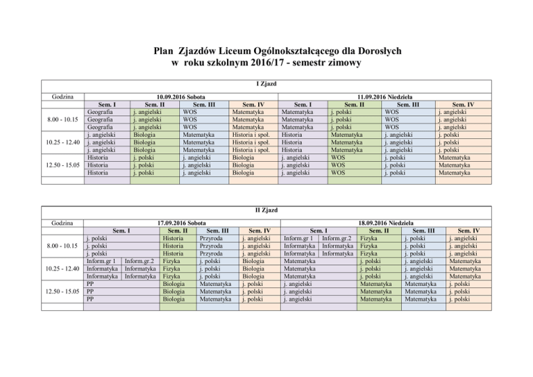 Plan Zjazdów Liceum Ogólnokształcącego dla Dorosłych w roku szkolnym 2016/17 - semestr zimowy I Zjazd Godzina 8.00 - 10.15 10.25 - 12.40 12.50 - 15.05 10.09.2016 Sobota Sem. II Sem. III j. angielski WOS j. angielski WOS j. angielski WOS Biologia Matematyka Biologia Matematyka Biologia Matematyka j. polski j. angielski j. polski j. angielski j. polski j. angielski Sem. I Geografia Geografia Geografia j. angielski j. angielski j. angielski Historia Historia Historia Sem. IV Matematyka Matematyka Matematyka Historia i społ. Historia i społ. Historia i społ. Biologia Biologia Biologia Sem. I Matematyka Matematyka Matematyka Historia Historia Historia j. angielski j. angielski j. angielski 11.09.2016 Niedziela Sem. II Sem. III j. polski WOS j. polski WOS j. polski WOS Matematyka j. angielski Matematyka j. angielski Matematyka j. angielski WOS j. polski WOS j. polski WOS j. polski Sem. IV j. angielski j. angielski j. angielski j. polski j. polski j. polski Matematyka Matematyka Matematyka II Zjazd Godzina 17.09.2016 Sobota Sem. II Sem. III Historia Przyroda Historia Przyroda Historia Przyroda Inform.gr.2 Fizyka j. polski Informatyka Fizyka j. polski Informatyka Fizyka j. polski Biologia Matematyka Biologia Matematyka Biologia Matematyka Sem. I 8.00 - 10.15 10.25 - 12.40 12.50 - 15.05 j. polski j. polski j. polski Inform.gr 1 Informatyka Informatyka PP PP PP Sem. IV j. angielski j. angielski j. angielski Biologia Biologia Biologia j. polski j. polski j. polski Sem. I Inform.gr 1 Inform.gr.2 Informatyka Informatyka Informatyka Informatyka Matematyka Matematyka Matematyka j. angielski j. angielski j. angielski 18.09.2016 Niedziela Sem. II Sem. III Fizyka j. polski Fizyka j. polski Fizyka j. polski j. polski j. angielski j. polski j. angielski j. polski j. angielski Matematyka Matematyka Matematyka Matematyka Matematyka Matematyka Sem. IV j. angielski j. angielski j. angielski Matematyka Matematyka Matematyka j. polski j. polski j. polski III Zjazd Godzina 8.00 - 10.15 10.25 - 12.40 12.50 - 15.05 Sem. I j. polski j. polski j. polski Historia Historia Historia Geografia Geografia Geografia 24.09.2016 Sobota Sem. II Sem. III j. angielski Przyroda j. angielski Przyroda j. angielski Przyroda Biologia j. angielski Biologia j. angielski Biologia j. angielski Matematyka WOS Matematyka WOS Matematyka WOS Sem. IV Historia i społ. Historia i społ. Historia i społ. j. polski j. polski j. polski j. angielski j. angielski j. angielski Sem. I Inform.gr 1 Inform.gr.2 Informatyka Informatyka Informatyka Informatyka PP PP PP Matematyka Matematyka Matematyka 25.09.2016 Niedziela Sem. II Sem. III Fizyka j. angielski Fizyka j. angielski Fizyka j. angielski Chemia Matematyka Chemia Matematyka Chemia Matematyka j. angielski WOS j. angielski WOS j. angielski WOS Sem. IV Biologia Biologia Biologia j. angielski j. angielski j. angielski j. polski j. polski j. polski 02.10.2016 Niedziela Sem. II Sem. III j. polski j. angielski j. polski j. angielski j. polski j. angielski WOS j. polski WOS j. polski WOS j. polski Fizyka WOS Fizyka WOS Fizyka WOS Sem. IV Biologia Biologia Biologia j. angielski j. angielski j. angielski Matematyka Matematyka Matematyka IV Zjazd Godzina 8.00 - 10.15 10.25 - 12.40 12.50 - 15.05 Sem. I Geografia Geografia Geografia Historia Historia Historia j. angielski j. angielski j. angielski 01.10.2016 Sobota Sem. II Sem. III WOS Matematyka WOS Matematyka WOS Matematyka Chemia j. angielski Chemia j. angielski Chemia j. angielski j. polski Przyroda j. polski Przyroda j. polski Przyroda Sem. IV j. angielski j. angielski j. angielski Biologia Biologia Biologia Historia i społ. Historia i społ. Historia i społ. Sem. I Historia Historia Historia PP PP PP Inform.gr 1 Informatyka Informatyka Inform.gr.2 Informatyka Informatyka V Zjazd Godzina 8.00 - 10.15 10.25 - 12.40 12.50 - 15.05 Sem. I j. polski j. polski j. polski Geografia Geografia Geografia Historia Historia Historia 15.10.2016 Sobota Sem. II Sem. III j. angielski WOS j. angielski WOS j. angielski WOS WOS j. angielski WOS j. angielski WOS j. angielski Matematyka Przyroda Matematyka Przyroda Matematyka Przyroda Sem. IV Biologia Biologia Biologia Matematyka Matematyka Matematyka j. angielski j. angielski j. angielski Sem. I j. polski j. polski j. polski Matematyka Matematyka Matematyka Matematyka PP PP 16.10.2016 Niedziela Sem. II Sem. III Chemia Matematyka Chemia Matematyka Chemia Matematyka Matematyka j. polski Matematyka j. polski Matematyka j. polski j. polski j. angielski j. polski j. angielski j. polski j. angielski Sem. IV Biologia Biologia Biologia j. angielski j. angielski j. angielski Matematyka Matematyka Matematyka VI Zjazd Godzina Sem. I 8.00 - 10.15 10.25 12.40 12.50 15.05 PP PP PP Geografia Geografia Geografia j. polski j. polski j. polski 22.10.2016 Sobota Sem. II Sem. III Chemia Przyroda Chemia Przyroda Chemia Przyroda Matematyka WOS Matematyka WOS Matematyka WOS WOS j. polski WOS j. polski WOS j. polski Sem. IV Matematyka Matematyka Matematyka j. polski j. polski j. polski Biologia Biologia Biologia Sem. I Inform.gr 1 Inform.gr.2 Informatyka Informatyka Informatyka Informatyka Matematyka Matematyka Matematyka j. polski j. polski j. polski 23.10.2016 Niedziela Sem. II Sem. III Fizyka j. angielski Fizyka j. angielski Fizyka j. angielski Historia j. polski Historia j. polski Historia j. polski j. polski Matematyka j. polski Matematyka j. polski Matematyka Sem. IV j. polski j. polski j. polski j. angielski j. angielski j. angielski Matematyka Matematyka Matematyka VII Zjazd Godzina 8.00 - 10.15 10.25 - 12.40 12.50 - 15.05 Sem. I j. polski j. polski j. polski Matematyka Matematyka Matematyka Geografia Geografia Geografia 26.11.2016 Sobota Sem. II Sem. III Biologia Matematyka Biologia Matematyka Biologia Matematyka j. angielski j. polski j. angielski j. polski j. angielski j. polski Historia j. angielski Historia j. angielski Historia j. angielski Sem. IV j. angielski j. angielski j. angielski Biologia Biologia Biologia j. polski j