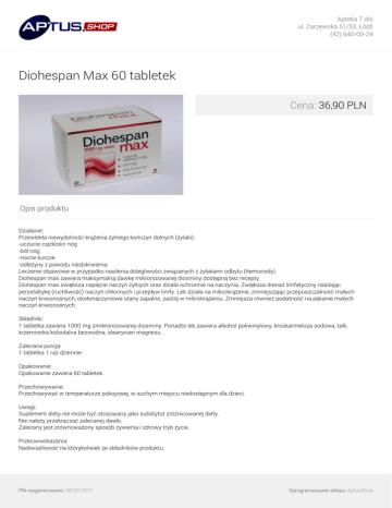 Apteka 7 dni ul. Zarzewska 51/53, Łódź (42) 640-00-24 Diohespan Max 60 tabletek Cena: 36,90 PLN Opis produktu Działanie: Przewlekła niewydolność krążenia żylnego kończyn dolnych (żylaki): -uczucie ciężkości nóg -ból nóg -nocne kurcze -odleżyny z powodu niedokrwienia Leczenie objawowe w przypadku nasilenia dolegliwości związanych z żylakami odbytu (hemoroidy). Diohespan max zawiera maksymalną dawkę mikronizowanej diosminy dostępną bez recepty. Diohespan max zwiększa napięcie naczyń żylnych oraz działa ochronnie na naczynia. Zwiększa drenaż limfatyczny nasilając perystaltykę (ruchliwość) naczyń chłonnych i przepływ limfy. Lek działa na mikrokrążenie, zmniejszając przepuszczalność małych naczyń krwionośnych, okołonaczyniowe stany zapalne, zastój w mikrokrążeniu. Zmniejsza również podatność na pękanie małych naczyń krwionośnych. Składniki: 1 tabletka zawiera 1000 mg zmikronizowanej diosminy. Ponadto lek zawiera alkohol poliwinylowy, kroskarmeloza sodowa, talk, krzemionka koloidalna bezwodna, stearynian magnezu. Zalecana porcja: 1 tabletka 1 raz dziennie. Opakowanie: Opakowanie zawiera 60 tabletek. Przechowywanie: Przechowywać w temperaturze pokojowej, w suchym miejscu niedostępnym dla dzieci. Uwagi: Suplement diety nie może być stosowany jako substytut zróżnicowanej diety. Nie należy przekraczać zalecanej dawki. Zalecany jest zrównoważony sposób żywienia i zdrowy tryb życia. Przeciwwskazania: Nadwrażliwość na którykolwiek ze składników produktu. Plik wygenerowano: 08-03-2017 Powered by TCPDF (www.tcpdf.org) Oprogramowanie sklepu: AptusShop