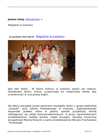 Jesteś tutaj: Aktualności > Wigilijnie w Łowinku 23 grudzień 2013 08:35 Wigilijnie w Łowinku Jest taki dzień… W Domu Kultury w Łowinku zjawili się rodzice, dziadkowie dzieci, którzy uczęszczają do miejscowej szkoły aby uczestniczyć w uroczystej wigilii. Na dobry początek przed seniorami wystąpiły dzieci z grupy teatralnej „Groszki” przy Szkole Podstawowej w Łowinku. Zaprezentowały wspaniałe jasełka, które w piękny sposób przybliżyły klimat zbliżających się świąt bożonarodzeniowych. A przez zgromadzonych przedstawienie zostało bardzo ciepło przyjęte. Oprawę muzyczną przygotował Maciej Różycki a samo przedstawienie Renata Trochowska –Przezdzięk. http://www.pruszcz.mpmedia.pl/blog/1_109-wigilijnie_w_lowinku.html Strona 1/2 Po jasełkach ks. Tadeusz Daniszewski odprawił modlitwę po czym przełamano się opłatkiem składając sobie świąteczno- noworoczne życzenia. Na spotkanie przybyły również władze gminy. Opłatek wigilijny przygotowała Szkoła Podstawowa z Łowinka, Rada Sołecka oraz GOKSiR. Pyszne dania wigilijne i słodkości to dzieło pań z Łowinka i Łaszewa. KP FOTORElACJE drukuj Wróć http://www.pruszcz.mpmedia.pl/blog/1_109-wigilijnie_w_lowinku.html Powered by TCPDF (www.tcpdf.org) Strona 2/2