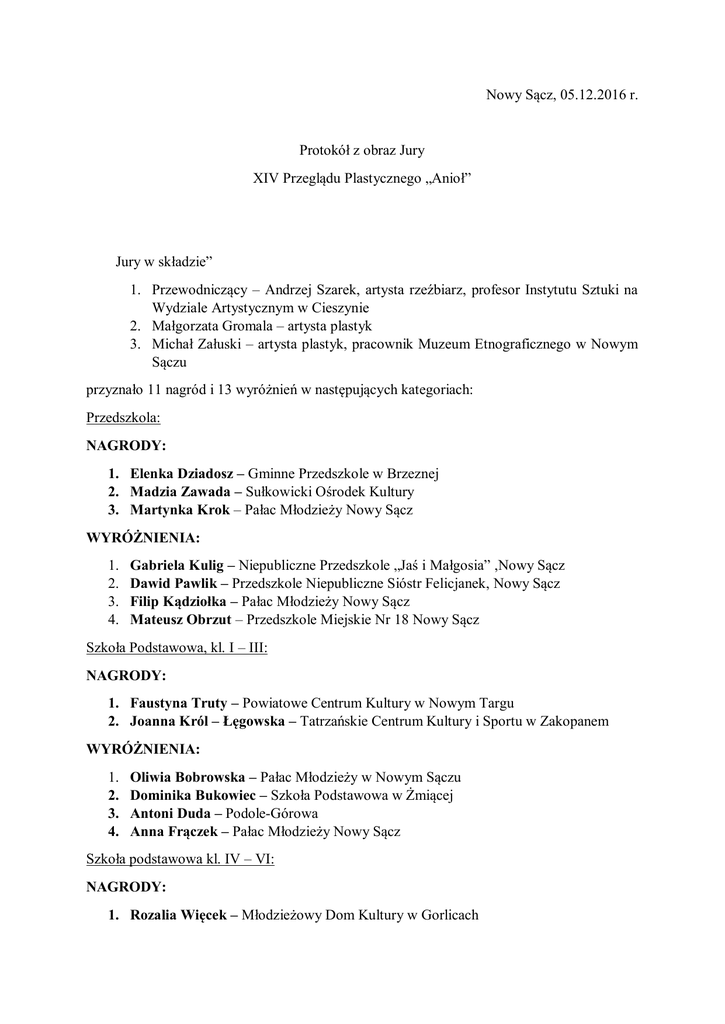 Nowy Sącz, 05.12.2016 r. Protokół z obraz Jury XIV Przeglądu Plastycznego „Anioł” Jury w składzie” 1. Przewodniczący – Andrzej Szarek, artysta rzeźbiarz, profesor Instytutu Sztuki na Wydziale Artystycznym w Cieszynie 2. Małgorzata Gromala – artysta plastyk 3. Michał Załuski – artysta plastyk, pracownik Muzeum Etnograficznego w Nowym Sączu przyznało 11 nagród i 13 wyróżnień w następujących kategoriach: Przedszkola: NAGRODY: 1. Elenka Dziadosz – Gminne Przedszkole w Brzeznej 2. Madzia Zawada – Sułkowicki Ośrodek Kultury 3. Martynka Krok – Pałac Młodzieży Nowy Sącz WYRÓŻNIENIA: 1. 2. 3. 4. Gabriela Kulig – Niepubliczne Przedszkole „Jaś i Małgosia” ,Nowy Sącz Dawid Pawlik – Przedszkole Niepubliczne Sióstr Felicjanek, Nowy Sącz Filip Kądziołka – Pałac Młodzieży Nowy Sącz Mateusz Obrzut – Przedszkole Miejskie Nr 18 Nowy Sącz Szkoła Podstawowa, kl. I – III: NAGRODY: 1. Faustyna Truty – Powiatowe Centrum Kultury w Nowym Targu 2. Joanna Król – Łęgowska – Tatrzańskie Centrum Kultury i Sportu w Zakopanem WYRÓŻNIENIA: 1. 2. 3. 4. Oliwia Bobrowska – Pałac Młodzieży w Nowym Sączu Dominika Bukowiec – Szkoła Podstawowa w Żmiącej Antoni Duda – Podole-Górowa Anna Frączek – Pałac Młodzieży Nowy Sącz Szkoła podstawowa kl. IV – VI: NAGRODY: 1. Rozalia Więcek – Młodzieżowy Dom Kultury w Gorlicach 2. Kinga Matusik – Podole-Górowa 3. Zuzanna Kopka - Młodzieżowy Dom Kultury w Gorlicach WYRÓŻNIENIA: 1. Tymon Popiół – Pałac Młodzieży Nowy Sącz 2. Ewelina Cempa – Szkoła Podstawowa ,Homrzyska Gimnazja: WYRÓŻNIENIA: 1. Kinga Dubiel – Gimnazjum nr… Nowy Sącz 2. Maksymilian Górski – Pałac Młodzieży, Nowy sącz Szkoły Ponadgimnazjalne: NAGRODA: 1. Iza Pulit – II Liceum Ogólnokształcące, Nowy Sącz Osoby niepełnosprawne: NAGRODA: 1. Agnieszka Tomyślak – PM Nowy Sącz 2. Agnieszka Janur – PM, WTZ „Nadzieja” WYRÓŻNIENIE: 1. Elżbieta Bieniek – PM, WTZ „Nadzieja” Jury pozakonkursowo wyróżniło prace zbiorowe osób niepełnosprawnych, wykonane w Ośrodku Terapii Zajęciowej MADA. Laureatów serdecznie zapraszamy na uroczysty finał konkursu do Pałacu Młodzieży, Rynek 14 w dniu 16 grudnia 2016 roku na godzinę 13.00. Gratulujemy!