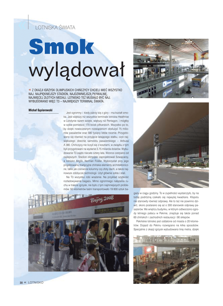 LOTNISKA ŚWIATA Smok wylądował « Z OKAZJI IGRZYSK OLIMPIJSKICH CHIŃCZYCY CHCIELI MIEĆ WSZYSTKO NAJ. NAJPIĘKNIEJSZY STADION, NAJDZIWNIEJSZĄ PŁYWALNIĘ, NAJWIĘCEJ ZŁOTYCH MEDALI. LOTNISKO TEŻ MUSIAŁO BYĆ NAJ. WYBUDOWANO WIĘC T3 – NAJWIĘKSZY TERMINAL ŚWIATA. Michał Gąsiorowski Jest ogromny i kiedy patrzy się z góry – ma kształt smoka. Jest większy niż wszystkie terminale lotniska Heathrow w Londynie razem wzięte, większy niż Pentagon, i mógłby w sobie pomieścić 170 boisk piłkarskich. Wszystko po to, by dzięki nowoczesnym rozwiązaniom obsłużyć 75 milionów pasażerów oraz 580 tysięcy lotów rocznie. Przygotowano się również na przyjęcie latającego statku, czyli największego obecnie samolotu pasażerskiego – Airbusa A 380. Chińczycy nie liczyli się z kosztami, w związku z tym byli przygotowani na wydanie 3,75 miliarda dolarów. Wybudowanie T3 zajęło niecałe cztery lata. Wzorce czerpano od najlepszych. Stadion olimpijski zaprojektowali Szwajcarzy, a lotnisko Anglik, Norman Foster. Wykorzystał przy jego projektowaniu tradycyjne chińskie elementy architektoniczne, takie jak czerwone kolumny czy złoty dach, a także najnowsze zdobycze technologii. Użył głównie szkła i stali. Na T3 wszystko robi wrażenie. Na przykład szybkość rozładowywania bagażu. Mimo ogromnego natężenia ruchu w trakcie igrzysk, nie było z tym najmniejszych problemów. 50 kilometrów taśm transportowało 19 800 sztuk bagażu w ciągu godziny. To w zupełności wystarczyło, by na torbę podróżną czekało się najwyżej kwadrans. Kłopotu nie stanowiły również odprawy. Ale to też nie powinno dziwić, skoro postarano się aż o 300 stanowisk odprawy pasażerów. We wnętrzu budynku, w którym odtworzono ogrody letniego pałacu w Pekinie, znajduje się także ponad 60 chińskich i zachodnich restauracji i 90 sklepów. Pekińskie lotnisko jest oddalone od miasta o 20 kilometrów. Dojazd do Pekinu rozwiązano na kilka sposobów. Specjalnie z okazji igrzysk wybudowano linię metra, dzięki 30 « LOTNISKO LOTNISKA ŚWIATA której do stoicy Chin można dojechać w 20 minut. Do Pekinu kursują również autobusy, prowadzi także pięć dróg ekspresowych. Igrzyska w Pekinie miały być supernowoczesne i zielone. I nie chodziło jedynie o przystrojenie miasta kwiatami, ale o ochronę środowiska. Chińczycy przywiązali do tego wielką wagę, co zostało zauważone. Nawet raporty międzynarodowych komisji ochrony środowiska wyraźnie podkreślały ogromny postęp, jaki w tej dziedzinie zrobili Chińczycy. W tym duchu wybudowano również terminal T3. Jest supernowoczesny i przyjazny środowisku. Wyposażono go w specjalny system, z jednej strony ograniczający zużycie energii, a z drugiej minimalizujący emisję dwutlenku węgla. Na przykład dach lotniska wykonany jest z materiałów, które zimą przepuszczają ciepło energii słonecznej, zapewniając tym samym naturalne ogrzewanie terminalu. Ogromny nacisk położono, oczywiście, na bezpieczeństwo. Amerykanie, oceniając T3 pod tym względem, uznali, że to najbezpieczniejsze lotnisko świata. Zastosowano tam na przykład nowoczesne detektory, które w kilka sekund są w stanie wykryć materiały wybuchowe. Na lotnisku funkcjonują także tradycyjne urządzenia prześwietlające i antywybuchowe roboty. Obawiając się ataków terrorystycznych, stworzono specjalne strefy bezpieczeństwa. Mają za zadanie uniemożliwienie ostrzału lądujących i startujących samolotów. Pekińskie lotnisko robi ogromne wrażenie. A mimo to władze Pekinu zamierzają wyposażyć stolicę w jeszcze jedno, którego budowa rozpocznie się w 2010 roku. Ciekawe, czym jeszcze planują zaskoczyć nas Chińczycy... Fot. AUTOR LOTNISKO » 31