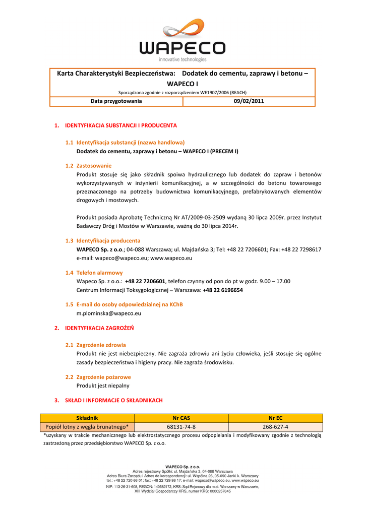Karta Charakterystyki Bezpieczeństwa: Dodatek do cementu, zaprawy i betonu – WAPECO I Sporządzona zgodnie z rozporządzeniem WE1907/2006 (REACH) Data przygotowania 09/02/2011 1. IDENTYFIKACJA SUBSTANCJI I PRODUCENTA 1.1 Identyfikacja substancji (nazwa handlowa) Dodatek do cementu, zaprawy i betonu – WAPECO I (PRECEM I) 1.2 Zastosowanie Produkt stosuje się jako składnik spoiwa hydraulicznego lub dodatek do zapraw i betonów wykorzystywanych w inżynierii komunikacyjnej, a w szczególności do betonu towarowego przeznaczonego na potrzeby budownictwa komunikacyjnego, prefabrykowanych elementów drogowych i mostowych. Produkt posiada Aprobatę Techniczną Nr AT/2009-03-2509 wydaną 30 lipca 2009r. przez Instytut Badawczy Dróg i Mostów w Warszawie, ważną do 30 lipca 2014r. 1.3 Identyfikacja producenta WAPECO Sp. z o.o.; 04-088 Warszawa; ul. Majdańska 3; Tel: +48 22 7206601; Fax: +48 22 7298617 e-mail: [email protected]; www.wapeco.eu 1.4 Telefon alarmowy Wapeco Sp. z o.o.: +48 22 7206601, telefon czynny od pon do pt w godz. 9.00 – 17.00 Centrum Informacji Toksygologicznej – Warszawa: +48 22 6196654 1.5 E-mail do osoby odpowiedzialnej na KChB [email protected] 2. IDENTYFIKACJA ZAGROŻEŃ 2.1 Zagrożenie zdrowia Produkt nie jest niebezpieczny. Nie zagraża zdrowiu ani życiu człowieka, jeśli stosuje się ogólne zasady bezpieczeństwa i higieny pracy. Nie zagraża środowisku. 2.2 Zagrożenie pożarowe Produkt jest niepalny 3. SKŁAD I INFORMACJE O SKŁADNIKACH Składnik Popiół lotny z węgla brunatnego* Nr CAS 68131-74-8 Nr EC 268-627-4 *uzyskany w trakcie mechanicznego lub elektrostatycznego procesu odpopielania i modyfikowany zgodnie z technologią zastrzeżoną przez przedsiębiorstwo WAPECO Sp. z o.o. 4. PIERWSZA POMOC 4.1 Wskazówki ogólne W razie występowania niepokojących objawów, zaleca się kontakt z lekarzem. 4.2 Kontakt z drogami oddechowymi Wyprowadzić poszkodowanego na świeże powietrze i zapewnić mu odpowiednie warunki, aby mógł oczyścić drogi oddechowe. W razie potrzeby skontaktować się z lekarzem. 4.3 Kontakt z oczami Ostrożnie usunąć widoczne drobiny i następnie przepłukać oko roztworem soli fizjologicznej, wodą destylowaną lub ostatecznie wodą bieżącą. Czynność powtarzać wielokrotnie. Nie zamykać oczu. W razie potrzeby skontaktować się z okulistą. 4.4 Kontakt ze skórą Zdjąć zabrudzone ubranie i przemyć dokładnie podrażnione miejsce bieżącą wodą. Na podrażnione miejsce stosować krem lub maść ochronną. W razie potrzeby skontaktować się z dermatologiem. 4.5 W przypadku połknięcia Szybko przepłukać usta wodą a następnie napić się wody. Jeśli poszkodowany jest nieprzytomny, nie podawać mu nic do picia. W razie potrzeby skontaktować się z lekarzem. 5. POSTĘPOWANIE W PRZYPADKU POŻARU Produkt jest niepalny. Jeśli wystąpi pożar w miejscu jego stosowania należy użyć odpowiednich środków gaśniczych: gaśnica proszkowa, pianowa, śniegowa, woda lub dwutlenek węgla. Ratownicy muszą mieć odzież ochronną oraz aparat zabezpieczający drogi oddechowe. 6. POSTĘPOWANIE W PRZYPADKU NIEZAMIERZONEGO UWOLNIENIA DO ŚRODOWISKA 6.1 Zabezpieczenie ludzi Nie wdychać, unikać zanieczyszczenia oczu, stosować odpowiednią odzież, rękawice i okulary ochronne. 6.2 Ochrona środowiska Nie dopuścić do przedostania się produktu do kanalizacji, wód gruntowych i powierzchniowych oraz do rozpostrzenienia się produktu w miejscach do tego nieprzeznaczonych. W razie potrzeby wezwać odpowiednie służby ratownicze. 6.3 Oczyszczanie Produkt należy zebrać na sucho, mechanicznie, najlepiej odkurzyć lub zmieść zanieczyszczoną powierzchnię, nie powodując pylenia. 7. POSTĘPOWANIE Z PREPARATEM I JEGO MAGAZYNOWANIE 7.1 Postępowanie z preparatem Przestrzegać przepisów prawnych w zakresie ochrony i bezpieczenstwa. Unikać kontaktu ze skórą i oczami, nosić pełną odzież ochronną, rękawice i okulary ochronne i unikać wdychania pyłów z produktu. 7.2 Magazynowanie Produkt może być przechowywany w zbiornikach (silosach) stalowych i betonowych, w workach lub miejscach do tego wyznaczonych i zabezpieczonych przed pyleniem, w warunkach powietrzno – suchych, w miejscach niedostępnych dla dzieci. 8. KONTROLA NARAŻENIA I ŚRODKI OCHRONY INDYWIDUALNEJ 8.1 Parametry kontrolne Pyły węgla kamiennego i brunatnego zawierające wolną krystaliczną krzemionkę powyżej 10% do 50% 3 • Pył całkowity: 2 mg/m 3 • Pył respirabilny: 1 mg/m 8.2 Wyposażenie osobiste Przestrzegać ogólne zasady bezpieczeństwa i higieny. Unikać kontaktu ze skórą i oczami. Stosować odpowiednią odzież, rękawice i okulary ochronne. Zabrudzoną odzież po pracy zdjąć. Podczas pracy nie jeść, nie pić i nie palić tytoniu. Przed przerwą i po pracy dokładnie umyć ręce. 8.3 Ochrona dróg oddechowych W przypadku pylenia nosić półmaski ochronne przeciwpyłowe. 8.4 Ochrona skóry Nosić odpowiednią odzież, obuwie i rękawice ochronne. 8.5 Ochrona oczu i twarzy W przypadku pylenia nosić okulary ochronne. 8.6 Dodatkowe informacje Pracodawca powinien zadbać aby stosowane były odpowiednie środki ochrony indywidualnej oraz aby stosowana odzież i obuwie posiadały właściwości ochronne i użytkowe, a także zapewnić odpowiednie ich pranie, konserwację i naprawę. 9. WŁAŚCIWOŚCI FIZYCZNE I CHEMICZNE 9.1 Właściwości fizyczne Lp. Właściwości Jedn. Wymagania 1 Postać - proszek 2 % ≤50 % 4 Miałkość Wskaźnik aktywności pucolanowej k28 k90 Stałość objętości mm 5 Gęstość kg/m 6 Początek wiązania % ≥70 ≥80 ≤10 od 2480 do 3360 ≤120 min+wartość dla cementu porównawczego 3 3 Zawartość naturalnych izotopów promieniotwórczych, wskaźniki aktywności: ≤2.0* f1 Bq/kg ≤400* f2 *Rozporządzenie RM z dnia 03.12.2002 Dz. U. Nr 220 poz.1850 7 Metody badania wg ocena wizualna PN-EN 451-2 PN-EN 450-1 PN-EN 450-1 PN-EN 196-6 PN-EN 450-1 Instrukcja ITB Nr 234/95 9.2 Właściwości chemiczne