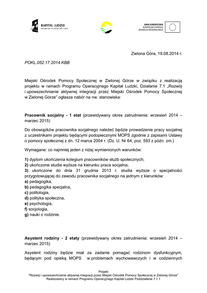 Zielona Góra, 19.08.2014 r. POKL.052.17.2014.KBB Miejski Ośrodek Pomocy Społecznej w Zielonej Górze w związku z realizacją projektu w ramach Programu Operacyjnego Kapitał Ludzki, Działanie 7.1 „Rozwój i upowszechnianie aktywnej integracji przez Miejski Ośrodek Pomocy Społecznej w Zielonej Górze” ogłasza nabór na nw. stanowiska: Pracownik socjalny - 1 etat (przewidywany okres zatrudnienia: wrzesień 2014 – marzec 2015) Do obowiązków pracownika socjalnego należeć będzie prowadzenie pracy socjalnej z uczestnikami projektu będącymi podopiecznymi MOPS zgodnie z zapisami Ustawy o pomocy społecznej z dn. 12 marca 2004 r. (Dz. U. Nr 64, poz. 593 z późn. zm.) Wymagane: co najmniej jeden z niżej wymienionych warunków: 1) dyplom ukończenia kolegium pracowników służb społecznych; 2) ukończone studia wyższe na kierunku praca socjalna; 3) ukończone do dnia 31 grudnia 2013 r. studia wyższe o specjalności przygotowującej do zawodu pracownika socjalnego na jednym z kierunków: a) pedagogika, b) pedagogika specjalna, c) politologia, d) polityka społeczna, e) psychologia, f) socjologia, g) nauki o rodzinie. Asystent rodziny - 2 etaty (przewidywany okres zatrudnienia: wrzesień 2014 – marzec 2015) Asystent rodziny będzie miał za zadanie pomagać rodzinom dysfunkcyjnym, będącym pod opieką MOPS w problemach wychowawczych i w codziennych Projekt "Rozwój i upowszechnianie aktywnej integracji przez Miejski Ośrodek Pomocy Społecznej w Zielonej Górze" Realizowany w ramach Programu Operacyjnego Kapitał Ludzki Poddziałanie 7.1.1 sprawach zgodnie z Ustawą o wspieraniu rodziny i systemie pieczy zastępczej z dnia 9 czerwca 2011 r. (Dz. U. Nr 149, poz. 887 z późn. zm.) Wymagania: 1) wykształcenie wyższe na kierunku pedagogika, psychologia, socjologia, nauki o rodzinie lub praca socjalna lub 2) wykształcenie wyższe na dowolnym kierunku uzupełnione szkoleniem z zakresu pracy z dziećmi lub rodziną i udokumentuje co najmniej roczny staż pracy z dziećmi lub rodziną lub studiami podyplomowymi obejmującymi zakres programowy szkolenia określony na podstawie ust. 3 i udokumentuje co najmniej roczny staż pracy z dziećmi lub rodziną lub 3) wykształcenie średnie i szkolenie z zakresu pracy z dziećmi lub rodziną, a także udokumentuje co najmniej 3-letni staż pracy z dziećmi lub rodziną; ponadto osoba starająca się: 4) nie jest i nie była pozbawiona władzy rodzicielskiej oraz władza rodzicielska nie jest jej zawieszona ani ograniczona; 5) wypełnia obowiązek alimentacyjny - w przypadku gdy taki obowiązek w stosunku do niej wynika z tytułu egzekucyjnego; 6) nie była skazana prawomocnym wyrokiem za umyślne przestępstwo lub umyślne przestępstwo skarbowe. Od kandydatów oczekujemy złożenia wskazanych poniżej dokumentów: 1. Kwestionariusz osobowy dla osoby ubiegającej się o zatrudnienie; 2. CV; 3. List motywacyjny; 4. Kserokopie dyplomów i świadectw potwierdzających kwalifikacje zawodowe; 5. Kserokopie świadectw pracy lub innych dokumentów potwierdzających doświadczenie zawodowe; 6. Oświadczenie o niekaralności za przestępstwa popełnione umyślnie lub umyślne przestępstwo skarbowe; Na CV prosimy o dopisanie następującej klauzuli: "Wyrażam zgodę na przetwarzanie moich danych osobowych zawartych w mojej ofercie pracy dla potrzeb niezbędnych do realizacji procesu rekrutacji (zgodnie z Ustawą z dn. 29.08.97 roku o Ochronie Danych Osobowych (tekst jednolity: Dz. U. 2002 r. Nr 101 poz. 926, ze zm.)". Jednocześnie informujemy wszystkich kandydatów, że bez powyższego oświadczenia oferta pracy nie będzie rozpatrywana. Zastrzegamy sobie prawo do udzielania odpowiedzi wyłącznie na wybrane oferty. Termin, sposób i miejsce składania dokumentów aplikacyjnych: 1. Termin składania dokumentów: do 28.08.2014 r. Projekt "Rozwój i upowszechnianie aktywnej integracji przez Miejski Ośrodek Pomocy Społecznej w Zielonej Górze" Realizowany w ramach Programu Operacyjnego Kapitał Ludzki Poddziałanie 7.1.1 a) sposób składania dokumentów aplikacyjnych: osobiście w zamkniętej kopercie z opisem zawierającym nazwę projektu oraz stanowisko; b) miejsce: Miejski Ośrodek Pomocy Społecznej w Zielonej Górze, ul. Długa 13, 65-401 Zielona Góra, II piętro, pok. 304 (sekretariat); 2. Dodatkowe informacje: 1) aplikacje, które wpłyną do Ośrodka po wskazanym terminie nie będą rozpatrywane; 2) dokumenty aplikacyjne kandydatów, którzy nie zakwalifikowali się do postępowania sprawdzającego będą do odebrania w pok. 309 (kadry Ośrodka). Projekt "Rozwój i upowszechnianie aktywnej integracji przez Miejski Ośrodek Pomocy Społecznej w Zielonej Górze" Realizowany w ramach Programu Operacyjnego Kapitał Ludzki Poddziałanie 7.1.1