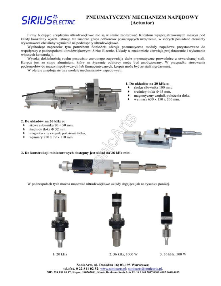 PNEUMATYCZNY MECHANIZM NAPĘDOWY (Actuator) Firmy budujące urządzenia ultradźwiękowe nie są w stanie zaoferować Klientom wyspecjalizowanych maszyn pod kaŜdy konkretny wyrób. Istnieje teŜ znaczna grupa odbiorców posiadających urządzenia, w których posiadane elementy wykonawcze chciałaby wymienić na podzespoły ultradźwiękowe. Wychodząc naprzeciw tym potrzebom SonicArts oferuje pneumatyczne moduły napędowe przystosowane do współpracy z podzespołami ultradźwiękowymi Sirius Electric. Układy te znakomicie ułatwiają projektowanie i wykonanie własnych konstrukcji. Wysoką dokładnością ruchu posuwisto zwrotnego zapewniają dwie pryzmatyczne prowadnice z utwardzanej stali. Korpus jest ze stopu aluminium, który na Ŝyczenie odbiorcy moŜe być anodyzowany. W przypadku stosowania podzespołów do maszyn spoŜywczych lub farmaceutycznych, korpus moŜe być ze stali nierdzewnej. W ofercie znajdują się trzy modele mechanizmów napędowych: 1. Do układów na 20 kHz o: skoku siłownika 100 mm, średnicy tłoka Φ 63 mm, magnetyczny czujnik połoŜenia tłoka, wymiary 630 x 150 x 200 mm. 2. Do układów na 36 kHz o: skoku siłownika 20 ÷ 50 mm, średnicy tłoka Φ 32 mm, magnetyczny czujnik połoŜenia tłoka, wymiary 250 x 79 x 110 mm. 3. Do konstrukcji miniaturowych dostępny jest układ na 36 kHz mini. W podzespołach tych moŜna mocować ultradźwiękowe układy drgające jak na rysunku poniŜej. 1. 20 kHz 2. 36 kHz, 1000 W 3. 36 kHz, 500 W SonicArts, ul. Dorodna 16; 03-195 Warszawa; tel./fax. 0 22 811 02 52; www.sonicarts.pl; [email protected], NIP: 524 159 00 17; Regon: 140762081; Konto Bankowe SonicArts PL 14 1140 2017 0000 4002 0648 4655