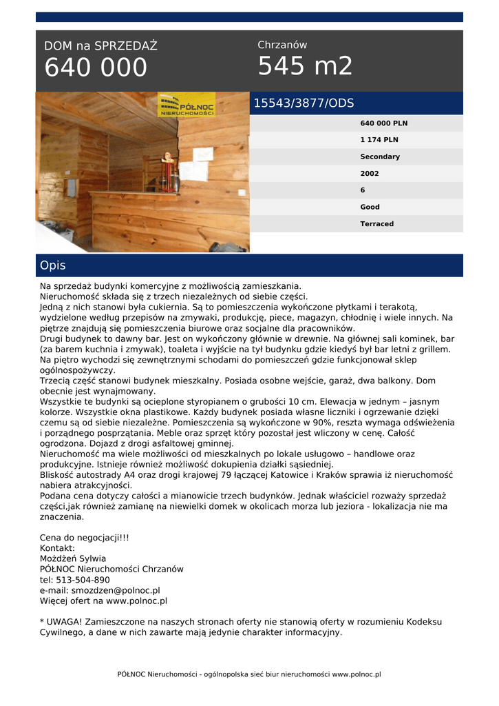 DOM na SPRZEDAŻ 640 000 Chrzanów 545 m2 15543/3877/ODS 640 000 PLN 1 174 PLN Secondary 2002 6 Good Terraced Opis Na sprzedaż budynki komercyjne z możliwością zamieszkania. Nieruchomość składa się z trzech niezależnych od siebie części. Jedną z nich stanowi była cukiernia. Są to pomieszczenia wykończone płytkami i terakotą, wydzielone według przepisów na zmywaki, produkcję, piece, magazyn, chłodnię i wiele innych. Na piętrze znajdują się pomieszczenia biurowe oraz socjalne dla pracowników. Drugi budynek to dawny bar. Jest on wykończony głównie w drewnie. Na głównej sali kominek, bar (za barem kuchnia i zmywak), toaleta i wyjście na tył budynku gdzie kiedyś był bar letni z grillem. Na piętro wychodzi się zewnętrznymi schodami do pomieszczeń gdzie funkcjonował sklep ogólnospożywczy. Trzecią część stanowi budynek mieszkalny. Posiada osobne wejście, garaż, dwa balkony. Dom obecnie jest wynajmowany. Wszystkie te budynki są ocieplone styropianem o grubości 10 cm. Elewacja w jednym – jasnym kolorze. Wszystkie okna plastikowe. Każdy budynek posiada własne liczniki i ogrzewanie dzięki czemu są od siebie niezależne. Pomieszczenia są wykończone w 90%, reszta wymaga odświeżenia i porządnego posprzątania. Meble oraz sprzęt który pozostał jest wliczony w cenę. Całość ogrodzona. Dojazd z drogi asfaltowej gminnej. Nieruchomość ma wiele możliwości od mieszkalnych po lokale usługowo – handlowe oraz produkcyjne. Istnieje również możliwość dokupienia działki sąsiedniej. Bliskość autostrady A4 oraz drogi krajowej 79 łączącej Katowice i Kraków sprawia iż nieruchomość nabiera atrakcyjności. Podana cena dotyczy całości a mianowicie trzech budynków. Jednak właściciel rozważy sprzedaż części,jak również zamianę na niewielki domek w okolicach morza lub jeziora - lokalizacja nie ma znaczenia. Cena do negocjacji!!! Kontakt: Możdżeń Sylwia PÓŁNOC Nieruchomości Chrzanów tel: 513-504-890 e-mail: [email protected] Więcej ofert na www.polnoc.pl * UWAGA! Zamieszczone na naszych stronach oferty nie stanowią oferty w rozumieniu Kodeksu Cywilnego, a dane w nich zawarte mają jedynie charakter informacyjny. PÓŁNOC Nieruchomości - ogólnopolska sieć biur nieruchomości www.polnoc.pl Więcej ofert znajdziesz na naszej stronie www.polnoc.pl * UWAGA! Zamieszczone na naszych stronach oferty nie stanowią oferty w rozumieniu Kodeksu Cywilnego, a dane w nich zawarte mają jedynie charakter informacyjny. Zdzisława Rosińska tel. 500-130-724 email: [email protected] PÓŁNOC Nieruchomości - ogólnopolska sieć biur nieruchomości www.polnoc.pl Powered by TCPDF (www.tcpdf.org)