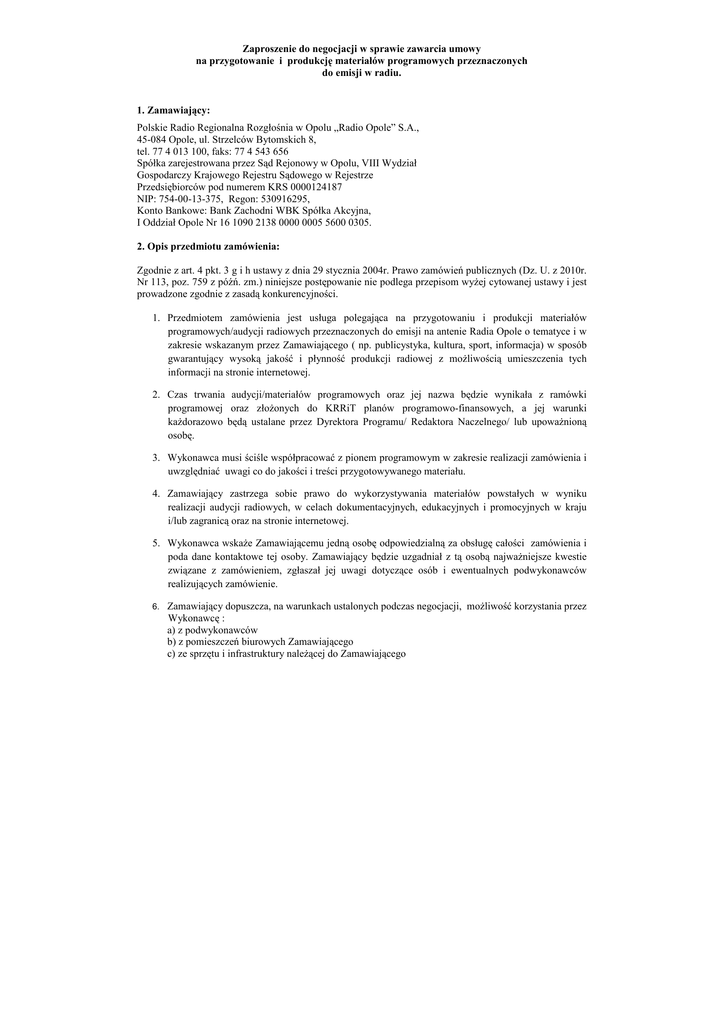 Zaproszenie do negocjacji w sprawie zawarcia umowy na przygotowanie i produkcję materiałów programowych przeznaczonych do emisji w radiu. 1. Zamawiający: Polskie Radio Regionalna Rozgłośnia w Opolu „Radio Opole” S.A., 45-084 Opole, ul. Strzelców Bytomskich 8, tel. 77 4 013 100, faks: 77 4 543 656 Spółka zarejestrowana przez Sąd Rejonowy w Opolu, VIII Wydział Gospodarczy Krajowego Rejestru Sądowego w Rejestrze Przedsiębiorców pod numerem KRS 0000124187 NIP: 754-00-13-375, Regon: 530916295, Konto Bankowe: Bank Zachodni WBK Spółka Akcyjna, I Oddział Opole Nr 16 1090 2138 0000 0005 5600 0305. 2. Opis przedmiotu zamówienia: Zgodnie z art. 4 pkt. 3 g i h ustawy z dnia 29 stycznia 2004r. Prawo zamówień publicznych (Dz. U. z 2010r. Nr 113, poz. 759 z późń. zm.) niniejsze postępowanie nie podlega przepisom wyżej cytowanej ustawy i jest prowadzone zgodnie z zasadą konkurencyjności. 1. Przedmiotem zamówienia jest usługa polegająca na przygotowaniu i produkcji materiałów programowych/audycji radiowych przeznaczonych do emisji na antenie Radia Opole o tematyce i w zakresie wskazanym przez Zamawiającego ( np. publicystyka, kultura, sport, informacja) w sposób gwarantujący wysoką jakość i płynność produkcji radiowej z możliwością umieszczenia tych informacji na stronie internetowej. 2. Czas trwania audycji/materiałów programowych oraz jej nazwa będzie wynikała z ramówki programowej oraz złożonych do KRRiT planów programowo-finansowych, a jej warunki każdorazowo będą ustalane przez Dyrektora Programu/ Redaktora Naczelnego/ lub upoważnioną osobę. 3. Wykonawca musi ściśle współpracować z pionem programowym w zakresie realizacji zamówienia i uwzględniać uwagi co do jakości i treści przygotowywanego materiału. 4. Zamawiający zastrzega sobie prawo do wykorzystywania materiałów powstałych w wyniku realizacji audycji radiowych, w celach dokumentacyjnych, edukacyjnych i promocyjnych w kraju i/lub zagranicą oraz na stronie internetowej. 5. Wykonawca wskaże Zamawiającemu jedną osobę odpowiedzialną za obsługę całości zamówienia i poda dane kontaktowe tej osoby. Zamawiający będzie uzgadniał z tą osobą najważniejsze kwestie związane z zamówieniem, zgłaszał jej uwagi dotyczące osób i ewentualnych podwykonawców realizujących zamówienie. 6. Zamawiający dopuszcza, na warunkach ustalonych podczas negocjacji, możliwość korzystania przez Wykonawcę : a) z podwykonawców b) z pomieszczeń biurowych Zamawiającego c) ze sprzętu i infrastruktury należącej do Zamawiającego 7. Negocjacje prowadzone są z zachowaniem zasady poufności. 8. Przebieg poszczególnych etapów negocjacji (spotkań z wykonawcami w toku negocjacji) będzie utrwalony w formie protokołu z negocjacji. 9. Osoby zainteresowane przystąpieniem do negocjacji prosimy o składanie wniosków – w nieprzekraczalnym terminie do 12.07.2013 do godz. 12.00 w Biurze Zarządu Radia Opole pok. 116. Okres obowiązywania umowy : - od dnia jej zawarcia do 31.12.2015 r. 3. Przedmiot negocjacji : Tematem rozmów negocjacyjnych będą m.in. stawki honoracyjne, prowizja, umiejętność organizacji pracy i zadań, warunki umowy. 4. Miejsce, sposób i termin negocjacji 4.1. Negocjacje odbywać się będą od dnia 15 lipca 2013 roku od godz. 10 :00 w siedzibie Radia Opole S.A. – studio „M”. O ostatecznym terminie i czasie trwania negocjacji Wykonawca zostanie powiadomiony telefonicznie. 4.2. Zamawiający zastrzega sobie prawo do negocjacji warunków współpracy z wybranymi Wykonawcami, a także do rezygnacji z realizacji zadania bez podania przyczyny. 4.3. Zamawiający zastrzega sobie prawo do odpowiedzi tylko na wybraną ofertę. 4.4 Negocjacje prowadzić będzie komisja powołana przez Zarząd Radia Opole S.A. 4.5. Zamawiający prowadzi negocjacje do momentu, gdy jest w stanie określić, w wyniku porównania rozwiązań proponowanych przez wykonawców, jeżeli jest to konieczne, rozwiązanie lub rozwiązania najbardziej spełniające jego potrzeby. O zakończeniu negocjacji i podpisaniu umowy zamawiający niezwłocznie informuje uczestniczących w nim wykonawców. 5. Prawa i Obowiązki : 5.1.Zamawiający ma uprawnienie do ustalenia przydatności do emisji antenowej, daty, czasu emisji przygotowanego przedmiotu umowy lub jej poszczególnego etapu, jak również zastrzega sobie wyłączne prawo do dokonywania przesunięć, zmian tej daty i czasu. 5.2.Zamawiający ma prawo nie wyrazić zgody na emisję przygotowanego przedmiotu umowy lub jej poszczególnego etapu bez prawa zgłoszenia przez Wykonawcę jakichkolwiek roszczeń z tego tytułu. 5.3.W ramach Umowy Wykonawca przekaże Zamawiającemu nieodwołalnie, bezwarunkowo, bez ograniczeń czasowych i w pełnym zakresie autorskie prawa majątkowe dotyczące przedmiotu umowy. Przekazanie autorskich praw majątkowych następuje z chwilą wykonania przedmiotu umowy. 5.4.Po emisji antenowej audycji, Wykonawca zamieszcza audycje na stronie internetowej oraz archiwizuje zgodnie z zasadami obowiązującymi u Zamawiającego. 5.5.Przekazane Zamawiającemu autorskie prawa majątkowe upoważniają go do użytkowania przedmiotu umowy w szczególności na następujących polach eksploatacji: a) utrwalenia i zwielokrotniania - wytwarzanie określoną techniką egzemplarzy materiału, w tym techniką drukarską, reprograficzną, zapisu magnetycznego oraz techniką cyfrową (w postaci nagrań DVD, MP3, MP4, WMA, CD, audiobooki, blu-ray, a także innych podobnych), b) publicznego odtworzenia, c) wprowadzenia do pamięci komputera, d) nadania za pomocą fonii przewodowej i bezprzewodowej, Internetu i mobilnej telefonii e) archiwizacji (w celu wielokrotnych emisji całości lub fragmentów stanowiących artystyczną całość), f) w zakresie obrotu oryginałem albo egzemplarzami, na których materiał utrwalono - wprowadzanie do obrotu, użyczenie lub najem oryginału albo egzemplarzy; g) w zakresie rozpowszechniania materiału w sp