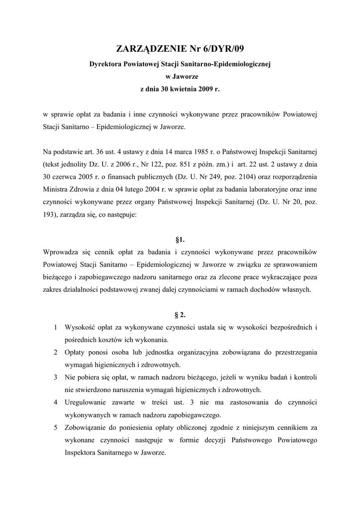 ZARZĄDZENIE Nr 6/DYR/09 Dyrektora Powiatowej Stacji Sanitarno-Epidemiologicznej w Jaworze z dnia 30 kwietnia 2009 r. w sprawie opłat za badania i inne czynności wykonywane przez pracowników Powiatowej Stacji Sanitarno – Epidemiologicznej w Jaworze. Na podstawie art. 36 ust. 4 ustawy z dnia 14 marca 1985 r. o Państwowej Inspekcji Sanitarnej (tekst jednolity Dz. U. z 2006 r., Nr 122, poz. 851 z późn. zm.) i art. 22 ust. 2 ustawy z dnia 30 czerwca 2005 r. o finansach publicznych (Dz. U. Nr 249, poz. 2104) oraz rozporządzenia Ministra Zdrowia z dnia 04 lutego 2004 r. w sprawie opłat za badania laboratoryjne oraz inne czynności wykonywane przez organy Państwowej Inspekcji Sanitarnej (Dz. U. Nr 20, poz. 193), zarządza się, co następuje: §1. Wprowadza się cennik opłat za badania i czynności wykonywane przez pracowników Powiatowej Stacji Sanitarno – Epidemiologicznej w Jaworze w związku ze sprawowaniem bieżącego i zapobiegawczego nadzoru sanitarnego oraz za zlecone prace wykraczające poza zakres działalności podstawowej zwanej dalej czynnościami w ramach dochodów własnych. § 2. 1 Wysokość opłat za wykonywane czynności ustala się w wysokości bezpośrednich i pośrednich kosztów ich wykonania. 2 Opłaty ponosi osoba lub jednostka organizacyjna zobowiązana do przestrzegania wymagań higienicznych i zdrowotnych. 3 Nie pobiera się opłat, w ramach nadzoru bieżącego, jeżeli w wyniku badań i kontroli nie stwierdzono naruszenia wymagań higienicznych i zdrowotnych. 4 Uregulowanie zawarte w treści ust. 3 nie ma zastosowania do czynności wykonywanych w ramach nadzoru zapobiegawczego. 5 Zobowiązanie do poniesienia opłaty obliczonej zgodnie z niniejszym cennikiem za wykonane czynności następuje w formie decyzji Państwowego Powiatowego Inspektora Sanitarnego w Jaworze. § 3. Do kosztów bezpośrednich zalicza się; 1) średnie wynagrodzenie pracowników wykonujących badania laboratoryjne lub inne czynności wraz z pochodnymi od wynagrodzenia; 2) koszty materiałowe, w tym koszty odczynników i innych materiałów pomocniczych; 3) koszty podróży służbowych pracowników, w tym koszty należności przysługujących pracownikom z tytułu podróży służbowych; 4) przeciętne koszty związane z działalnością rzeczoznawców do spraw sanitarnohigienicznych. § 4. Do kosztów pośrednich zalicza się; 1) średnie wynagrodzenie pracowników administracji i obsługi wraz z pochodnymi od wynagrodzenia; 2) koszty usług pocztowych, telekomunikacyjnych i pralniczych; 3) koszty zużycia energii elektrycznej, wody i gazu; 4) koszty zakupu, zużycia i konserwacji aparatury i sprzętu laboratoryjnego; 5) koszty transportu. § 5. Do wynagrodzenia pracowników wykonujących badania i inne czynności średnią stawkę roboczogodziny w poszczególnych sekcjach przyjęto Stacji Sanitarno – Epidemiologicznej w Jaworze, która wynosi 20,03 zł. (załącznik Nr 2) oraz procentowy narzut w wysokości 41,43 % (załącznik Nr 4) co w sumie daje kwotę 28,30 zł. § 6. 1. Czas pracy pracownika niezbędny do wykonywania badania oraz innej czynności stanowiący podstawę ustalenia wysokości wynagrodzenia, o którym mowa w § 5 określa Dyrektor Stacji Sanitarno - Epidemiologicznej lub Kierownik komórki organizacyjnej. 2. Za czas niezbędny do wykonania kontroli lub innych czynności, uważa się czas przeprowadzenia kontroli oraz czas sporządzenia protokołu. 3. Przyjmuje się średnią stawkę za jedną godzinę kontroli wg załącznika Nr 2 (28,30 zł) Przy uczestniczeniu w kontroli większej liczby osób, stawkę za jedną godzinę kontroli zwiększa się o 50%. 4. Czas niezbędny do przygotowania opinii lub wydania decyzji merytorycznej w sprawie, stanowi również podstawę do naliczenia opłaty. 5. Kwoty wynikające z wyliczenia stawek godzinowych, każdorazowo zaokrąglamy do pełnych dziesiątek groszy. § 7. Kontrolę kompleksową z udziałem większej liczby osób przeprowadza się, jeżeli może to przyczynić się do usprawnienia lub skrócenia czasu kontroli. Podstawą wystawienia decyzji płatniczej w przypadku kontroli kompleksowej będzie protokół stwierdzający naruszenie wymagań higienicznych i zdrowotnych w danej dziedzinie. § 8. Nie dolicza się kosztów dojazdu, gdyż koszt utrzymania środka transportu został wliczony do kosztów ogólnych Stacji. § 9. 1. Za wykonane badania oraz inne czynności, Stacja wystawia decyzje płatnicze oraz faktury VAT obciążające opłatami jednostki organizacyjne obowiązane do przestrzegania wymagań higienicznych i zdrowotnych lub na rzecz których wykonano te czynności. 2. Podstawą wystawienia decyzji płatniczej jest: 1) negatywny wynik badania laboratoryjnego, pomiarów, oględzin, badań organoleptycznych, czynności oceniających, określające i porównujące z obowiązującymi normami, wymaganiami itp., bądź protokół kontroli sanitarnej stwierdzający uchybienia higieniczno – zdrowotne kontrolowanej jednostki, w ramach nadzoru bieżącego, 2) wykonanie czynności związanych z oceną dokumentacji projektowej, wizją lokalną związaną z lokalizacją, odbiorem obiektu, wydaniem opinii itp. w ramach nadzoru zapobiegawczego, 3) wydanie decyzji zatwierdzającej zakład lub środek transportu oraz decyzji stwierdzającej spełnienie wymagań koniecznych do zapewnienia higieny w procesie obrotu artykułami alkoholowymi. § 10. Ustala się pełną odpłatność za badania w kierunku prób czystościowych. § 11. Ceny usług wykonywanych na zlecenie, w ramach dochodów własnych, będą cenami umownymi w oparciu o cennik PSSE w Legnicy (umowa z dnia 26 stycznia 2009 r.). § 12. Za nadzór nad realizacją zarządzenia odpowiedzialny jest Kierownik Nadzoru PSSE w Jaworze. § 13. Traci moc Zarządzenie Nr 4/DYR/08 Dyrektora Powiatowej Stacji Sanitarno – Epidemiologicznej w Jaworze z dnia 31.01.2008 r. w sprawie pobierania opłat za badania i inne czynności wykonywane przez pracowników Powiatowej Stacj