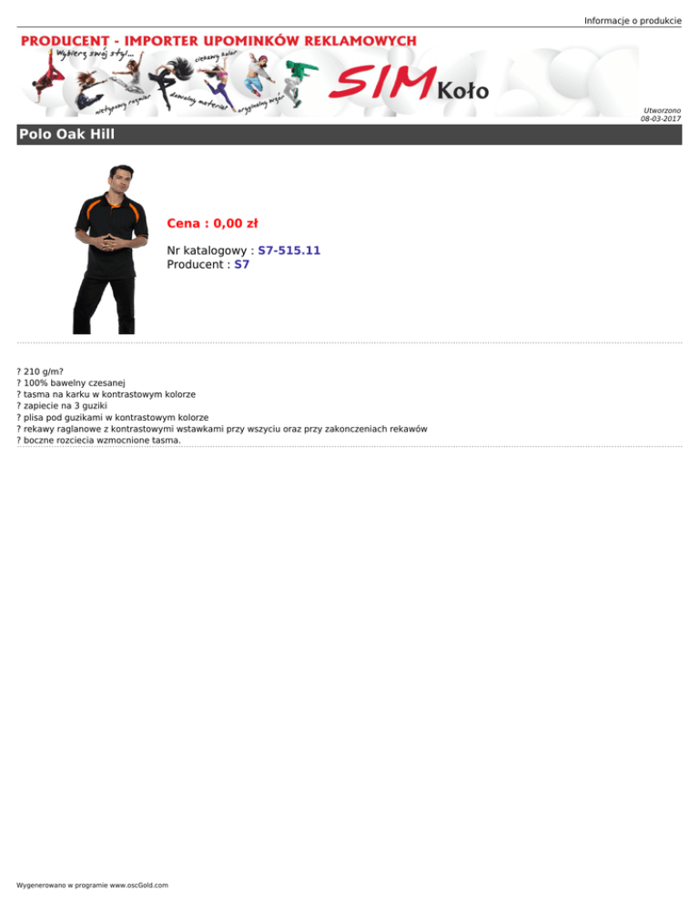 Informacje o produkcie Utworzono 08-03-2017 Polo Oak Hill Cena : 0,00 zł Nr katalogowy : S7-515.11 Producent : S7 ? 210 g/m? ? 100% bawelny czesanej ? tasma na karku w kontrastowym kolorze ? zapiecie na 3 guziki ? plisa pod guzikami w kontrastowym kolorze ? rekawy raglanowe z kontrastowymi wstawkami przy wszyciu oraz przy zakonczeniach rekawów ? boczne rozciecia wzmocnione tasma. Wygenerowano w programie www.oscGold.com