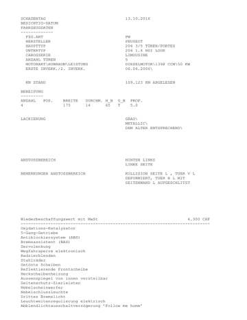 SCHADENTAG BESICHTIG-DATUM FAHRZEUGDATEN ------------FZG.ART HERSTELLER HAUPTTYP UNTERTYP CAROSSERIE ANZAHL TÜREN MOTORART\HUBRAUM\LEISTUNG ERSTE INVERK./2. INVERK. 13.10.2016 PW PEUGEOT 206 3/5 TÜREN/PORTES 206 1.4 HDI LOOK LIMOUSINE 5 DIESELMOTOR\1398 CCM\50 KW 06.06.2006\ KM STAND BEREIFUNG --------ANZAHL POS. 4 109.123 KM ABGELESEN BREITE 175 DURCHM. H_B 14 65 G_B T PROF. 5.0 LACKIERUNG GRAU\ METALLIC\ DEM ALTER ENTSPRECHEND\ ANSTOSSBEREICH HINTEN LINKS LINKE SEITE BEMERKUNGEN ANSTOSSBEREICH KOLLISION SEITE L , TUER V L DEFORMIERT, TUER H L MIT SEITENWAND L AUFGESCHLITZT Wiederbeschaffungswert mit MwSt 4.300 CHF ---------------------------------------------------------------------------Oxydations-Katalysator 5-Gang-Getriebe Antiblockiersystem (ABS) Bremsassistent (BAS) Servolenkung Wegfahrsperre elektronisch Radzierblenden Stahlräder Getönte Scheiben Reflektierende Frontscheibe Heckscheibenheizung Aussenspiegel von innen verstellbar Seitenschutz-Zierleisten Nebelscheinwerfer Nebelschlussleuchte Drittes Bremslicht Leuchtweitenregulierung elektrisch Abblendlichtausschaltverzögerung ’Follow me home’ Heckscheiben-Wisch-/Waschanlage Scheibenwischer vorne mit Intervall Zentralverriegelung mit Fernbedienung 3 Kopfstützen hinten Fahrersitz höhenverstellbar Rücksitzlehne geteilt abklappbar ISOFIX Kindersitzvorrichtung Sportsitze vorne Stoff-Ausstattung Lenkrad höhenverstellbar Airbag Fahrer und Beifahrer Seitenairbags Window-Kopfairbags Airbag Beifahrer deaktivierbar Mittelkonsole Beleuchtetes Handschuhfach Gurtstraffer vorne Höhenverstellbare Gurten vorne Klimaanlage Pollenfilter (Staubfilter) Bordcomputer Digital Uhr Oelstandsanzeige Drehzahlmesser Wassertemperaturanzeige Tageskilometerzähler Wartungsintervall-Anzeige Lichtwarnsummer Elektrische Fensterheber vorne Radiovorbereitung, Antenne, Entstörung und 6 LS Radio/CD mit Lenkradfernbedienung Pack Look Pack Ambiance 4 Leichtmetallfelgen 14J mit Pneu Metallic-Lackierung ---------------------------------------------------------------------------Wiederbeschaffungswert mit MwSt 4.300 CHF 300.300.600.490.-