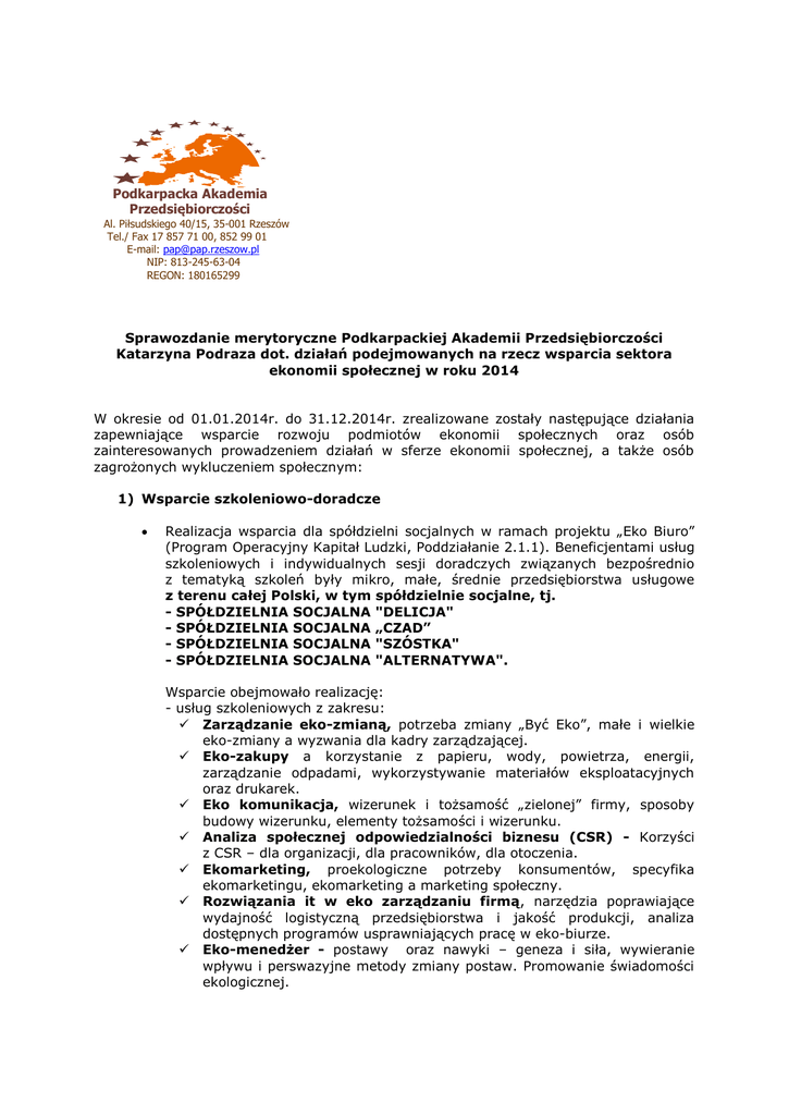 Podkarpacka Akademia Przedsiębiorczości Al. Piłsudskiego 40/15, 35-001 Rzeszów Tel./ Fax 17 857 71 00, 852 99 01 E-mail: [email protected] NIP: 813-245-63-04 REGON: 180165299 Sprawozdanie merytoryczne Podkarpackiej Akademii Przedsiębiorczości Katarzyna Podraza dot. działań podejmowanych na rzecz wsparcia sektora ekonomii społecznej w roku 2014 W okresie od 01.01.2014r. do 31.12.2014r. zrealizowane zostały następujące działania zapewniające wsparcie rozwoju podmiotów ekonomii społecznych oraz osób zainteresowanych prowadzeniem działań w sferze ekonomii społecznej, a także osób zagrożonych wykluczeniem społecznym: 1) Wsparcie szkoleniowo-doradcze Realizacja wsparcia dla spółdzielni socjalnych w ramach projektu „Eko Biuro” (Program Operacyjny Kapitał Ludzki, Poddziałanie 2.1.1). Beneficjentami usług szkoleniowych i indywidualnych sesji doradczych związanych bezpośrednio z tematyką szkoleń były mikro, małe, średnie przedsiębiorstwa usługowe z terenu całej Polski, w tym spółdzielnie socjalne, tj. - SPÓŁDZIELNIA SOCJALNA "DELICJA" - SPÓŁDZIELNIA SOCJALNA „CZAD” - SPÓŁDZIELNIA SOCJALNA "SZÓSTKA" - SPÓŁDZIELNIA SOCJALNA "ALTERNATYWA". Wsparcie obejmowało realizację: - usług szkoleniowych z zakresu: Zarządzanie eko-zmianą, potrzeba zmiany „Być Eko”, małe i wielkie eko-zmiany a wyzwania dla kadry zarządzającej. Eko-zakupy a korzystanie z papieru, wody, powietrza, energii, zarządzanie odpadami, wykorzystywanie materiałów eksploatacyjnych oraz drukarek. Eko komunikacja, wizerunek i tożsamość „zielonej” firmy, sposoby budowy wizerunku, elementy tożsamości i wizerunku. Analiza społecznej odpowiedzialności biznesu (CSR) - Korzyści z CSR – dla organizacji, dla pracowników, dla otoczenia. Ekomarketing, proekologiczne potrzeby konsumentów, specyfika ekomarketingu, ekomarketing a marketing społeczny. Rozwiązania it w eko zarządzaniu firmą, narzędzia poprawiające wydajność logistyczną przedsiębiorstwa i jakość produkcji, analiza dostępnych programów usprawniających pracę w eko-biurze. Eko-menedżer - postawy oraz nawyki – geneza i siła, wywieranie wpływu i perswazyjne metody zmiany postaw. Promowanie świadomości ekologicznej. - usług doradczych z zakresu działań proekologicznych możliwych do wdrożenia w spółdzielniach wraz z przygotowaniem planu wdrażania konkretnych działań proekologicznych, który zawierał opis zidentyfikowanych obszarów, dla których należy przeprowadzić działania proekologiczne oraz wymierne wskaźniki ekonomiczne, które posłużą ocenie skuteczności takiego planu po jego zakończeniu. W ramach projektu w 2014r. dla 20 pracowników z 4 spółdzielni zrealizowano łącznie 140 osobodni szkoleniowych oraz 112 godzin indywidualnych sesji doradczych związanych bezpośrednio z tematyką szkoleń w ramach których powstały 4 plany wdrażania rozwiązań proekologicznych. Realizowane szkolenia oraz doradztwo dot. m.in. obszarów zarządzania organizacją, planowania strategicznego, finansów i marketingu. Zrealizowane wsparcie miało na celu wzrost konkurencyjności beneficjentów oraz miało charakter doradztwa bezpośredniego zgodnego z profilem działalności i potrzeb odbiorców usług. 2) Wsparcie szkoleniowe Realizacja w okresie 03-11/2014r. szkoleń „Monter instalacji sanitarnych”, „Monter zabudowy i robót wykończeniowych w budownictwie”, „Technolog robót wykończeniowych” – łącznie 90 osób bezrobotnych (projekt Wykwalifikowany pracownik budowlany”). Realizacja w okresie 04-06.2014r. usługi szkoleniowej, polegającej na przeprowadzeniu dwóch edycji kursu zawodowego FRYZJER i dwóch edycji kursu zawodowego KOSMETYCZKA dla 60 osób bezrobotnych. Szkolenia realizowane były w ramach projektu „Na naukę nigdy nie jest za późno” współfinansowanego ze środków Unii Europejskiej w ramach Europejskiego Funduszu Społecznego na zlecenie Towarzystwa ALTUM Programy Społeczno – Gospodarcze. Realizacja w okresie 05-06.2014r. szkoleń w ramach projektu „Kobiety inwestują w siebie” (fakturzystka z obsługą magazynu, pomoc księgowej, specjalista ds. kadr i płac, sprzedawca z kasą fiskalną – łącznie 50 osób bezrobotnych. Zorganizowanie i przeprowadzenie w okresie od 05-11/2014r. 25 kursów zawodowych dla łącznie 166 wychowanków Zakładów poprawczych/ Schronisk dla nieletnich z terenu województwa małopolskiego, śląskiego, lubelskiego i świętokrzyskiego. Zrealizowanie w okresie 07-11/2014r. cyklu szkoleń dla osadzonych przebywających w Zakładzie Karnym w Jaśle z zakresu pierwszej pomocy przedmedycznej, języka angielskiego, treningu antystresowego, przeciwdziałania oraz rozwiązywania sytuacji konfliktowych. W przeprowadzonych szkoleniach udział wzięło łącznie 118 więźniów. Szkolenia realizowane na mocy Porozumienia z dnia 22 maja 2014r. dotyczącego zasad wzajemnego współdziałania i współpracy w celu przygotowania osób pozbawionych wolności do życia po zwolnieniu z zakładu karnego. Zrealizowanie w okresie 07-11/2014r. cyklu szkoleń dla osadzonych przebywających w Zakładzie Karnym w Rzeszowie z zakresu pierwszej pomocy przedmedycznej, języka angielskiego, treningu antystresowego, przeciwdziałania oraz rozwiązywania sytuacji konfliktowych. W przeprowadzonych szkoleniach udział wzięło łącznie 118 osadzonych. Szkolenia realizowane na mocy Porozumienia z dnia 22 maja 2014r. dotyczącego zasad wzajemnego współdziałania i współpracy w celu przygotowania osób pozbawionych wolności do życia po zwolnieniu z zakładu karnego. 3) Badania: Przeprowadzenie w lipcu 2014r. badania ankietowego wśród 17 podmiotów ekonomii społecznej z terenu powiatów tj.: dębicki, strzyżowski, ropczycko -sędziszowski, rzeszowski, M. Rzeszów, łańcucki, leżajski, mielecki, kolbuszowski, tarnobrzeski, M. Tarnobrzeg, stalowowolski, niżański, mającego na celu zdiagnozowanie najważniejszych problem