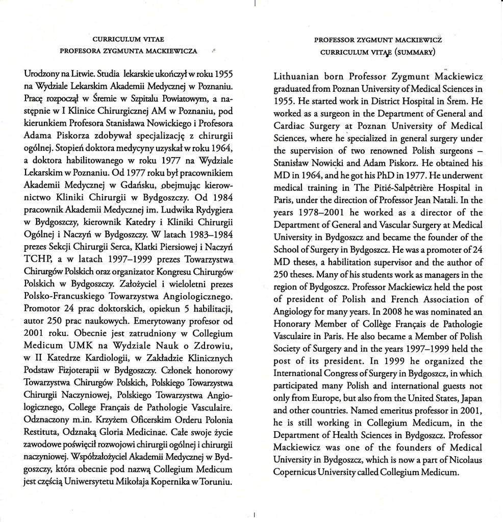 CURRICULUM VITAE PRoFEsoRAZYGMUNTAMACKIE§r,ICZA ł Urodzonynalitwie. Studia lekaŃie ukończyłwroku 1955 naVYdziale l€ka§kim Akademii Medycznej w Poznaniu. Praą wryĄ * Ś.emi" w Szpiulu Powiatowym, a następnie w I Klinice Chirurgicznej AM w Poznaniu, pod kierunkiem Profesora Stanisława Nowickiego i Profesora Adama Piskorza zdobywał specja|izację z chirurgii ogólnej. Stopień doktora medycyny uzyskał w roku l 964, a doktora habilitowanego w roku 1977 na'§?'ydziale Lekarskim w Poznaniu. Od 1977 roku bf pracownikiem Akademii MeĘcznej w Gdarisku, obejmując kierownictwo Kliniki Chirurgii w Bydgoszczy. Od 1984 pracownik Akademii Medycznej im. Ludwika Rydygiera Bydgosz.czy, kierownik Katedry i Kliniki Chirurgii '§7'latach Ogólnej i Nacryń w Bydgosz,cry. 1983-1984 prezes SeĘi Chirurgii Serca, Klatki Piersiowej i Naczyń TCHB a w latach 1997-1999 prezes Towarzysślła Chirurgow Polskich oraz organizator Kongresu Chirurgów Polskich w Bydgoszcry. ZńoĘcie| i wieloletni prezes Polsko-Francuskiego Towarzystwa Angiologicznego. Promotor 24 ptac doktorskich, opiekun 5 habilitacji, autor 250 prac naukowych. Emerytowany profesor od w 2001 roku. Obecnie jest zatrudniony w Collegium Medicum UMK na '§7ydziale Nauk o Zdrowiu, w II Katedrze Kardiologii, w Zakładzie Klinicznych Podsaw Fizjoterapii w Bydgoszey. Członek honorowy Towarzystwa Chirurgów Polskich, Polskiego Towarzlrctwa Chirurgii Naczyniowej, Polskiego Towarąrcnva Argrologicznego, College Fran§ars de Pathologie Vasculaire. Odznaaony m.n. Krzyżrm Oficerskim Orderu Polonia Restituta, Odznaką Gloria Medicinae. Całe swoje zycie zawodowe poświęcil rozwojowi chirurgii ogólnej i óirurgii naczyniowej. §fspoŁałoĄrciel Akademii Medyczrrej w Byd- która obecnie pod nazwą Collegium Medicum jest częściąUniwersytetu Mikołaja Kopernika wToruniu. gosr.czy, PROFESSOR ZYGMUNT MACKIE§rICZ cuRRIcuLuM vrrąn (suur"lłnv) Lithuanian born Professor Zygmunt Mlckiewicz graduated from Poznan lJniversity ofMedical Sciences in 1955.He started work in District Hospital in Śrem. He worked a§ a surgeon in ńe Deparrment of General and Cardiac Surgery at Poznan University of Medical Sciences, where he specialized in general surgery under ńe supervision of two renowned Polish surgeons stanisław Nowicki and Adam piskorz. He obtained his MD in 1964, and he got his PhD in 1977 , He underwent medical training in The Pitić-Salpćtrićre Hospital in Paris, under the direction of ProfessorJean Natali. In ńe years 1978-200l he worked as a director of the Department of General and Vascular Surgery at Medical Universiry in Bydgoszcz and became the founder of ńe School of Surgery in Bydgosze,. He was a promoter of 24 MD ńeses, a habilitation supervisor and the auńor of 250 ńeses. Many of his students work as managers in ńe region of Bydgoęcz. Professor Mackiewicz held the post of president of Polish and French Association of Angiolog;r for manyyears. In 2008 he was nominated an Honorary Member of Collćge Franęais de Pathologie vasculaire in paris. He also became a Member of polish Society of Surgery and in ńe years L997-L999 held ńe post of its president. In 1999 he organized the International Congress of Surgery in B ydgoszcz,in which partiĘated many Polish and international guests not only from Europe, but also from ńe United States, Japan and ońer countries. Named emęritus professor in 2001, he is still working in Collegium Medicum, in the Department of Healń Sciences in Bydgoszcz. Professor Mackiewicz was one of the founders of Medical University in Bydgoszcz, which is now a part of Nicolaus Copernicus Universiry called Collegium Medicum.