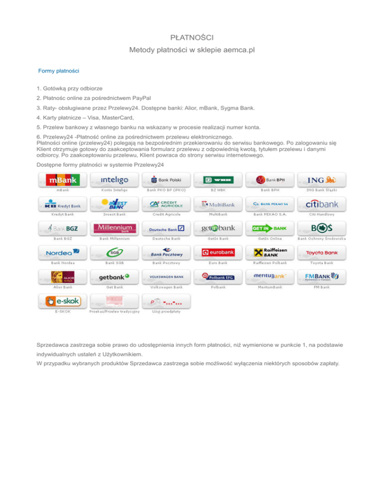 PŁATNOŚCI Metody płatności w sklepie aemca.pl Formy płatności 1. Gotówką przy odbiorze 2. Płatnośc online za pośrednictwem PayPal 3. Raty- obsługiwane przez Przelewy24. Dostępne banki: Alior, mBank, Sygma Bank. 4. Karty płatnicze – Visa, MasterCard, 5. Przelew bankowy z własnego banku na wskazany w procesie realizacji numer konta. 6. Przelewy24 -Płatność online za pośrednictwem przelewu elektronicznego. Płatności online (przelewy24) polegają na bezpośrednim przekierowaniu do serwisu bankowego. Po zalogowaniu się Klient otrzymuje gotowy do zaakceptowania formularz przelewu z odpowiednią kwotą, tytułem przelewu i danymi odbiorcy. Po zaakceptowaniu przelewu, Klient powraca do strony serwisu internetowego. Dostępne formy płatności w systemie Przelewy24 Sprzedawca zastrzega sobie prawo do udostępnienia innych form płatności, niż wymienione w punkcie 1, na podstawie indywidualnych ustaleń z Użytkownikiem. W przypadku wybranych produktów Sprzedawca zastrzega sobie możliwość wyłączenia niektórych sposobów zapłaty.