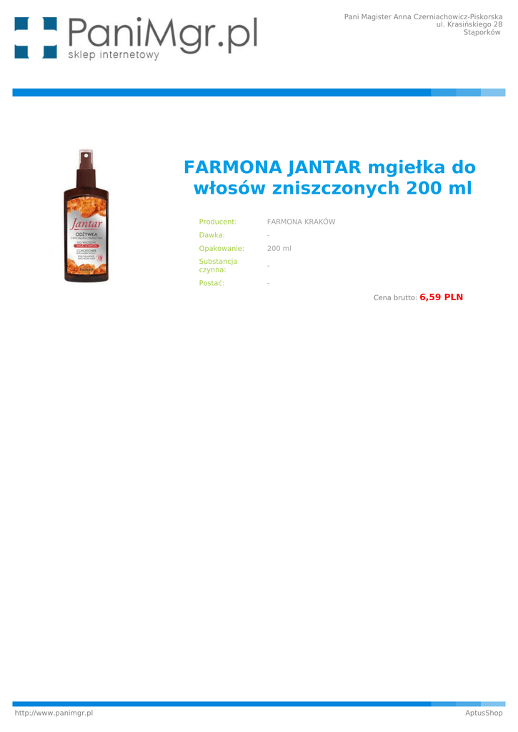 Pani Magister Anna Czerniachowicz-Piskorska ul. Krasińskiego 2B Stąporków FARMONA JANTAR mgiełka do włosów zniszczonych 200 ml Producent: FARMONA KRAKÓW Dawka: - Opakowanie: 200 ml Substancja czynna: - Postać: Cena brutto: http://www.panimgr.pl 6,59 PLN AptusShop
